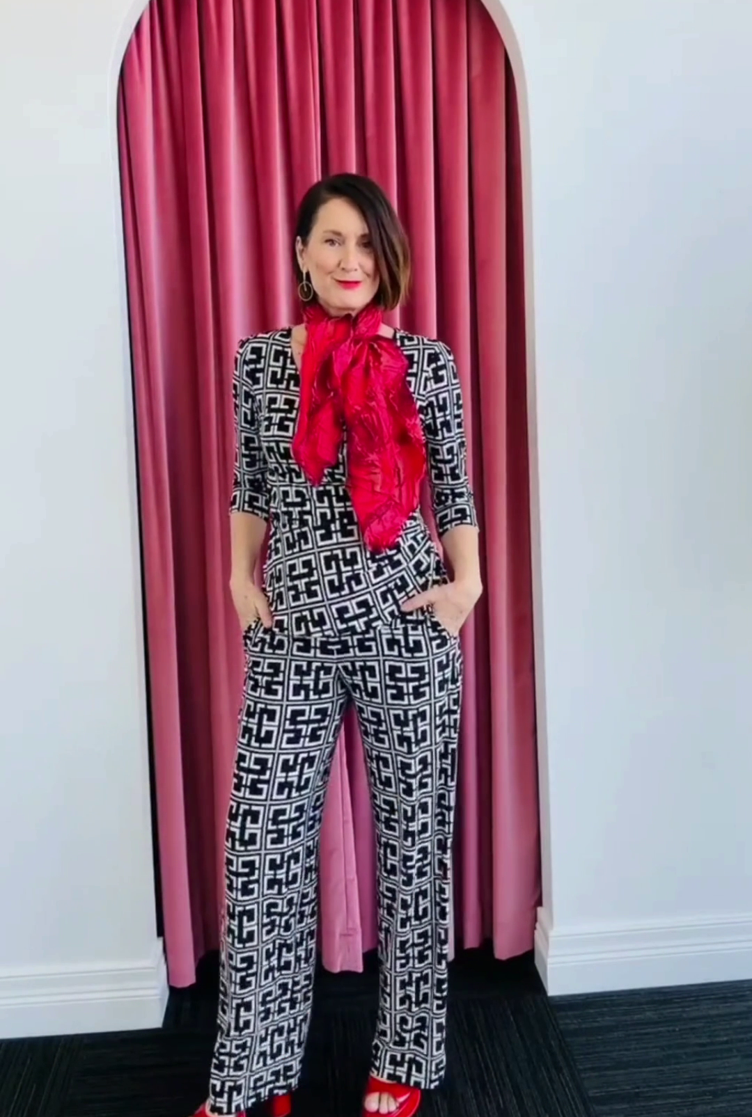 Woman in a bright pink outfit standing in a room with a wooden cabinet and large window.