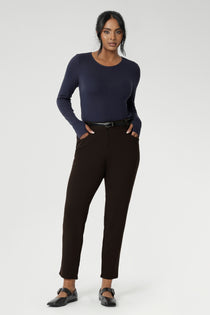 The right fit is key when choosing between women’s office pants and work skirts. Our Drew Pant offers a flattering slim leg with a tapered ankle, ideal for clean lines and versatility. Prefer a bit more balance? The Corbin Pant features a subtle bootleg shape that elongates the leg and enhances movement. Both styles are high-waisted pants designed to define the waist and support your midsection. If you lean toward straight leg pants for women, ensure the hem hits just above your shoe for a sleek finish—longer for heels, slightly cropped for flats.