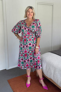 The Esha Dress is a standout of the season — elegant, feminine, and designed for effortless wear. Featuring a soft wrap-style bodice that ties at the back, a full-coverage skirt, and ¾ elasticated sleeves, it blends timeless style with functional details like pockets and machine-washable silk. The White Lotus print adds a serene, modern edge, making it the perfect choice for spring events or polished daytime dressing.