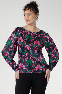 To complete her edit, Rosalinda showcases the Zara Top in Garden Fantasia, styled with the Bootleg Pant in Wine and the Dany Culotte in Navy. With a balloon sleeve, light shoulder gathers, and a classic boat neckline, the Zara balances structure and softness perfectly. The deep Wine hue grounds the playful floral, proving that colour can be both bold and timeless.