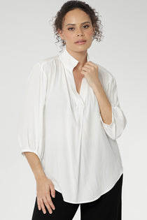Perfect with jeans and casual pants, this elegant blouse adds polish to off-duty looks. Wear for the office with workwear suiting and let the tailored touches elevate and empower. The front pleat gives a stylish alternative to button-down shirts, and features beautifully under open jackets.