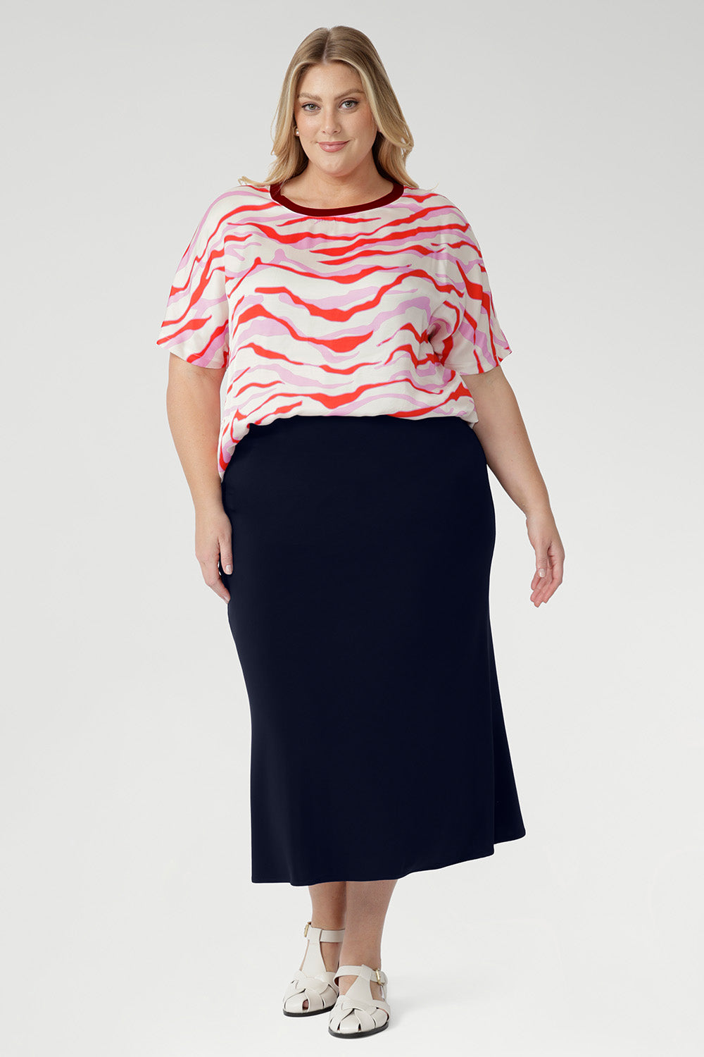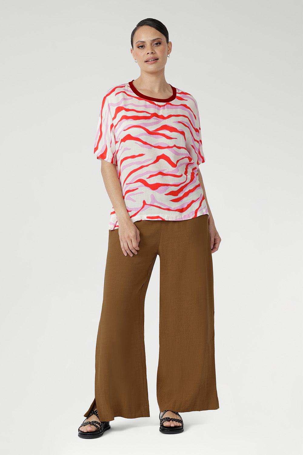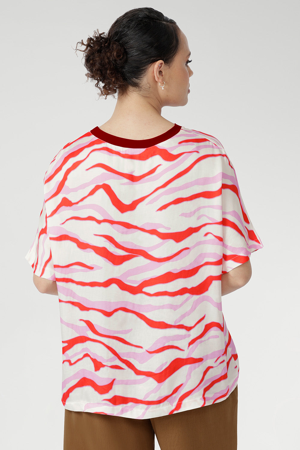 Crafted from premium Italian Viscose Sateen, the Scout Tee in Pink Tang is a lightweight essential made for effortless everyday wear. Designed with grown-on sleeves, a round neckline, and a straight hem, it offers a relaxed yet refined fit that flatters every shape. The Pink Tang print brings an artistic touch of colour and modernity to a timeless silhouette—perfect for pairing with tailored pants or casual denim. Made in Australia with integrity.
