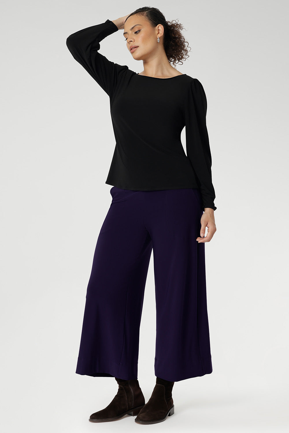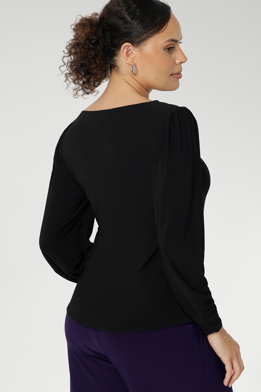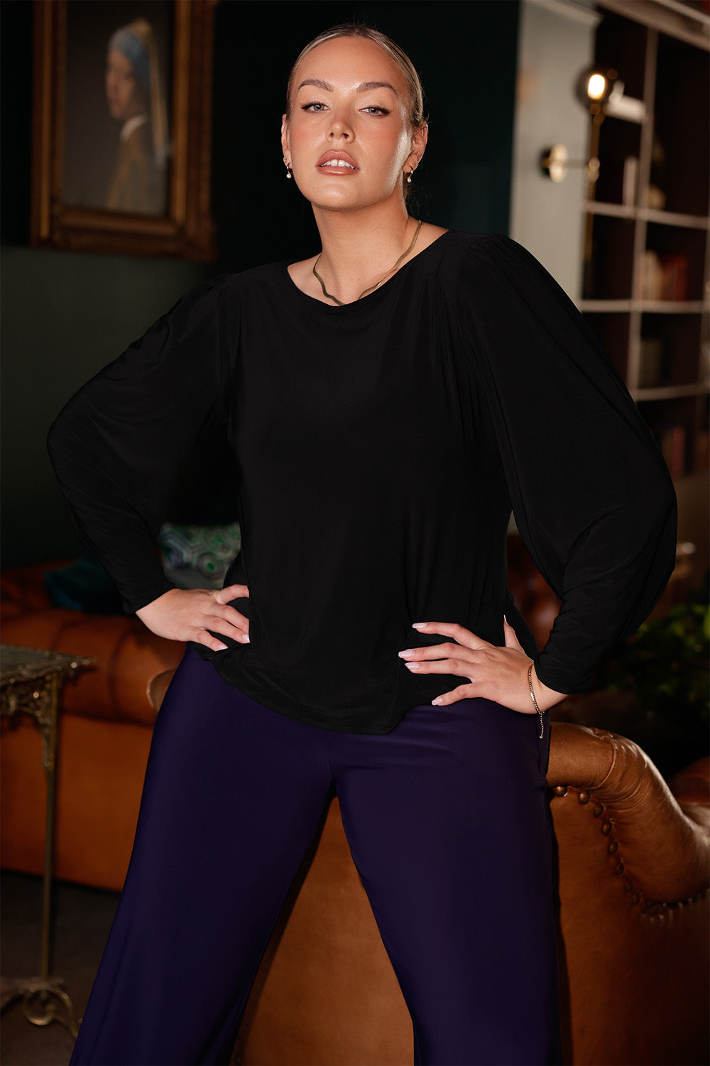 The Zara top in black jersey is classy with her lovely floaty sleeves and a stylish boat neckline. Also love the straight hemline. Perfect LB top to dress up or wear casual.