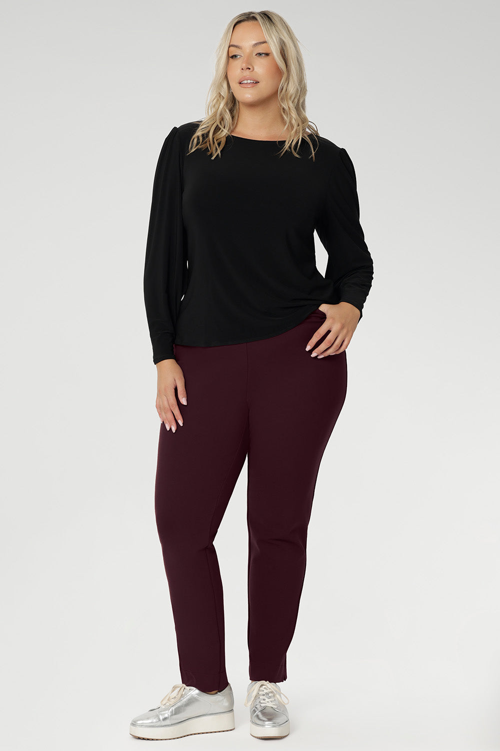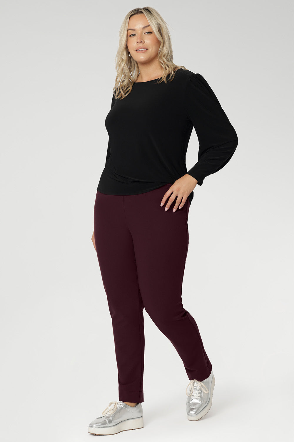 Beautiful colour, fabric and cut. This is a gorgeous, classy top. The Claret colour goes perfectly with the Peacock Asher skirt.
