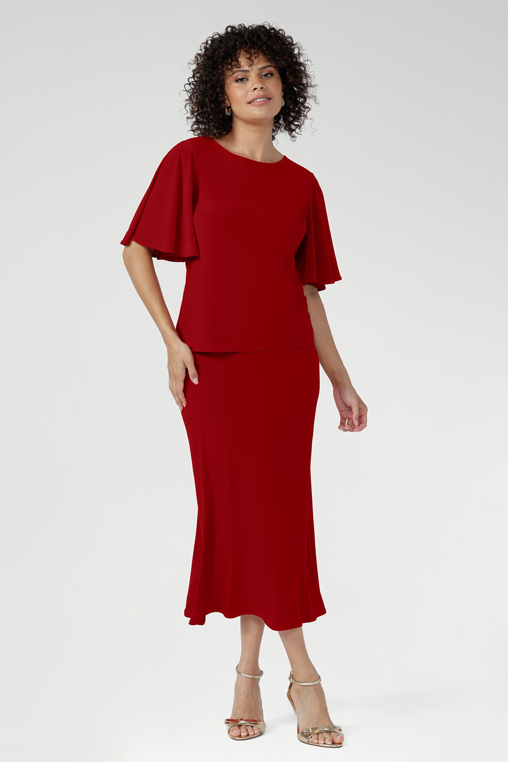 Chloe is a statement piece that feels very luxe to wear. Her shape is slightly more fitted than most of our other tops. She had a double layer front and back bodice with bust darts and a straight hemline. Her flutter sleeves sit at an above elbow length and have a sense of occasion.