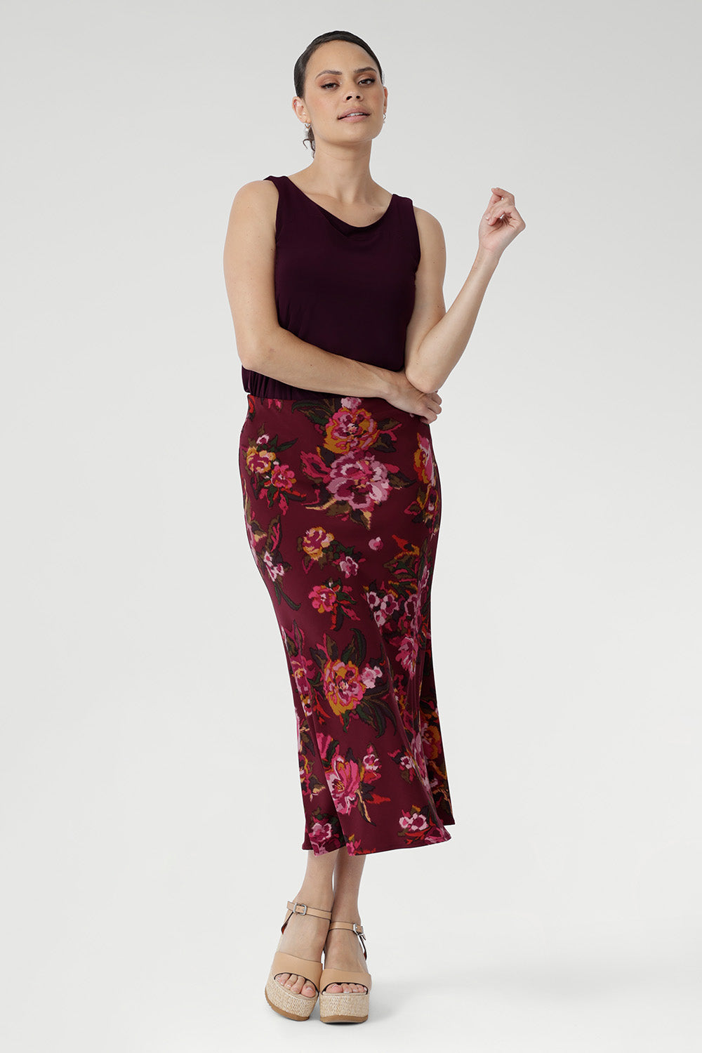 • Bias-cut pull-on skirt with internal elastic at the waist
