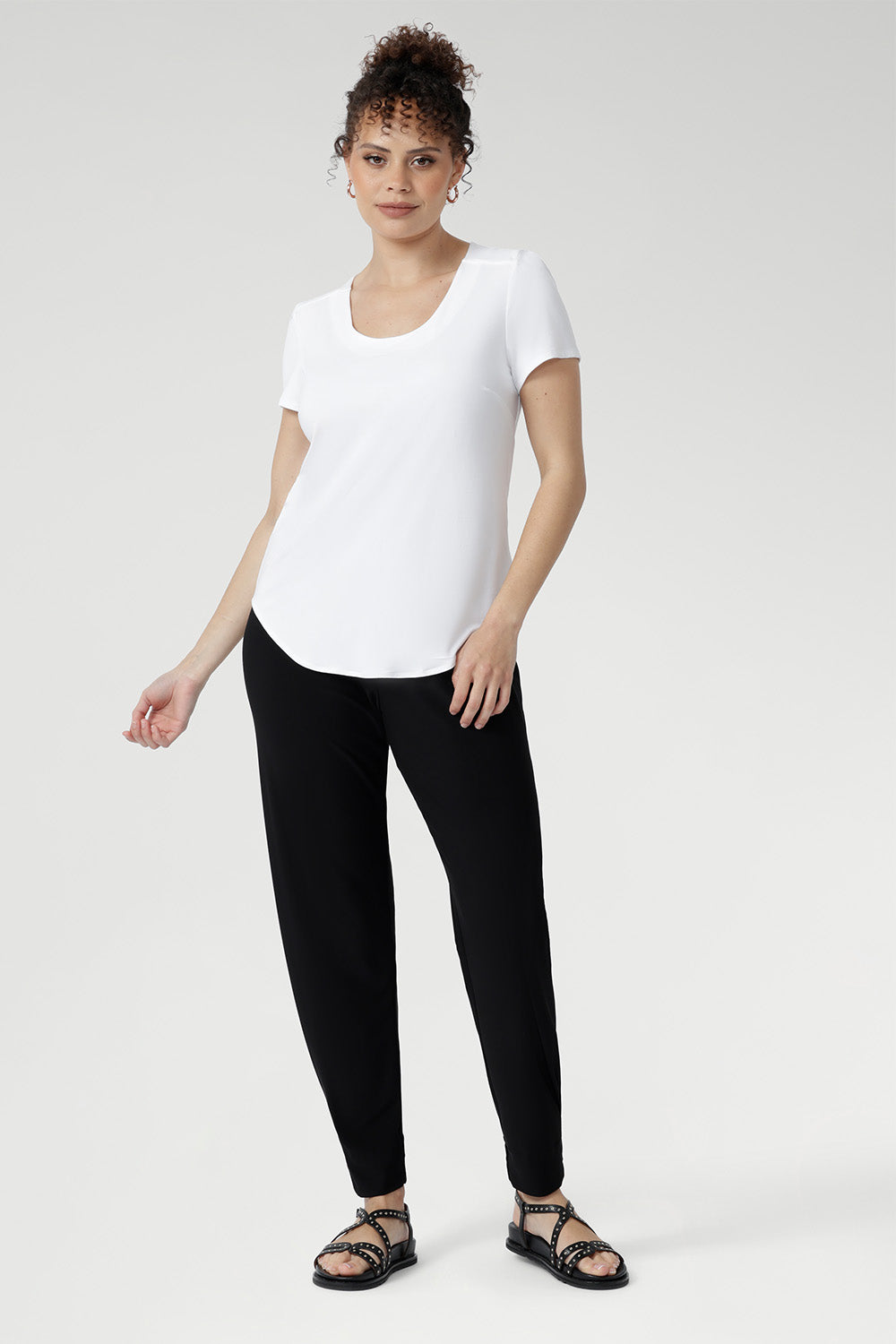 Crafted from our bamboo jersey, the Sawyer Top in White Bamboo is an easy-wear top for both smart and casual occasions, featuring a round neckline, short fitted sleeves, and a shirttail hem. Works brilliantly as a layering piece and is the ultimate travel essential.