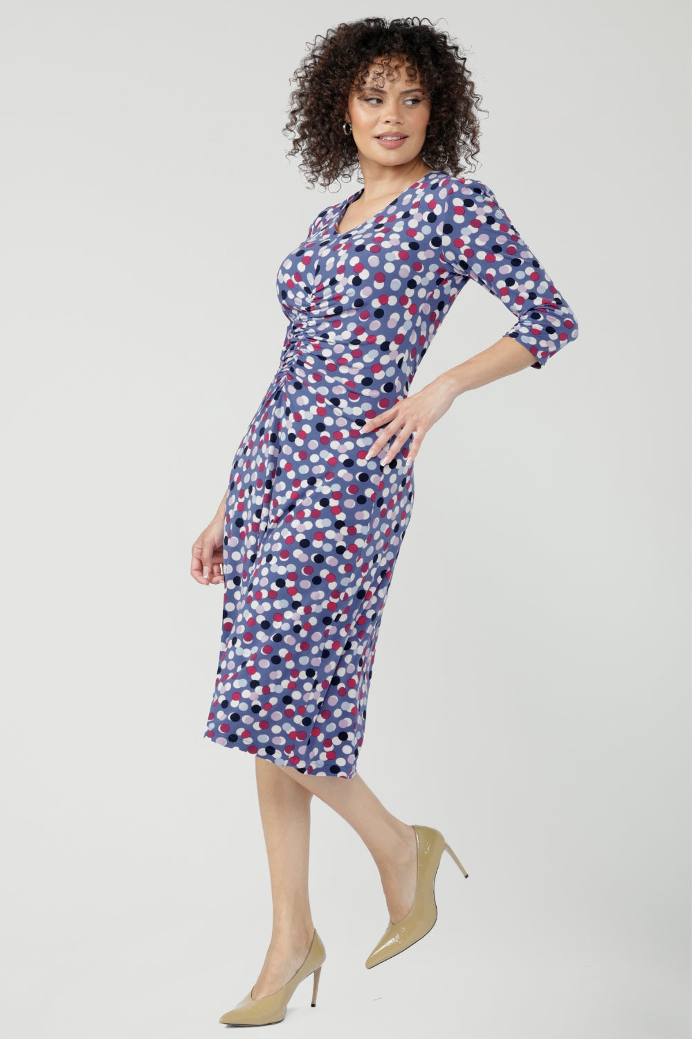 This dress is very flattering on the curvy figure. It sits and falls nicely particularly when walking it has a beautiful flow with the figure. Very classy style. Recommend this dress and will be wearing often. A to go to style