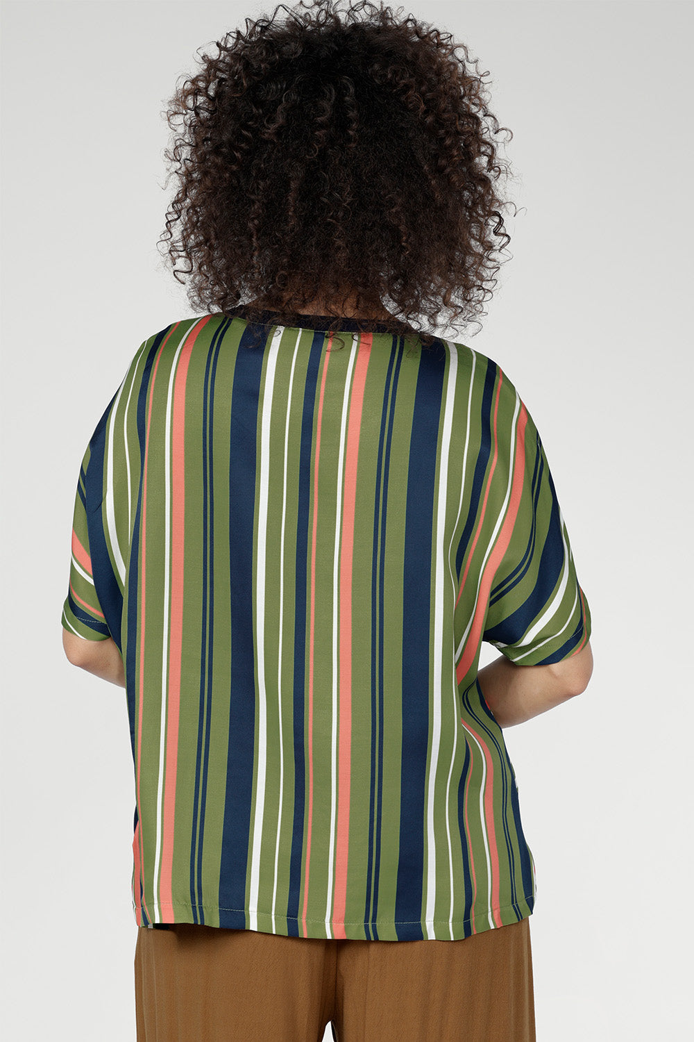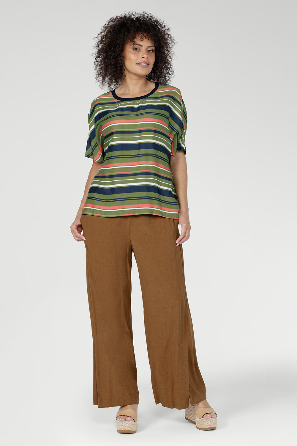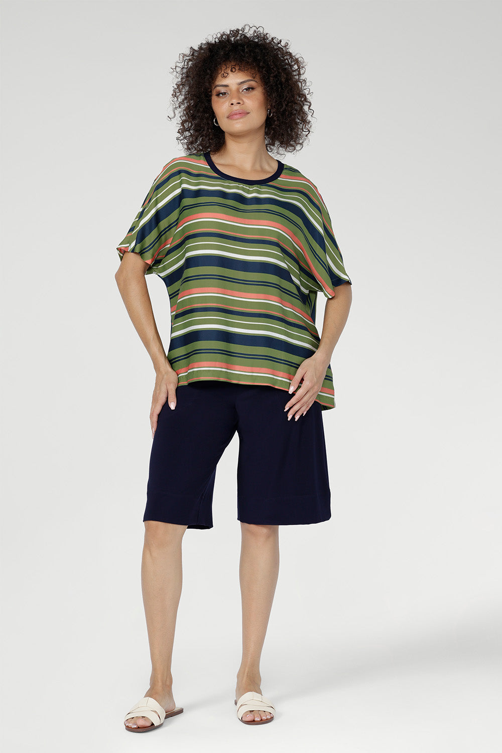 Crafted from premium Italian Viscose, the Scout Tee is a lightweight striped tee for effortless everyday wear. Silky on the skin, it features grown-on sleeves and a softly bound round neckline. The Green Multi Stripe blends olive, coral, ivory and navy for a fresh finish. Made in Australia with integrity.