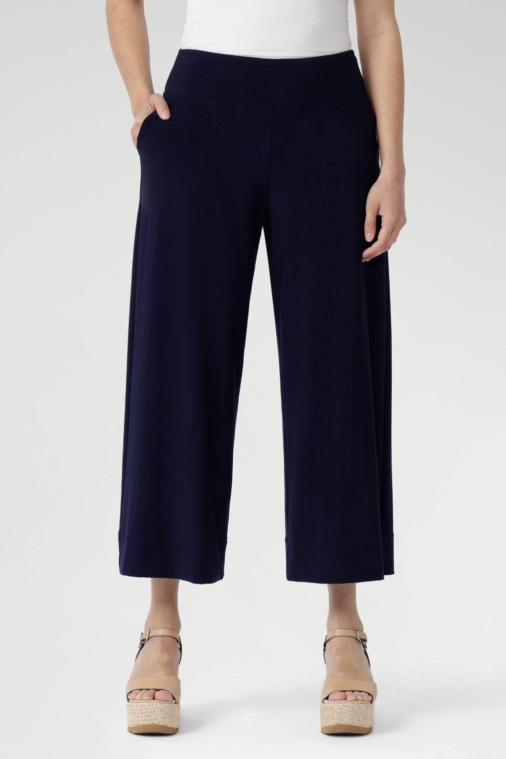 • Extra-wide leg (extreme culotte flare), roomy feel