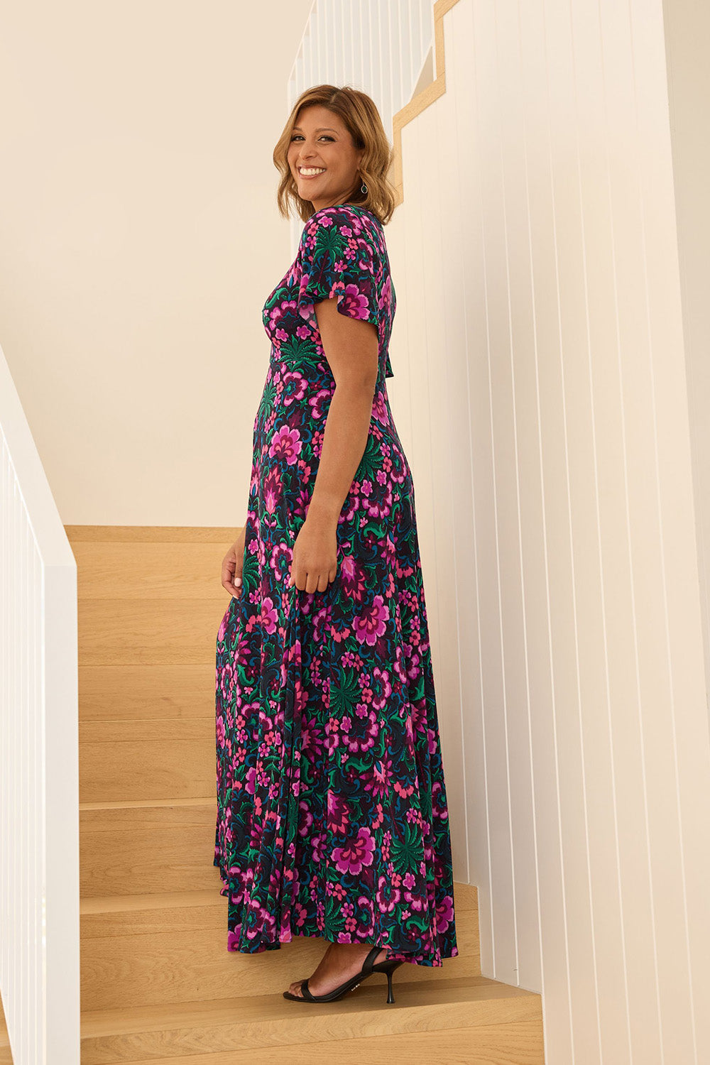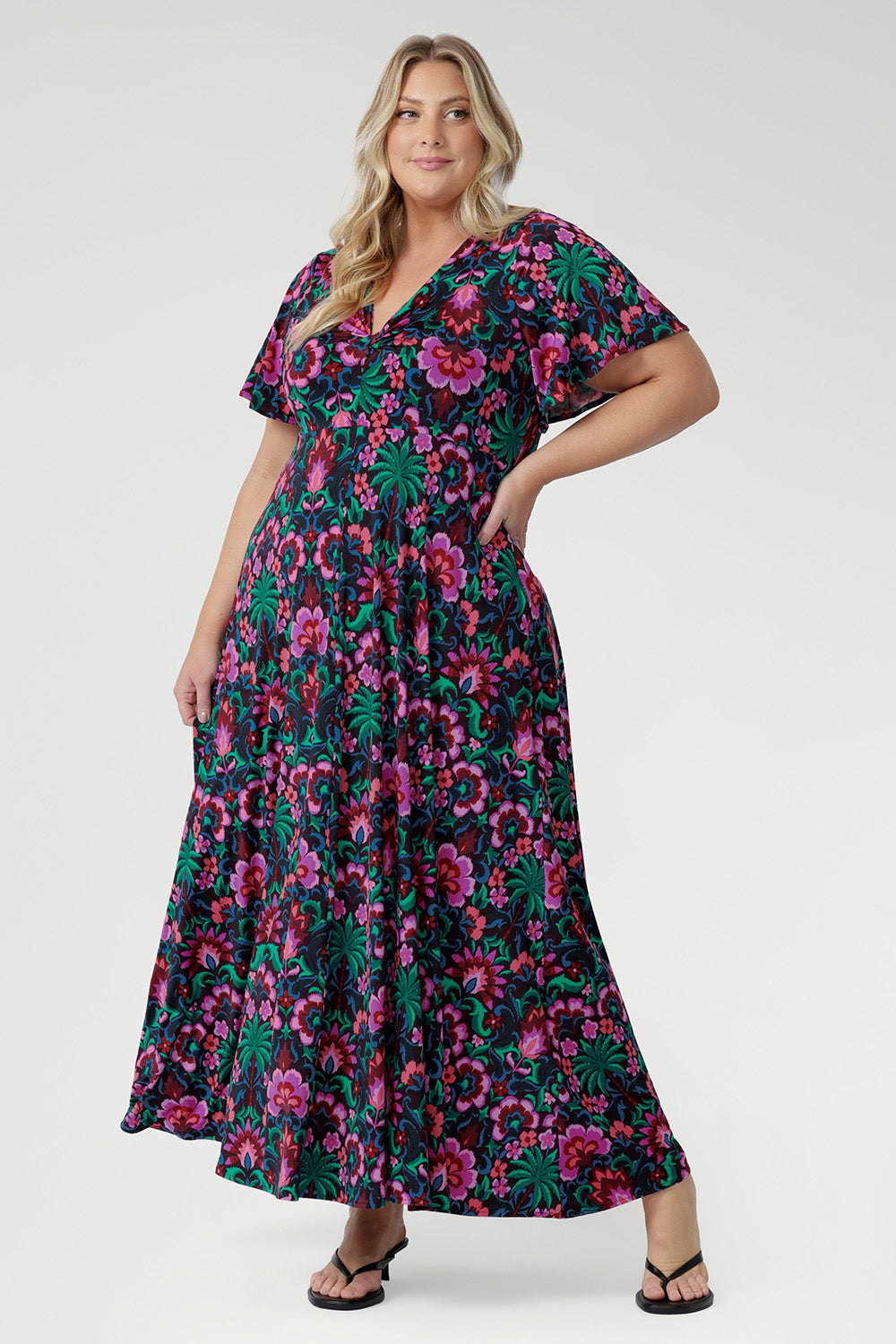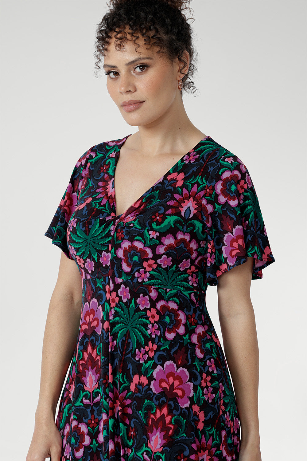 Crafted from our signature slinky jersey with a cool touch and soft stretch, the Paloma Maxi Dress in Garden Fantasia flatters with its empire line silhouette and soft twist detail at the V-neck. Showcasing a vibrant botanical print on a dark chocolate base, it features flutter sleeves, a double-layered bodice, and full lining. Perfect for garden parties, events, or weddings, this standout maxi brings effortless elegance and a swoosh-worthy finish.