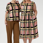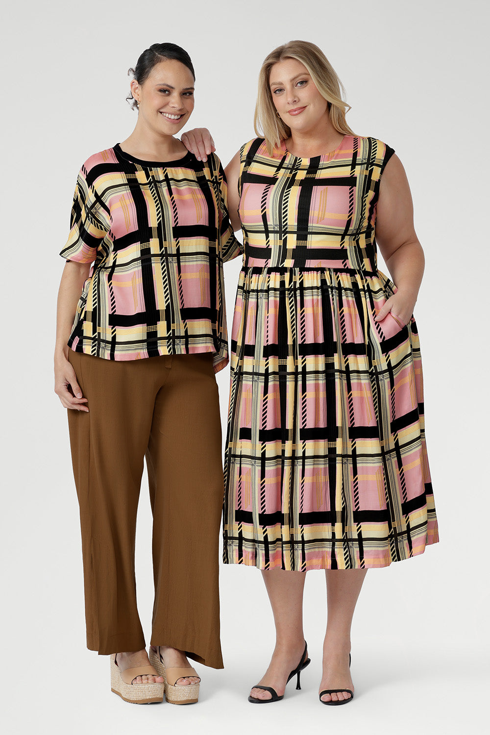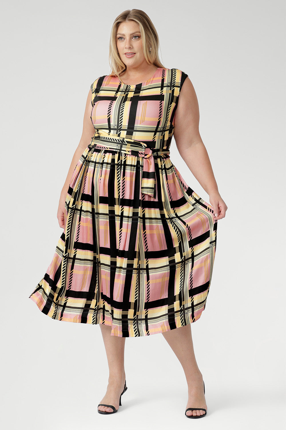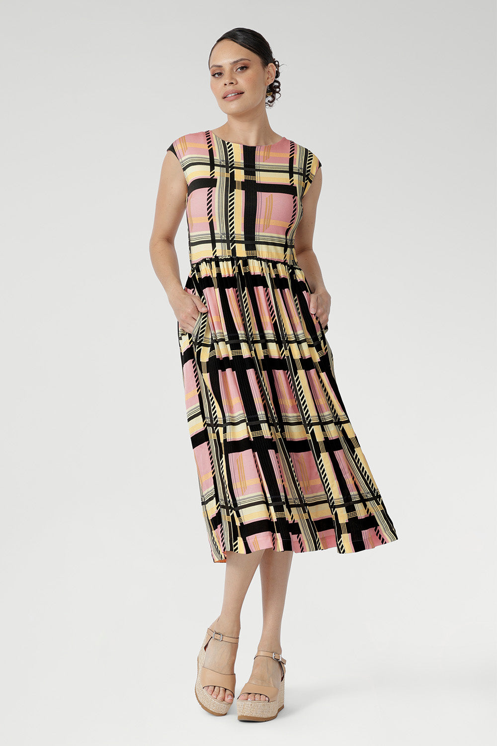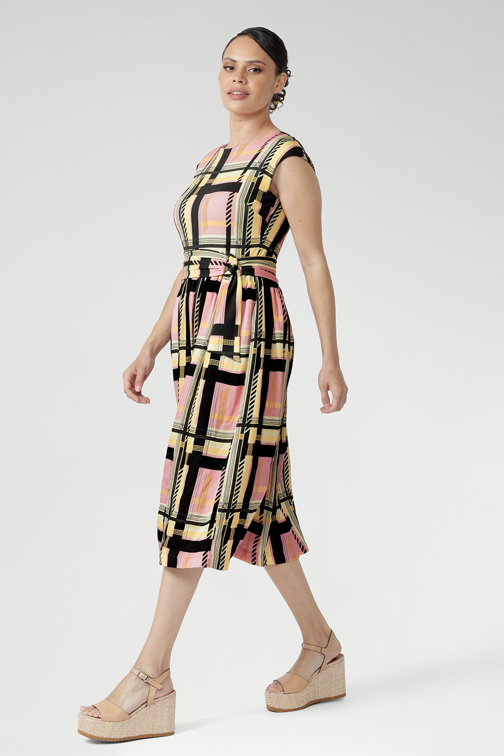 Crafted from breathable natural fibres, the Misha Dress in Pastel Plaid with Belt captures effortless elegance for warm summer days. Designed in a flattering midi length, it features a sleeveless round-neck bodice and a softly gathered A-line skirt with practical side pockets. The delicate pastel plaid print adds a fresh, feminine touch with timeless appeal. Finished with a coordinating belt to define the waist, this lightweight dress moves easily from everyday wear to relaxed occasions. Made in Australia with integrity.