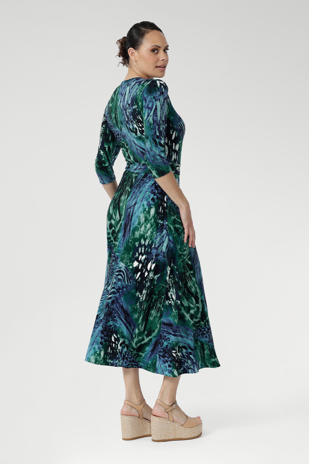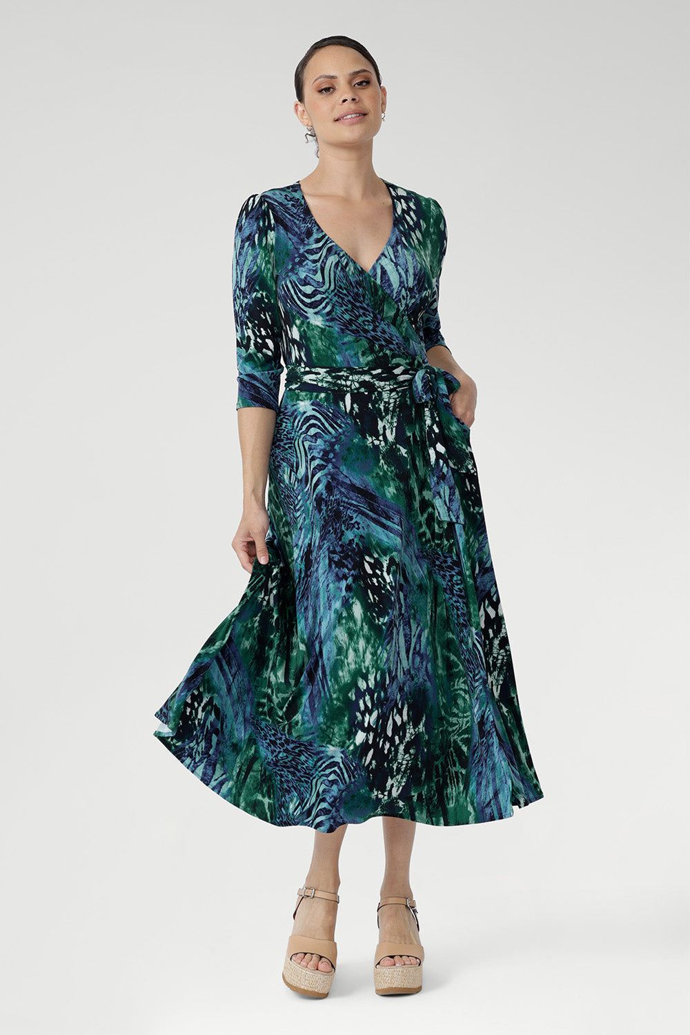 Crafted from our signature dry touch stretch jersey fabric, the Fiona Dress is a chic, functioning wrap dress with a soft A-line skirt, flattering V-neckline, and 3/4 length sleeves. It’s designed with comfort, elegance and movement in mind.