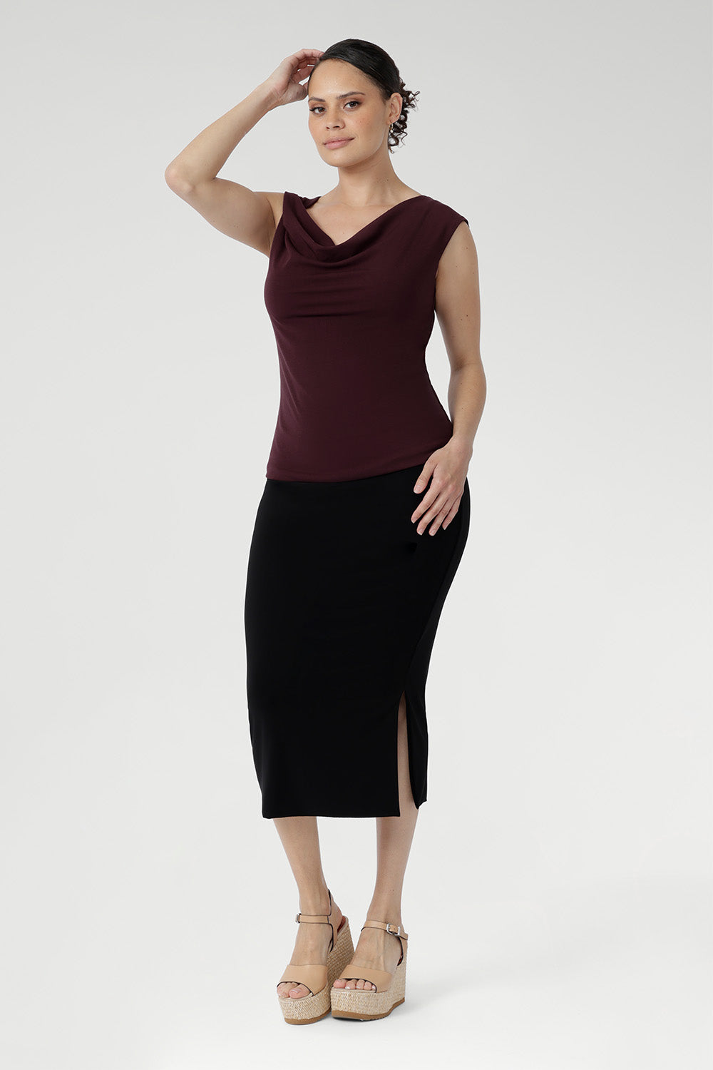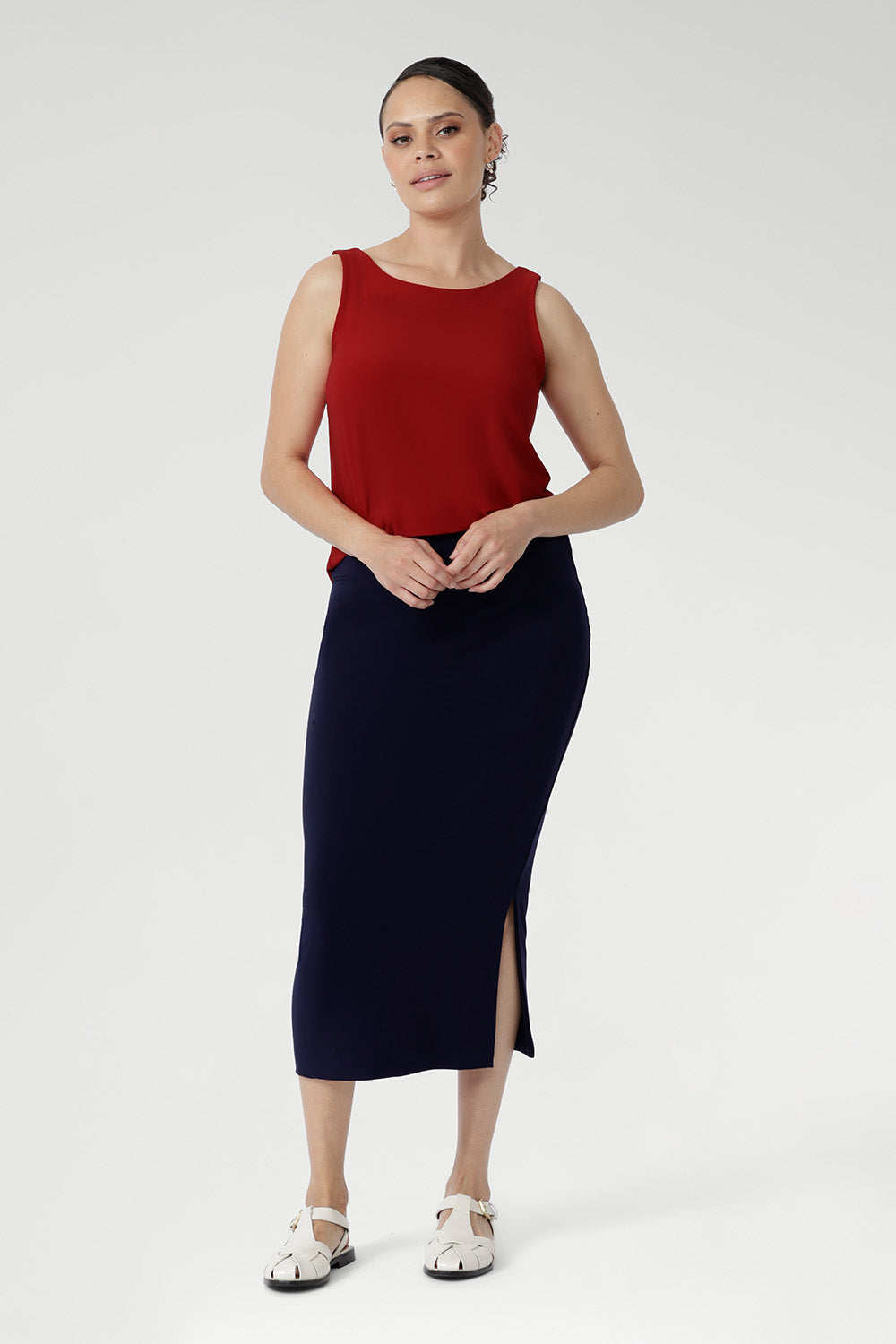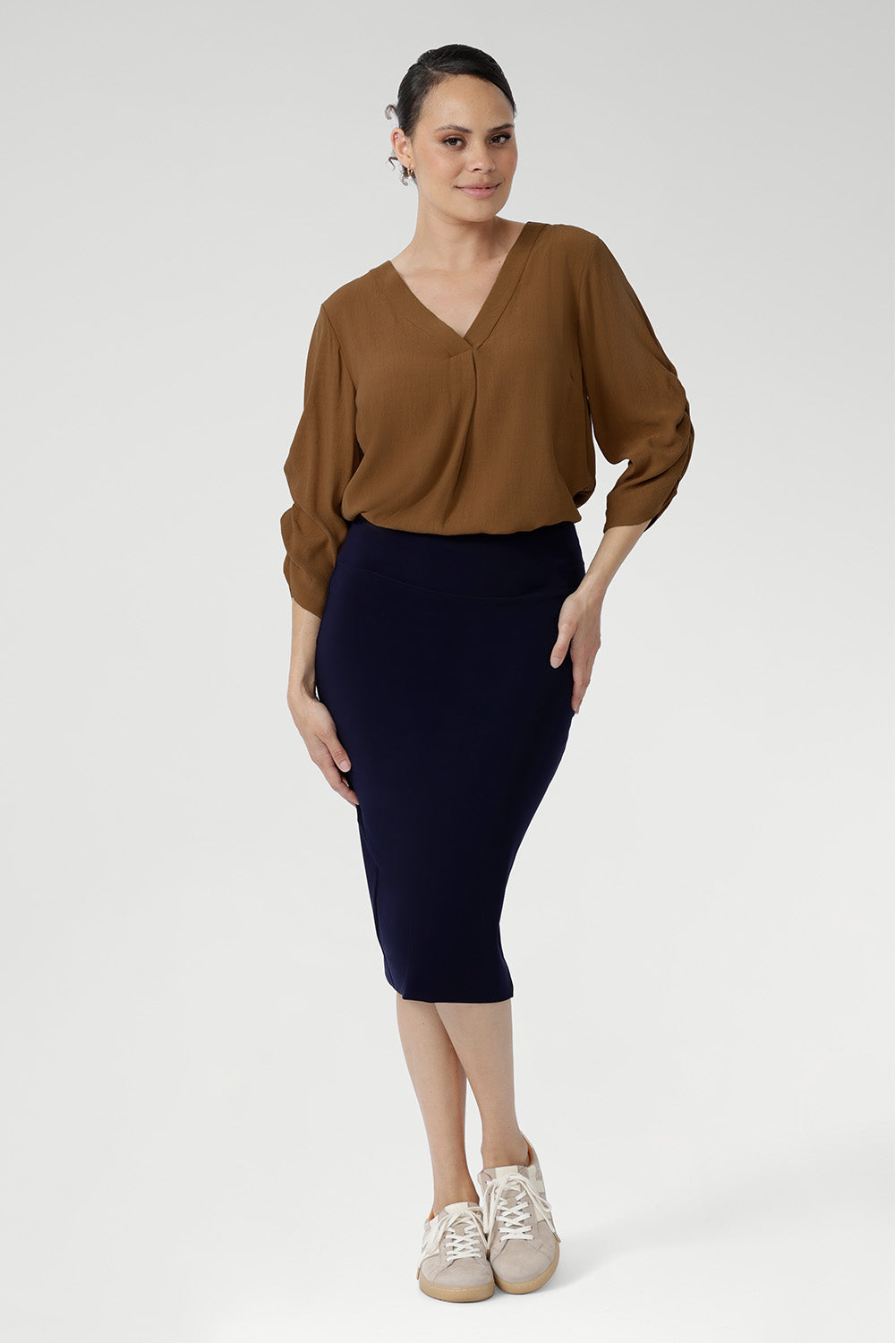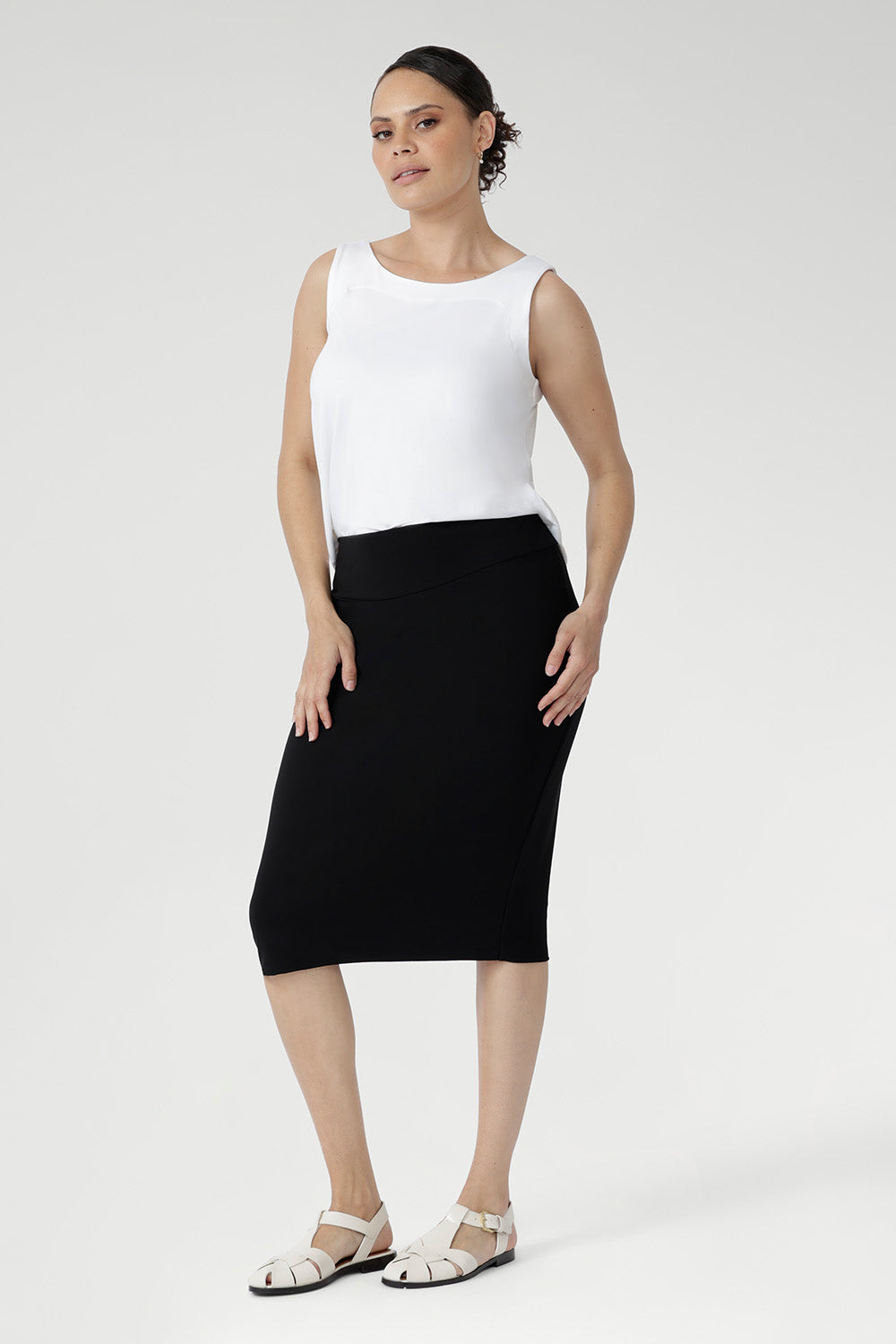From office days to weekend catch-ups, our black pencil skirt or navy pencil skirt is the perfect base to build on. Pair it with our work jackets or work tops for a polished office look, or explore our new arrivals for fresh outfit updates. Wondering if you can wear a pencil skirt with a tummy? Absolutely. Opt for a high waist pencil skirt in a heavier jersey for a smooth, flattering fit, and pair it with a softly draped blouse to balance proportions. We offer express shipping across Australia, with delivery to New Zealand too, plus easy payment options like Afterpay and PayPal—because great style should always be effortless.