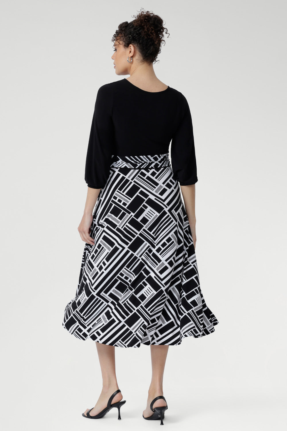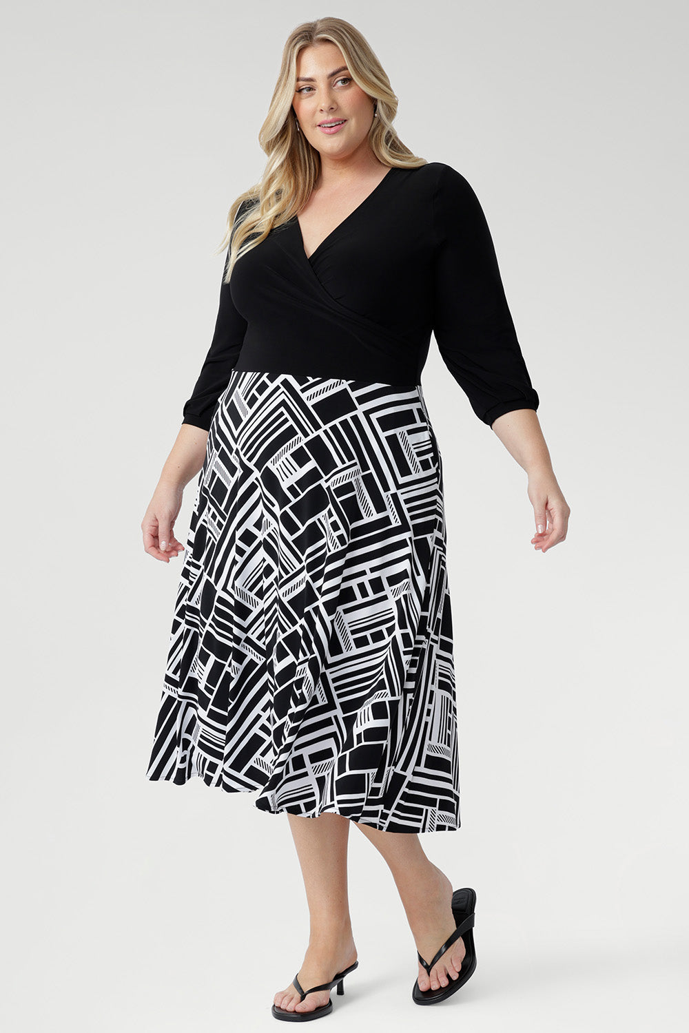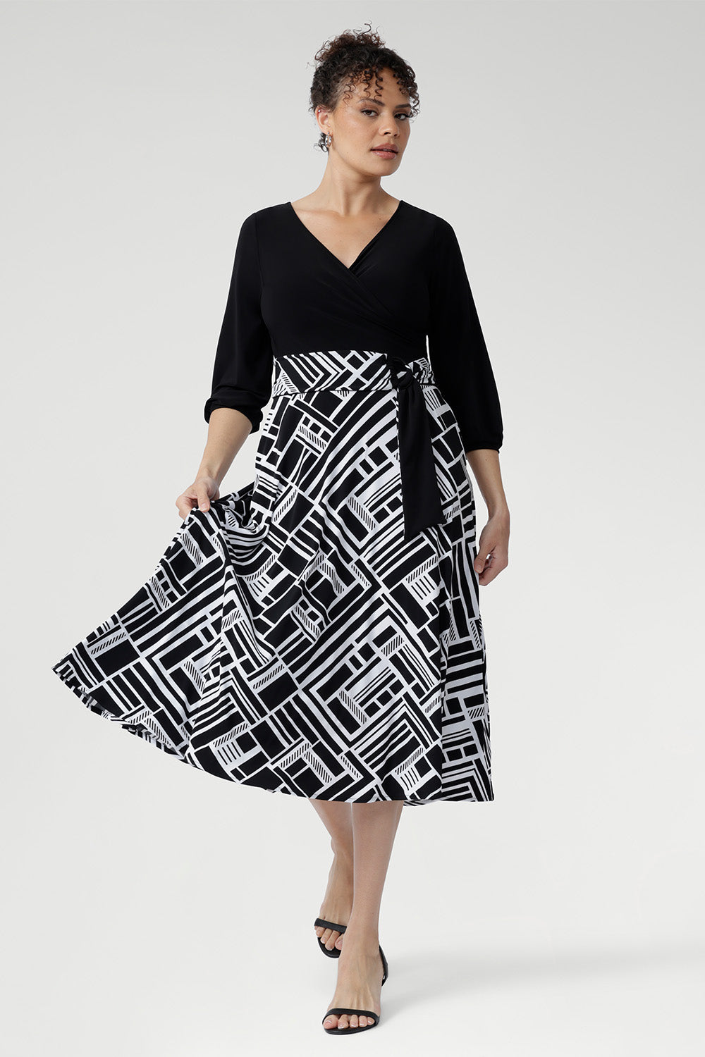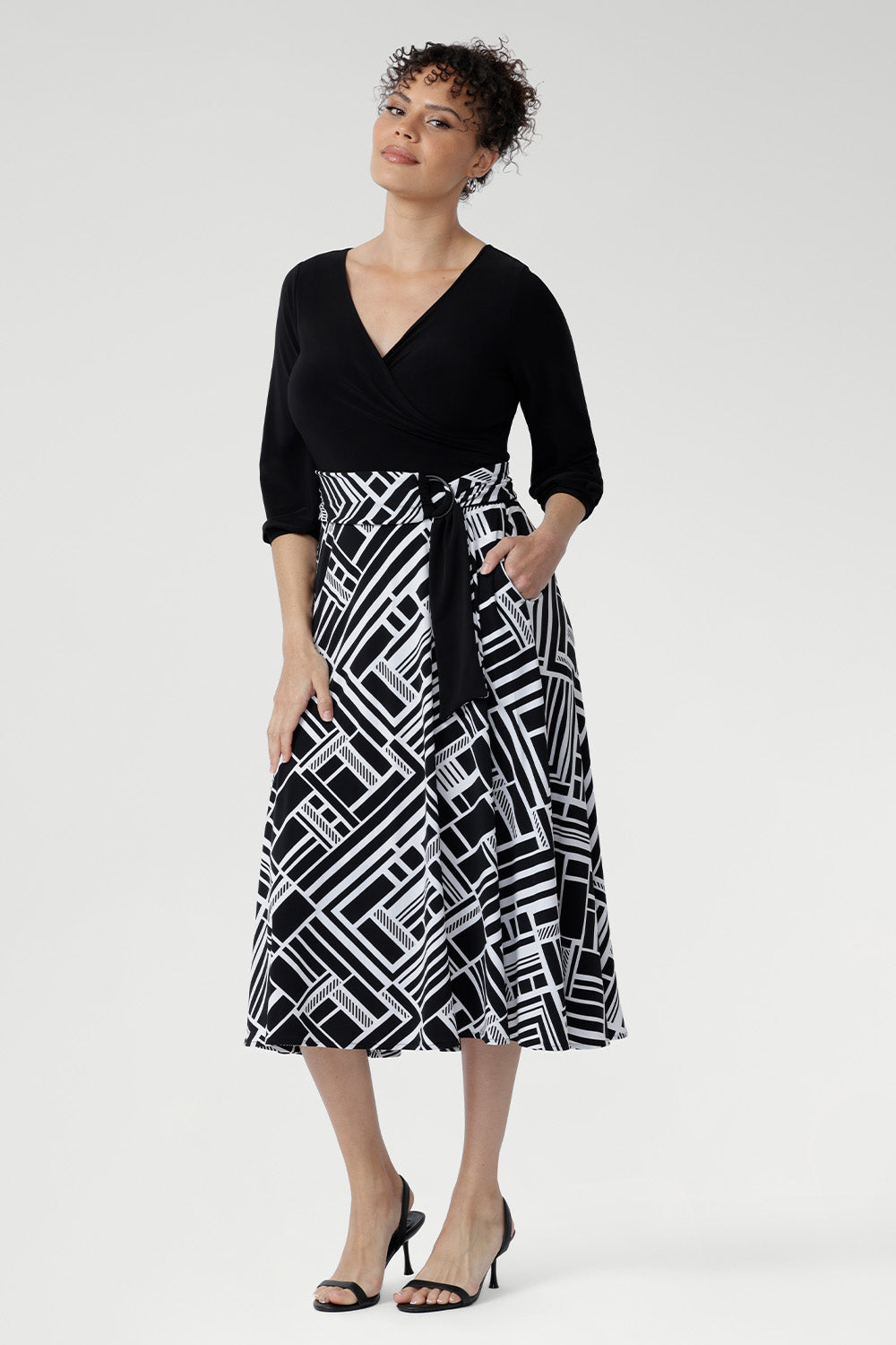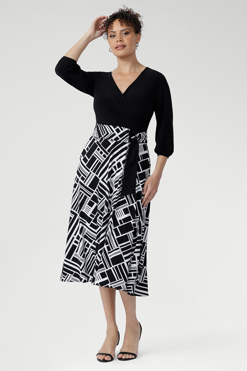 Crafted from our signature dry-touch stretch jersey, the Nerida Dress in Moderno is a fixed wrap dress with a flattering fit-and-flare silhouette, designed to define the waist and offer versatile styling with its removable two-sided D-ring belt. Featuring a classic wrap front, ¾ sleeves with a pleat at the cuff, and a fully lined back bodice and skirt with convenient side pockets. Perfect for workdays, special occasions, or weekend outings.
