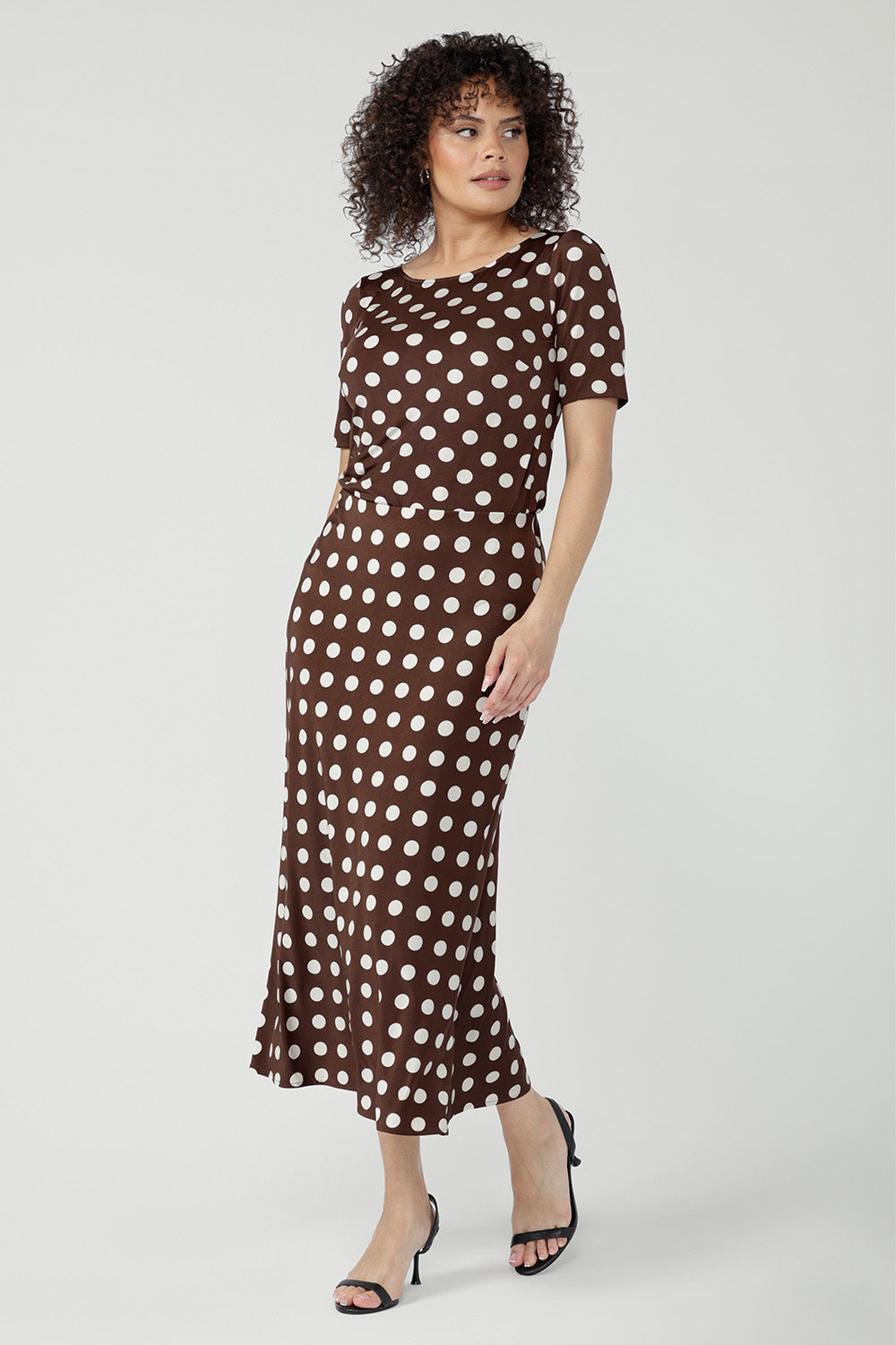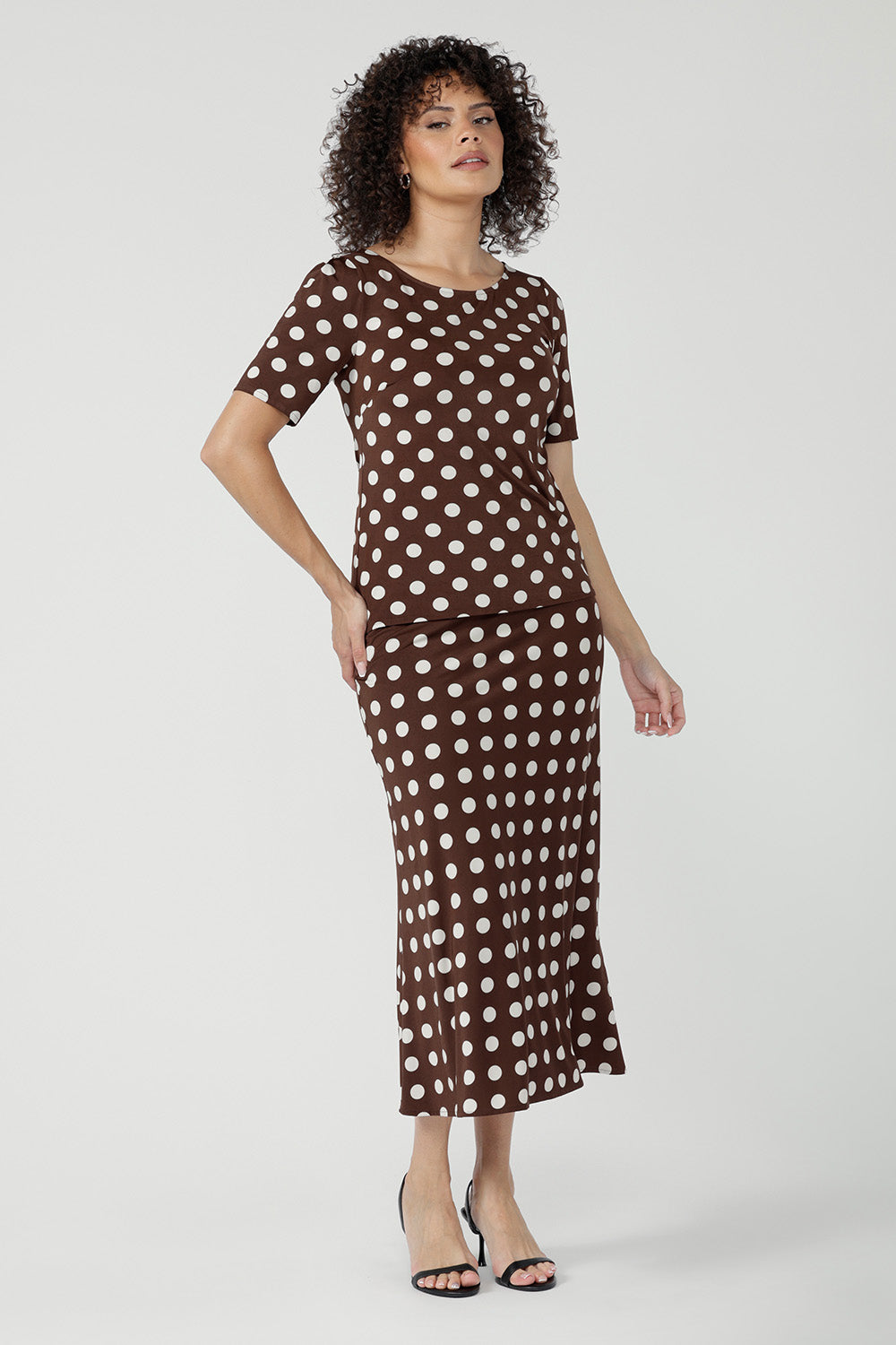 Crafted from slinky jersey fabric, the Asher Skirt in Choc Spot offers a comfortable, streamlined fit with an easy pull-on, elasticated waist, and a refined A-line shape. Designed with comfort and movement in mind, Asher is perfect for effortless styling from work to weekend. Proudly designed and made in Australia.