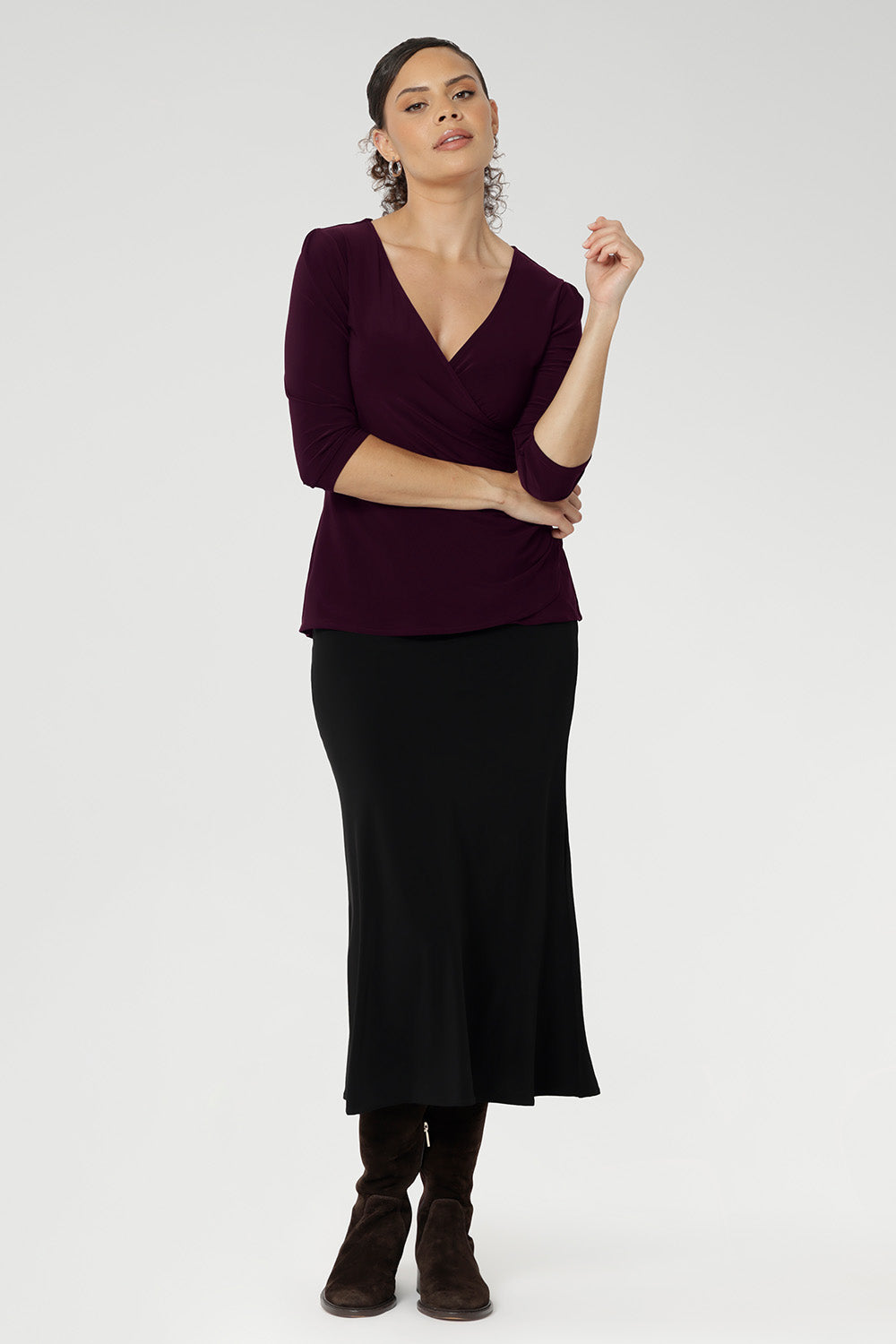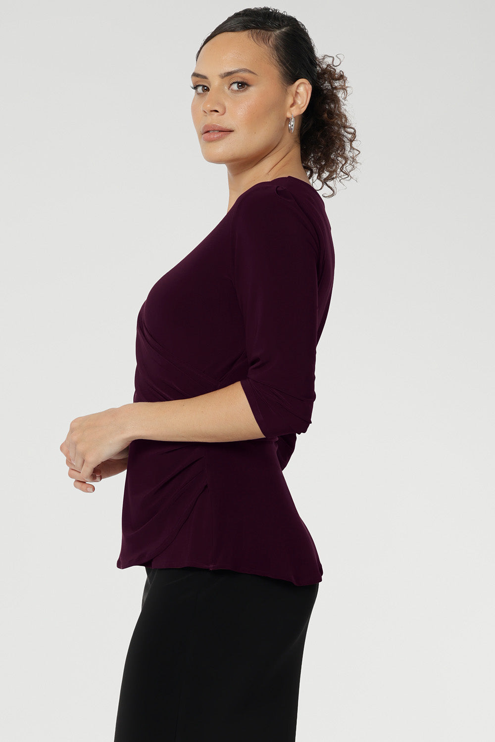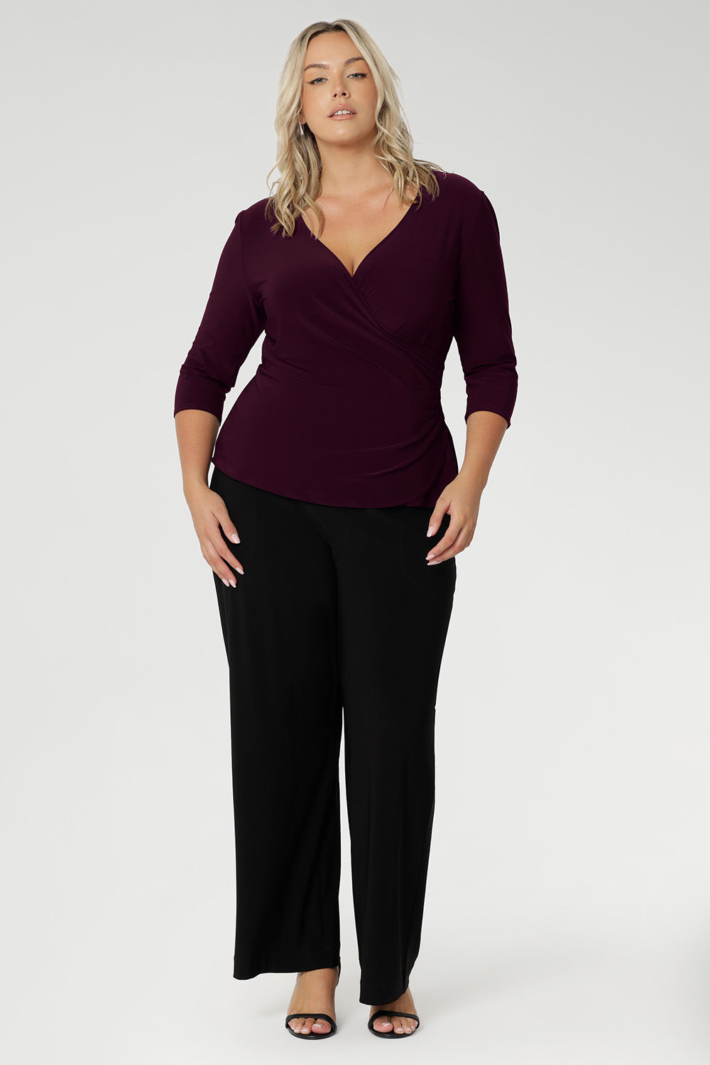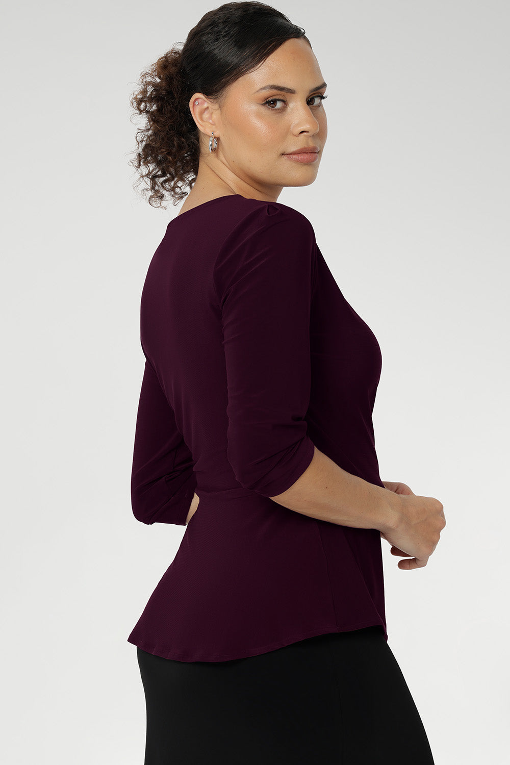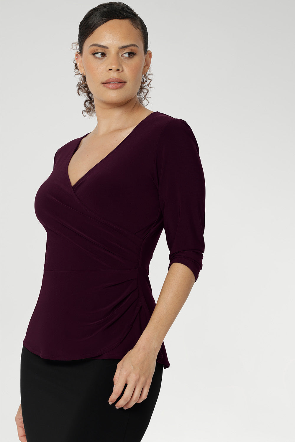 Crafted from our signature dry-touch stretch jersey, the Kyle Top is designed with professional style and all-day comfort in mind. Featuring a wrap bodice, 3/4 length sleeves, and a soft peplum waist seam that adds sophistication, and can be tucked into high-waist pants for a different look. Proudly designed and made in Australia.