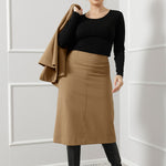 Introducing the new Landry Skirt, a refined addition to your wardrobe, expertly crafted from a caramel ponte fabric.