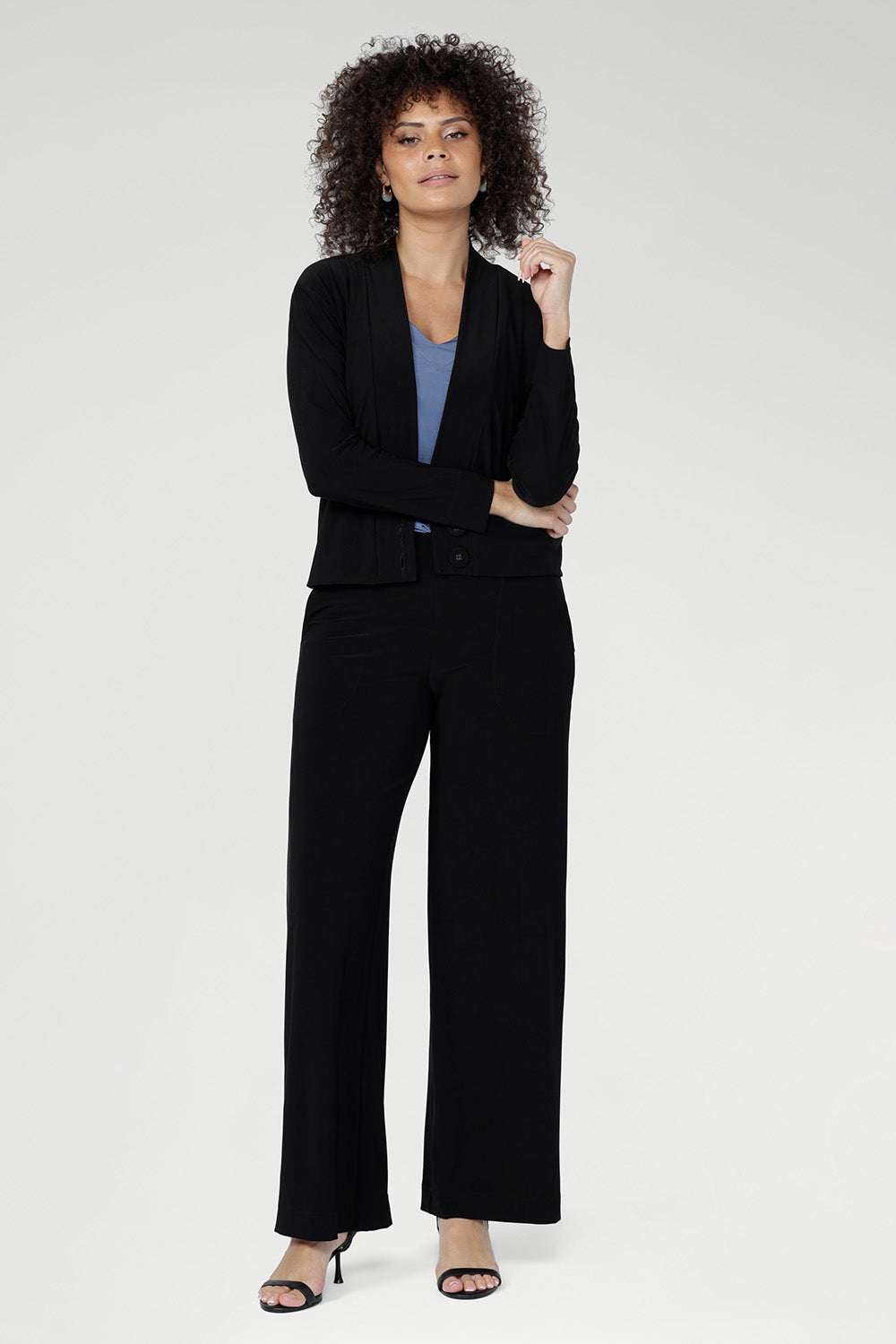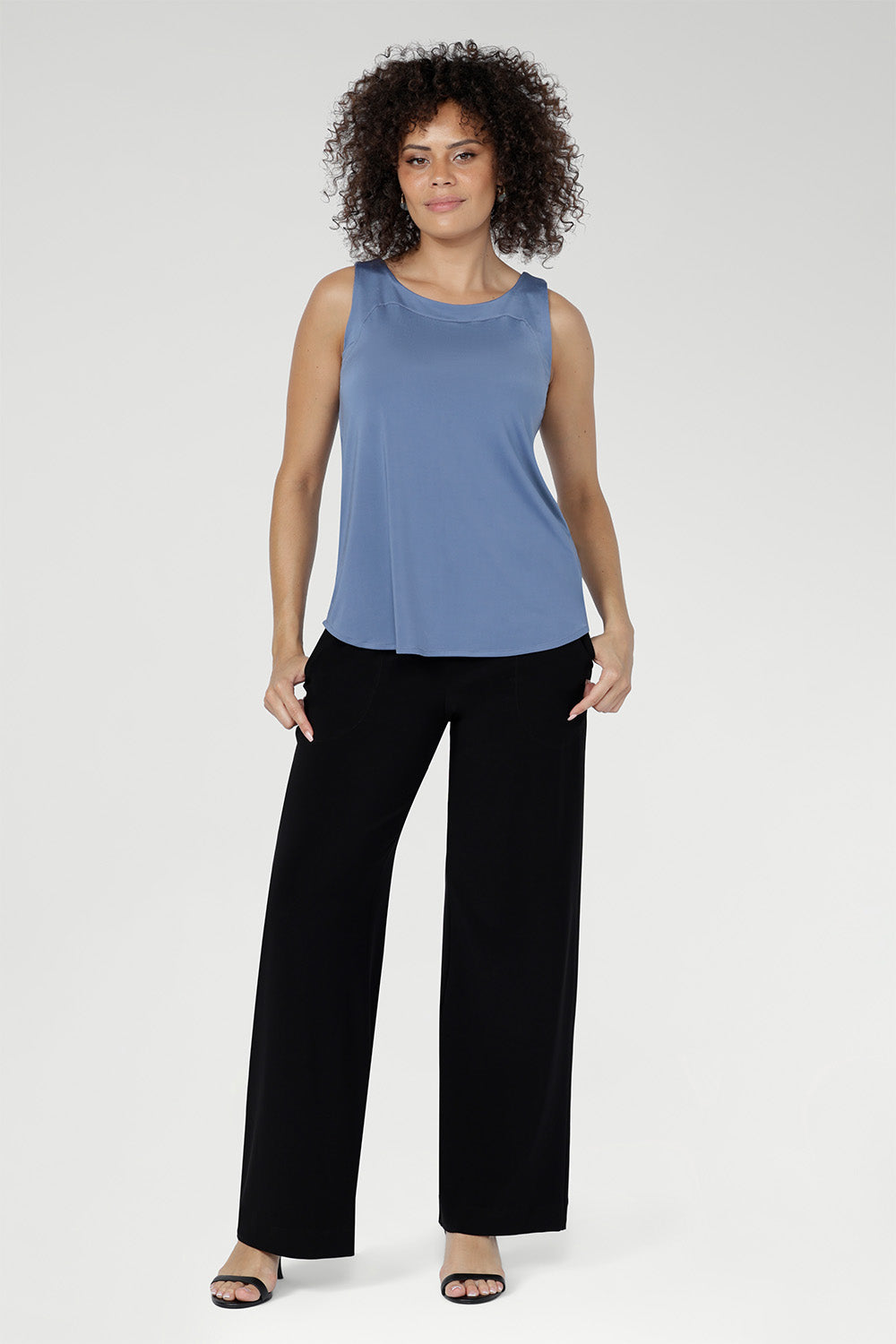 Crafted from soft, slinky stretch jersey, the Harlee Reversible Cami in Slate Blue is a versatile everyday base layer. Close to the body with gentle stretch, it features bust darts and a clever reversible necklineâwear as a clean boat neck or flip to a flattering V-neck. Made in Australia with integrity.