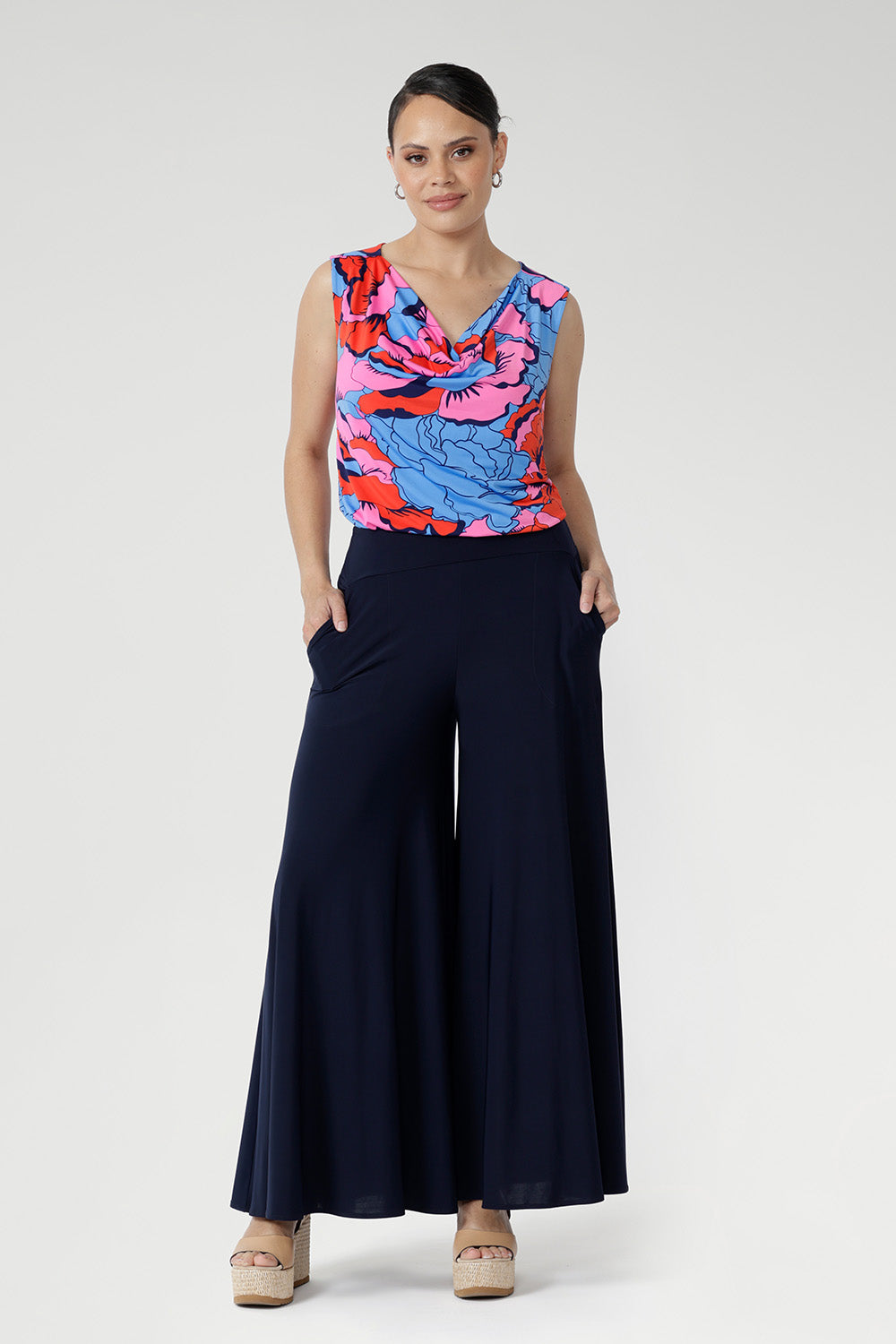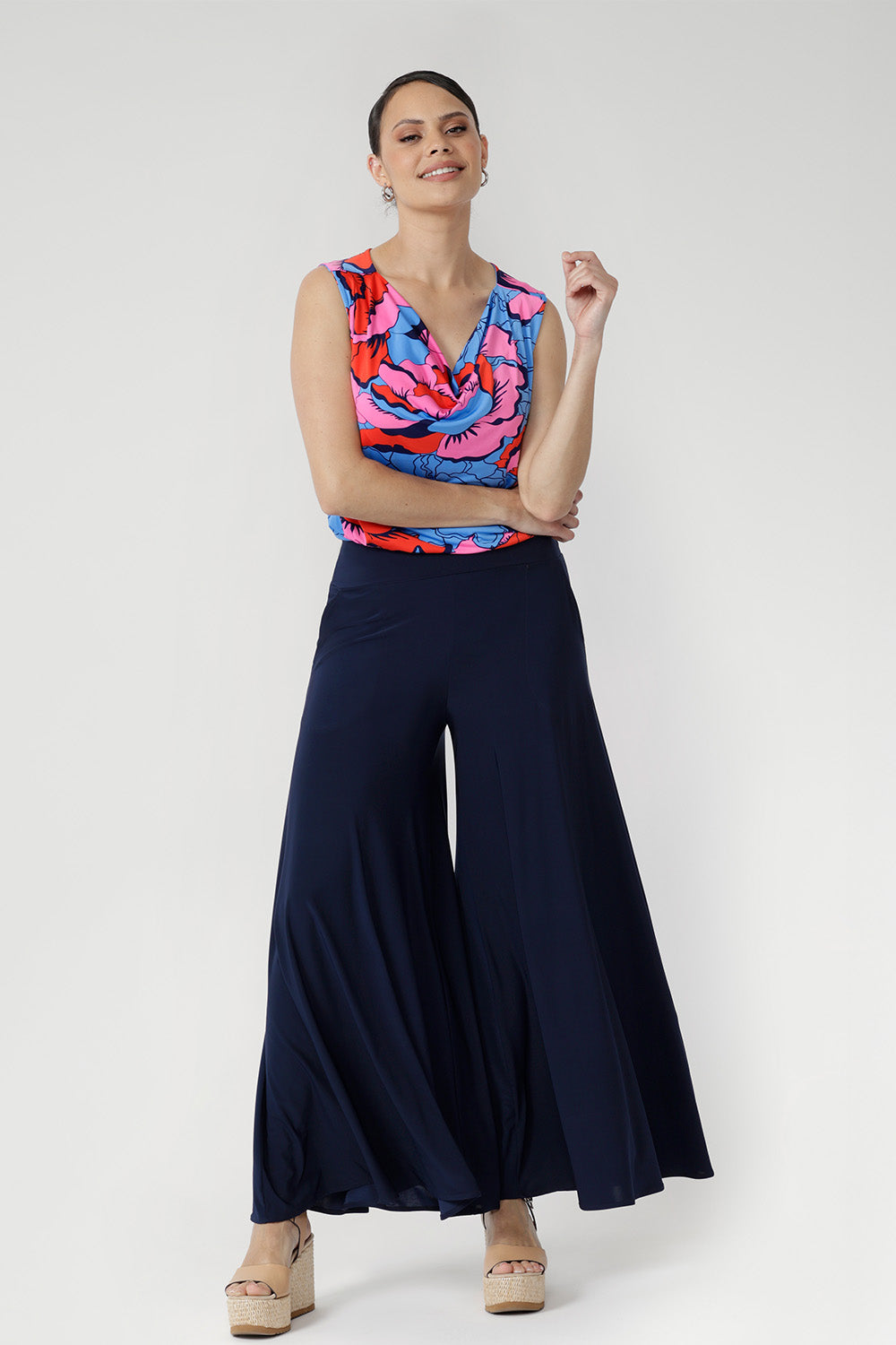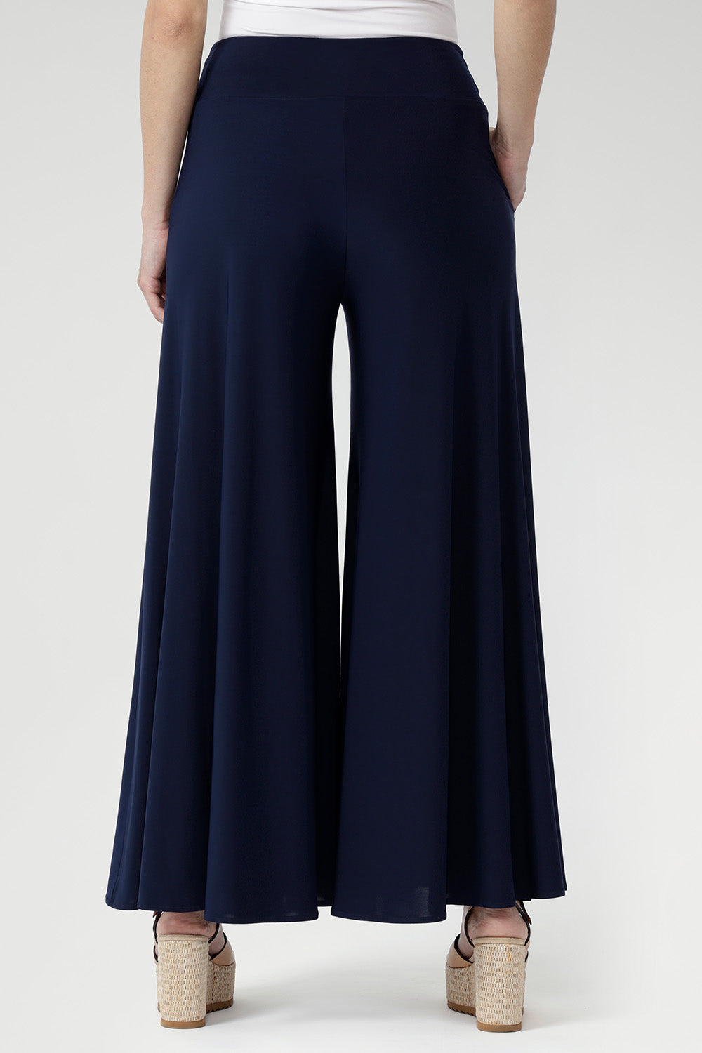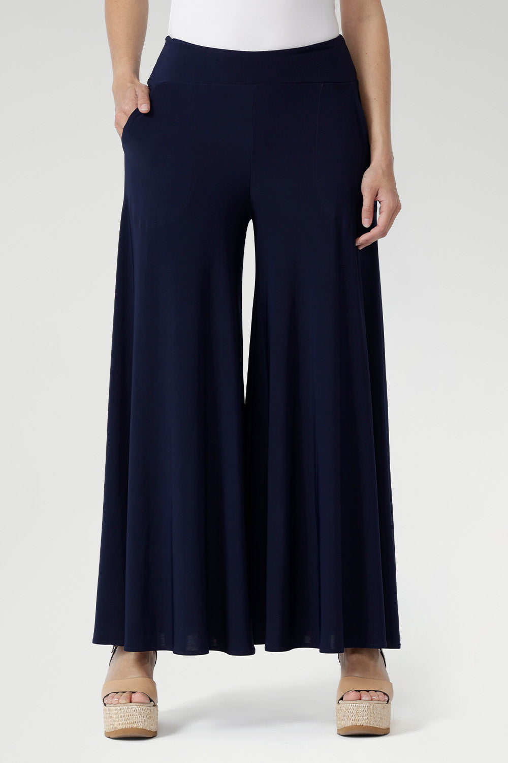 Crafted from slinky stretch jersey, the Caspian Palazzo Pant in Dark Navy is your go-to for relaxed sophistication. Designed for comfort and movement, it features a fluid wide-leg silhouette, double-layer waistband, and handy side pockets. The deep navy hue adds timeless appeal to your resort or travel wardrobe. Lightweight and wrinkle-resistant, these jersey pants are perfect for jet-setting or laid-back weekends. Pair with sandals or slides for easy elegance. Made in Australia with integrity.