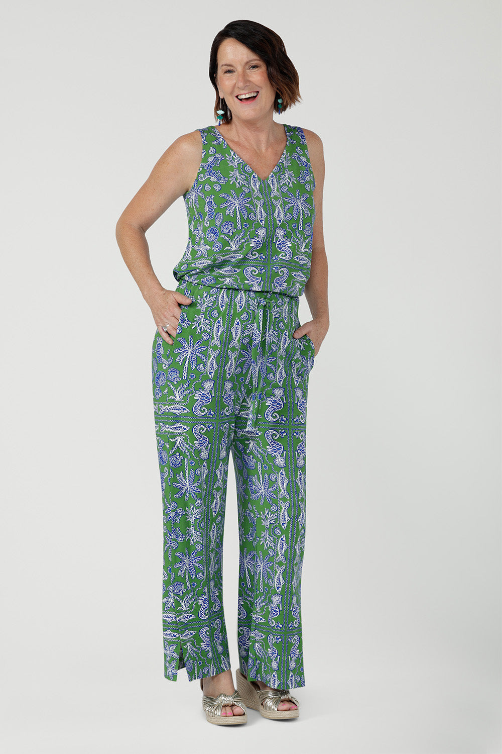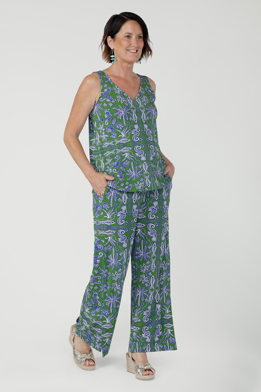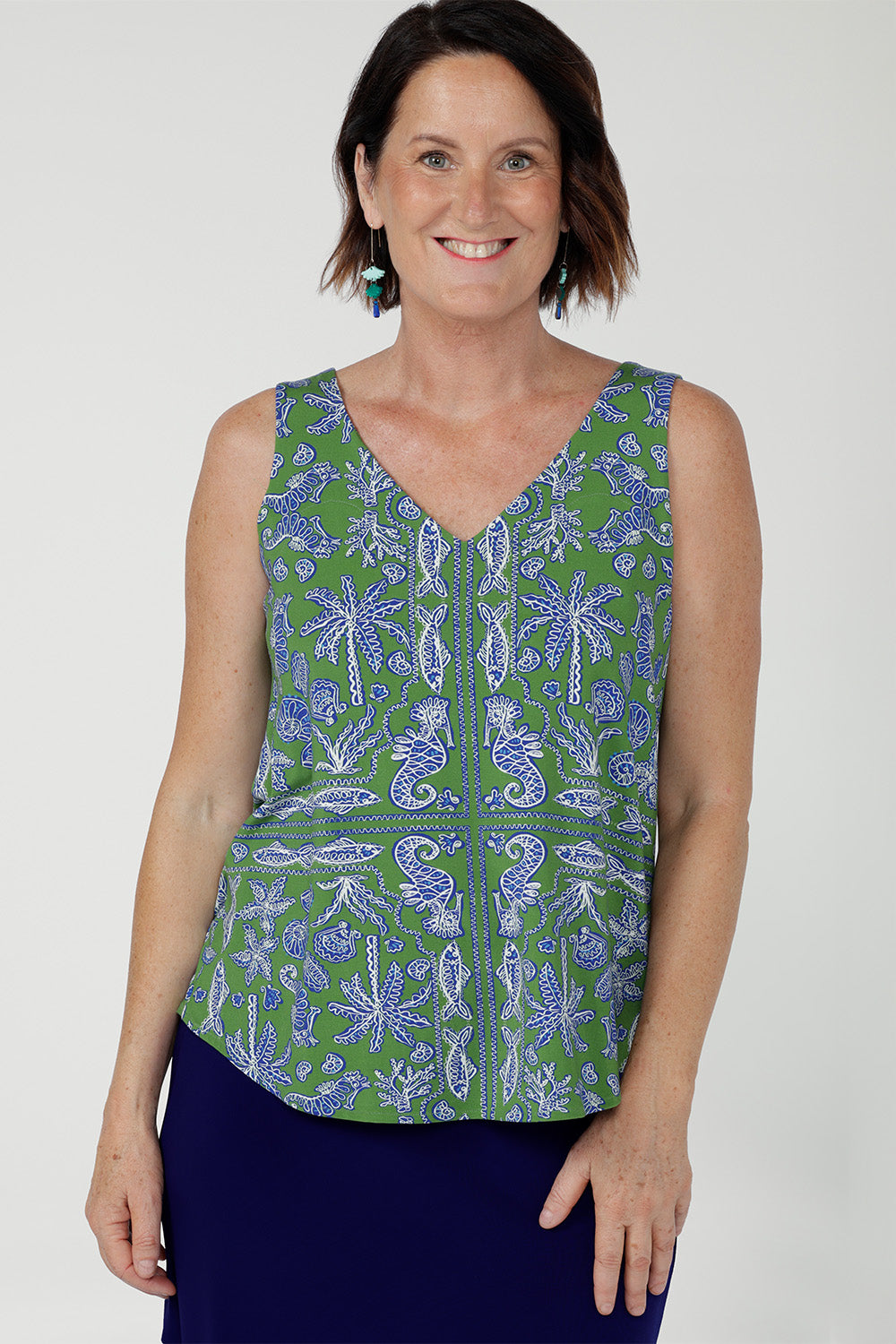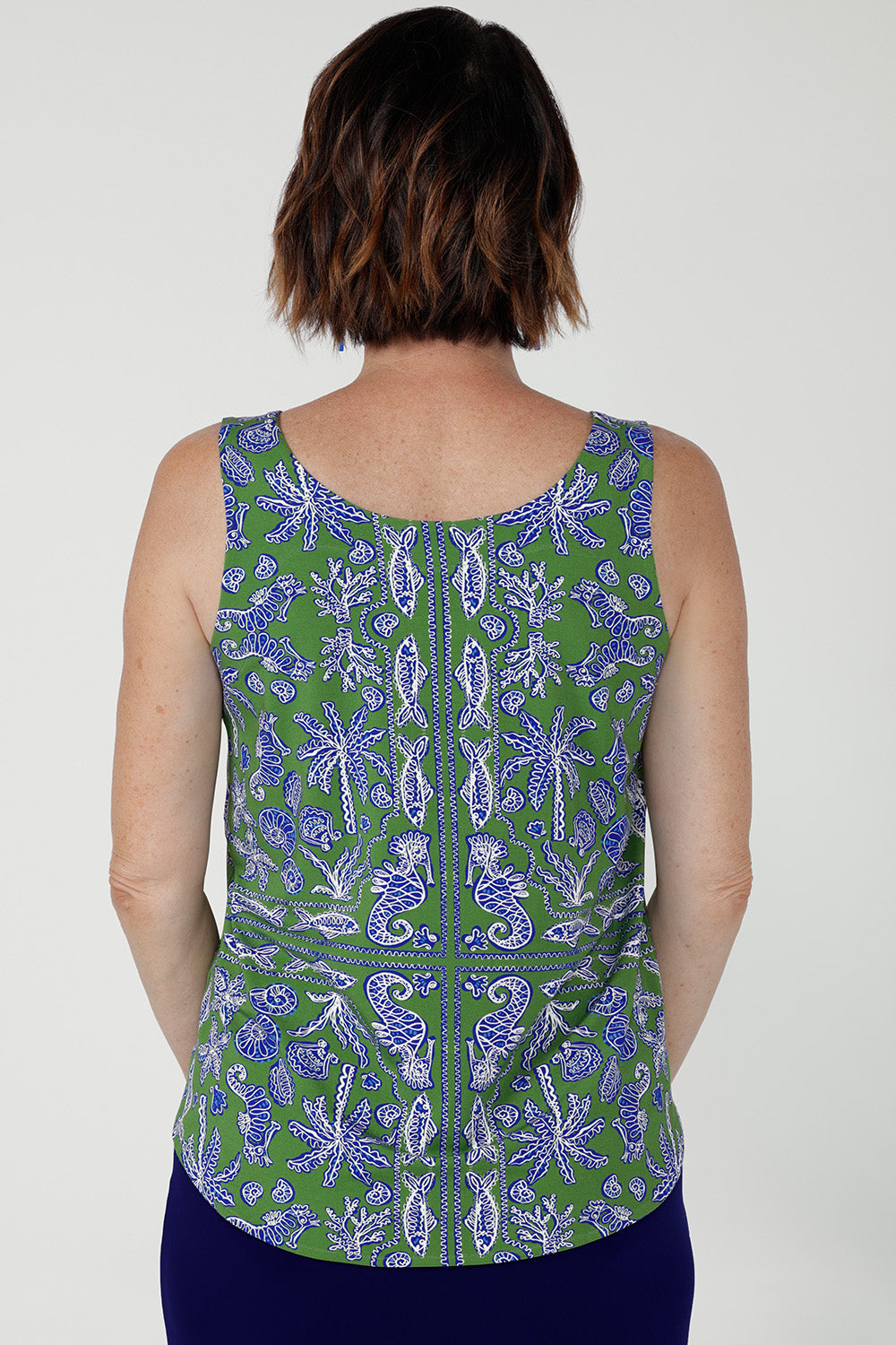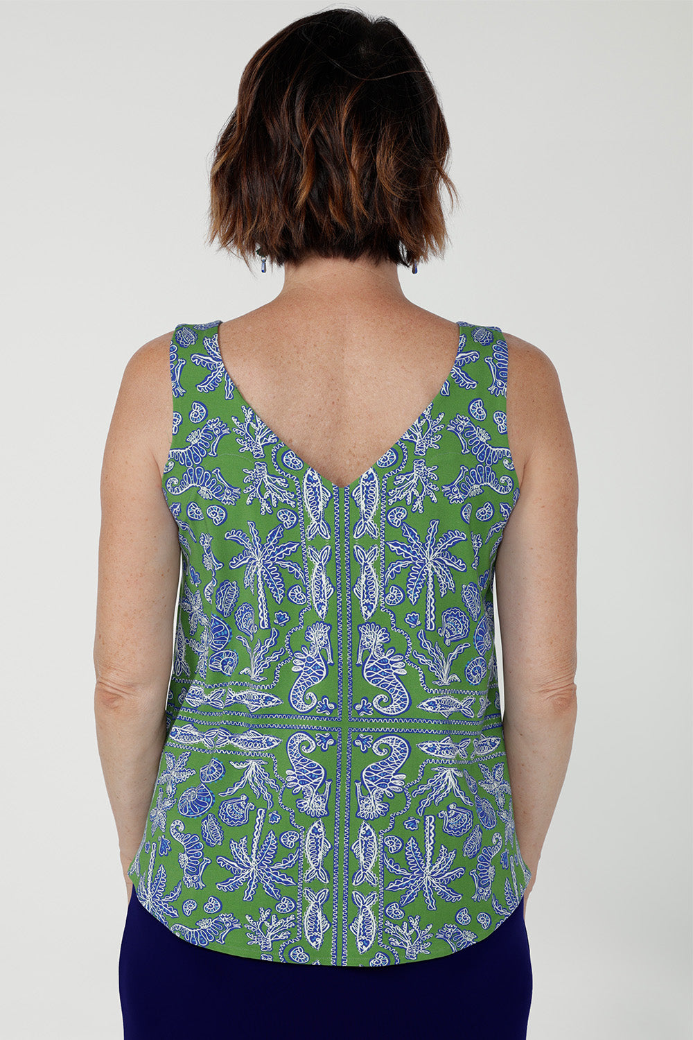 Crafted from breathable bamboo jersey, the Harlee Reversible Cami is a versatile everyday base layer. Soft with gentle stretch, it features bust darts and a clever reversible neckline-wear as a clean boat neck or flip to a flattering V-neck. The Summer Seahorse Bamboo print showcases a marine motif on a deep green base and is an exclusive print to Leina + Fleur.