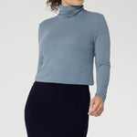 Made from a blend of stretchy Tencel wool fabric, it offers both flexibility and coziness, making it the perfect layering piece for cooler weather. Size 18 model wears her turtle neck top under her soft suiting, pairing her Pennyworth vest over the tencel wool top.