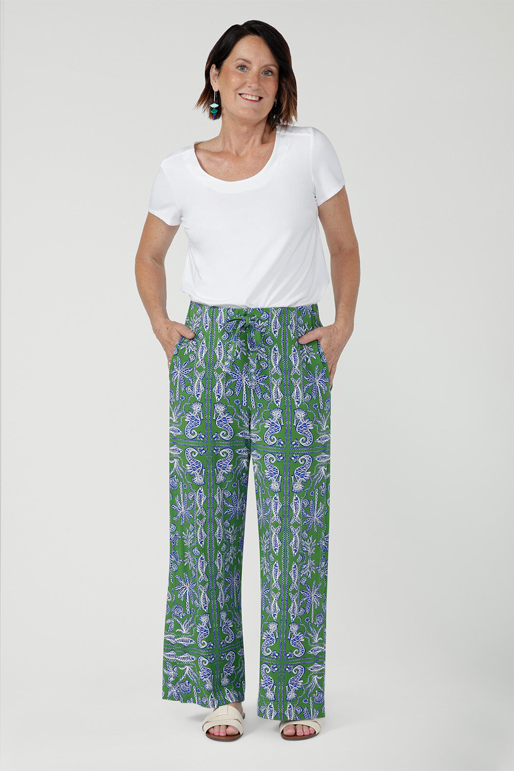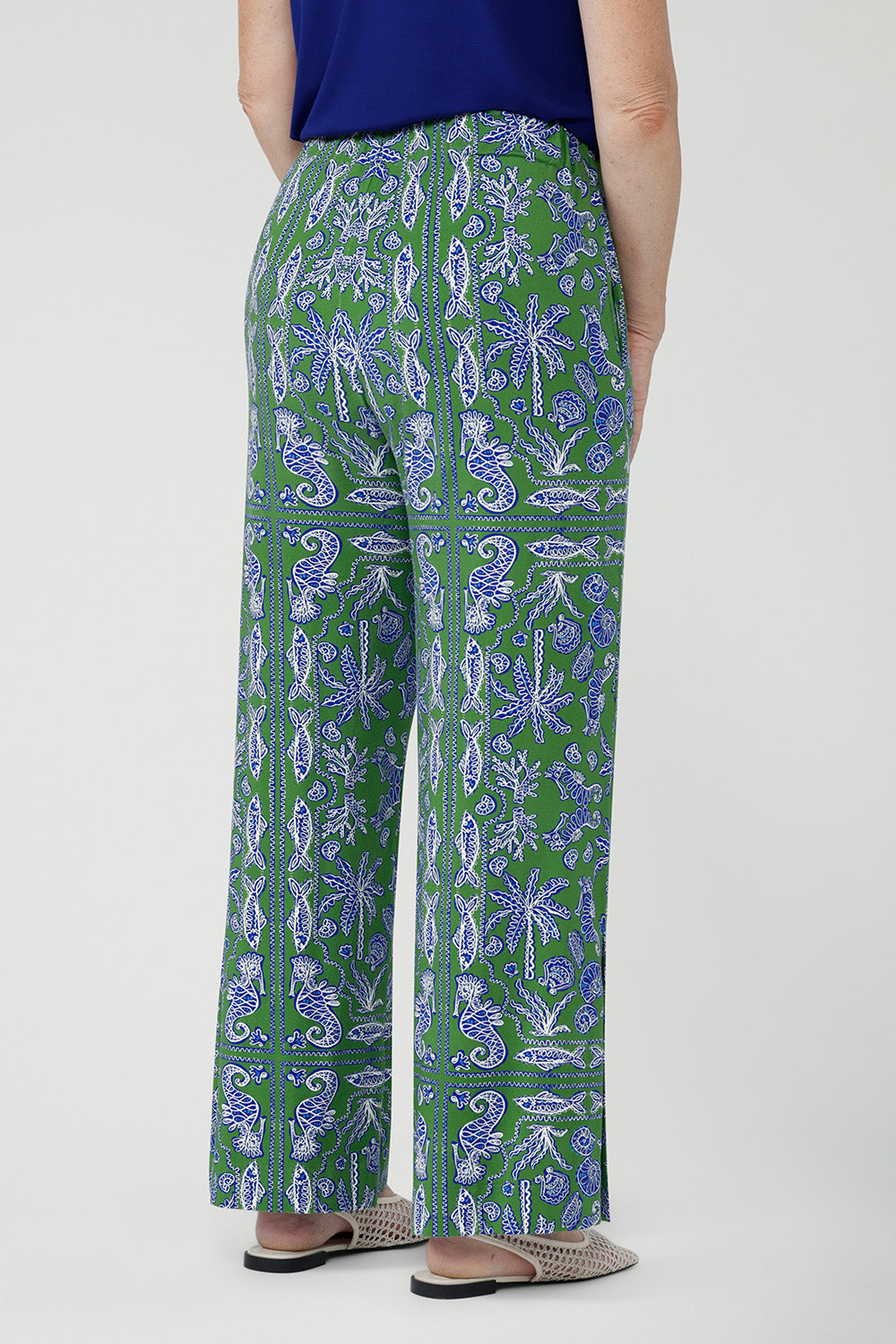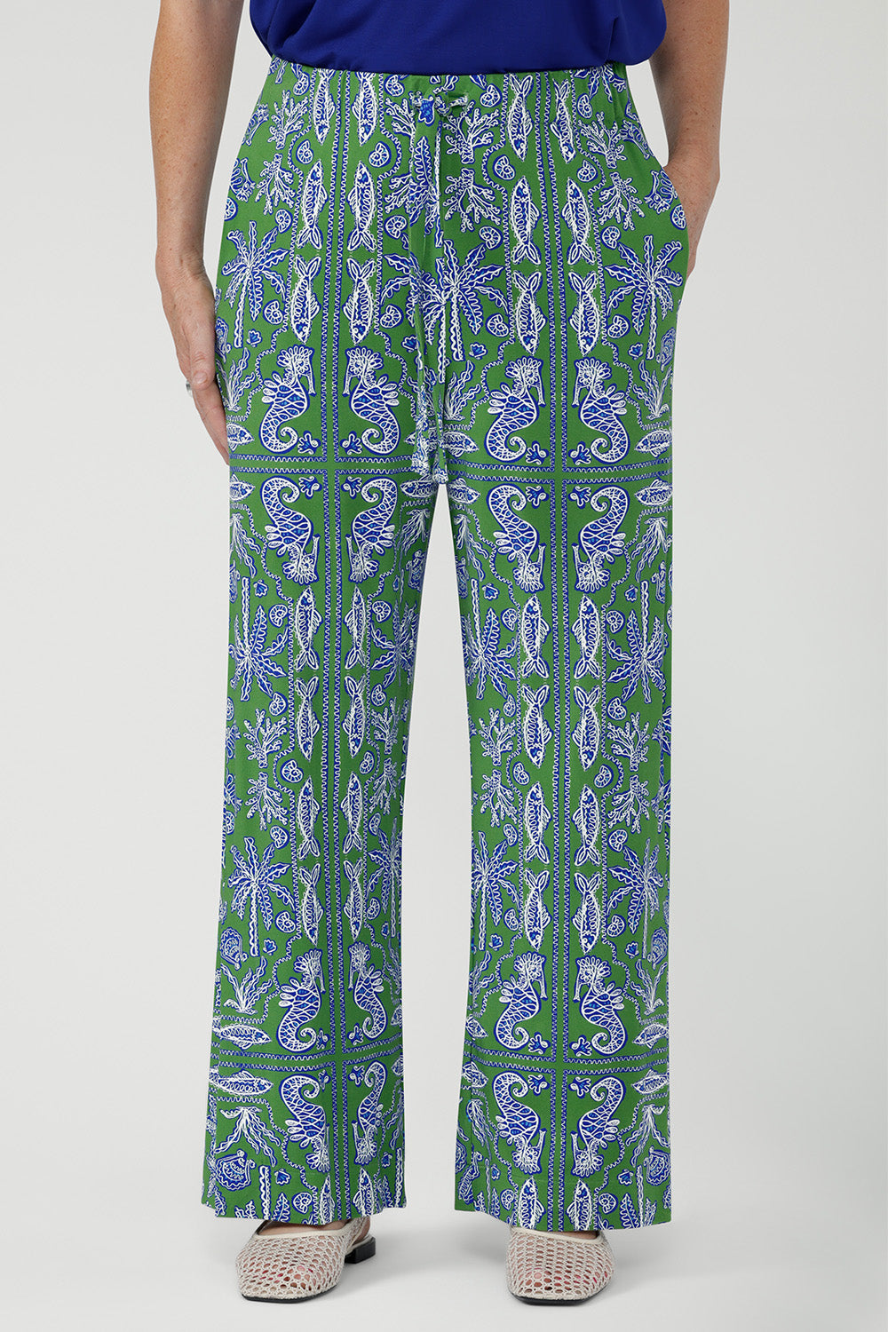 Crafted from soft, breathable bamboo jersey, the Wren Drawstring Pant is an easy wide-leg style for relaxed summer wear. Lightweight and fluid, it features a pull-on elasticated waistband with adjustable drawstring and side pockets. A subtle hem slit adds movement. The Summer Seahorse Bamboo print showcases a marine motif on a deep green base and is an exclusive print to Leina + Fleur.