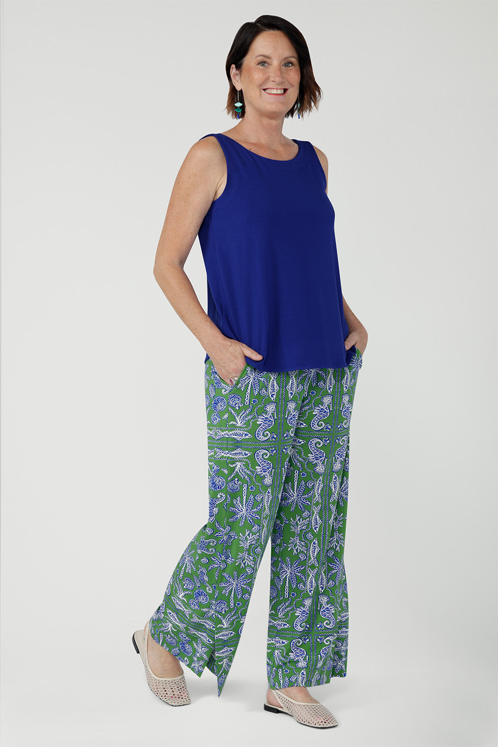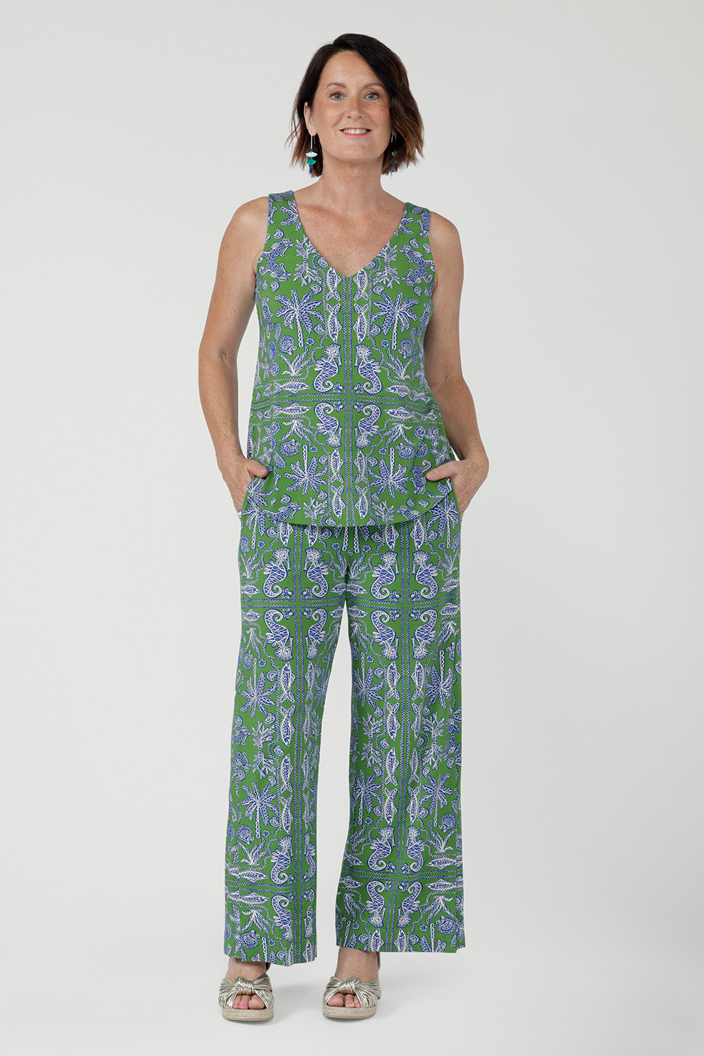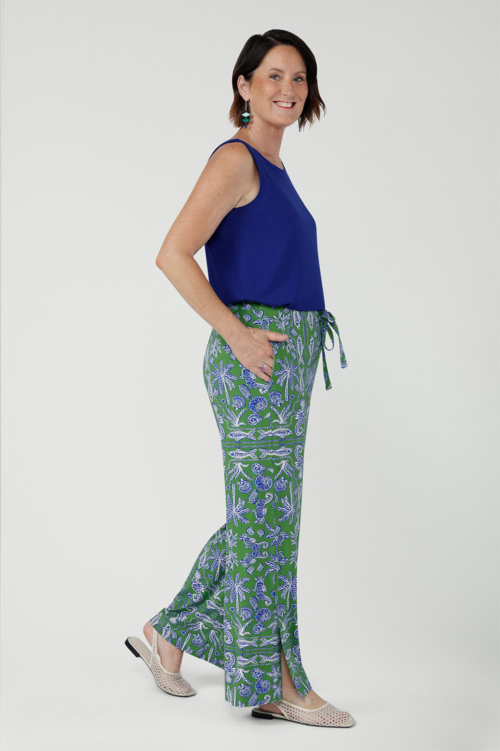 Crafted from soft, breathable bamboo jersey, the Wren Drawstring Pant is an easy wide-leg style for relaxed summer wear. Lightweight and fluid, it features a pull-on elasticated waistband with adjustable drawstring and side pockets. A subtle hem slit adds movement. The Summer Seahorse Bamboo print showcases a marine motif on a deep green base and is an exclusive print to Leina + Fleur.