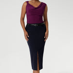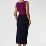 Navy workwear skirt is made of easy to care fabric in scuba crepe fabric. Workwear skirt has a deep navy colour. This comfortable work wear skirt provides full body stretch great for any office or corporate setting. Australia made clothing. Made by Australian and New Zealand women. Leina and Fleur is a woman’s fashion label that stocks sizes from 8 to 24. Shop this appropriate work skirt in plus size and petite sizes.