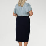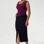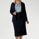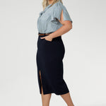 Full body front view of 40 year old plus sized woman wearing a midi length work skirt. This workwear skirt is navy in colour and made of good quality scuba crepe fabric. This skirt has an above the knee slit for comfort and mobility. Perfect skirt for an office or corporate setting. 3/4 length skirt is Australia made by New Zealand and Australian women. Leina & Fleur is a clothing company for woman that stock sizes from 8 to 24. Shop this work skirt in plus sizes and petite sizes.