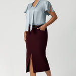 Serene Ice Blue & Deep Wine. This blouse drapes beautifully on the body, creating a flattering and luminous effect. Though the fabric has no stretch, its elegant drape moves gracefully with you, adding a touch of elevated style to any occasion. Size 10 model wears her Ice Blue blouse with wine coloured suiting vest and tapered pants for a casual take on a feminine blouse.