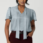 Image of plus size model wearing suede touch blouse styled with navy work skirt and silver accessories. The V-neckline with adjustable neckties allows for a customisable fit, adding a feminine touch to the look. Short flutter sleeves with slits at the shoulders create a breezy, modern feel, bringing a subtle hint of playful elegance to the piece.
