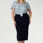 Light blouse, suede touch blouse features a V-neckline with adjustable neckties allows for a customisable fit, adding a feminine touch to the look. Size 18 woman wears her Micheal Shirt with neckties done up in a tie with a navy workwear midi skirt.