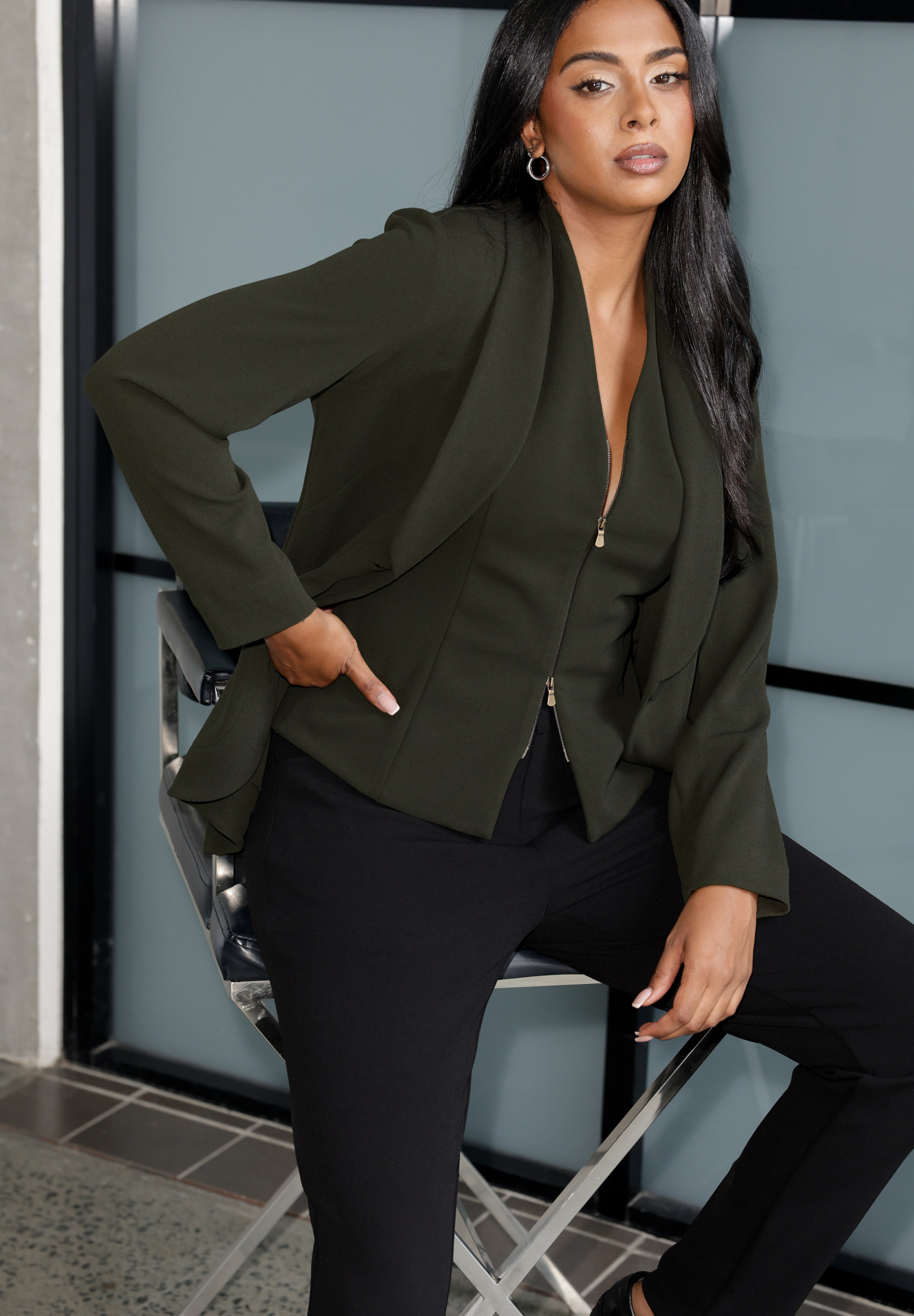Crafted from our luxe, body-contouring scuba jersey, the Merit Blazer is an expertly tailored jacket that elevates any outfit. Perfect for work, Merit features a button front, full-length sleeves with foldable cuffs, and an extended shawl collar, offering versatile style and comfort.