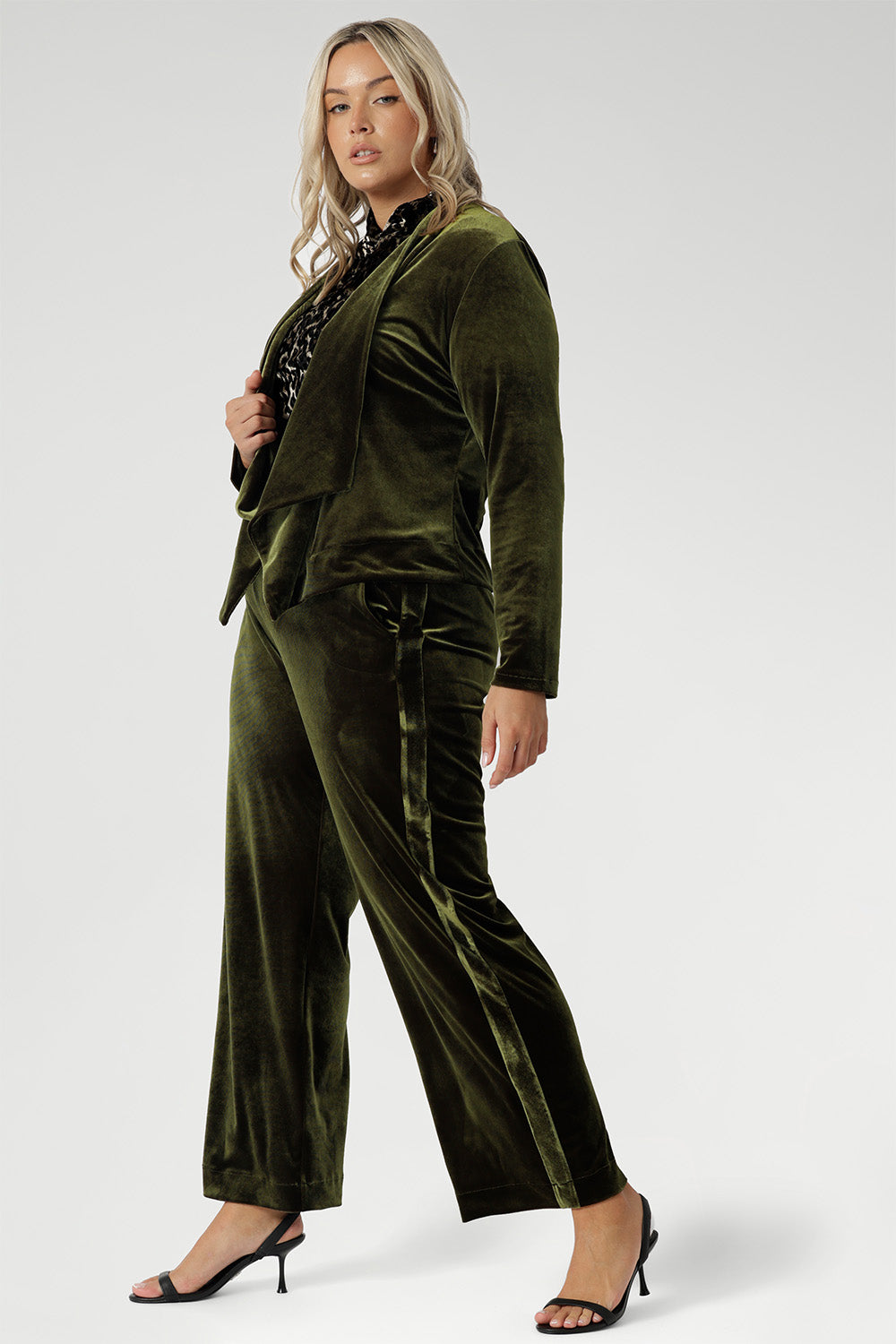 Crafted from a luxe stretch velour, the new Soren Pant features a wide-leg design, pull-on style, and a sharp tuxedo stripe for a sleek, modern edge. These pants carry you effortlessly from dinner to wherever the night takes you, and pair perfectly with the Romy Fluid Jacket.