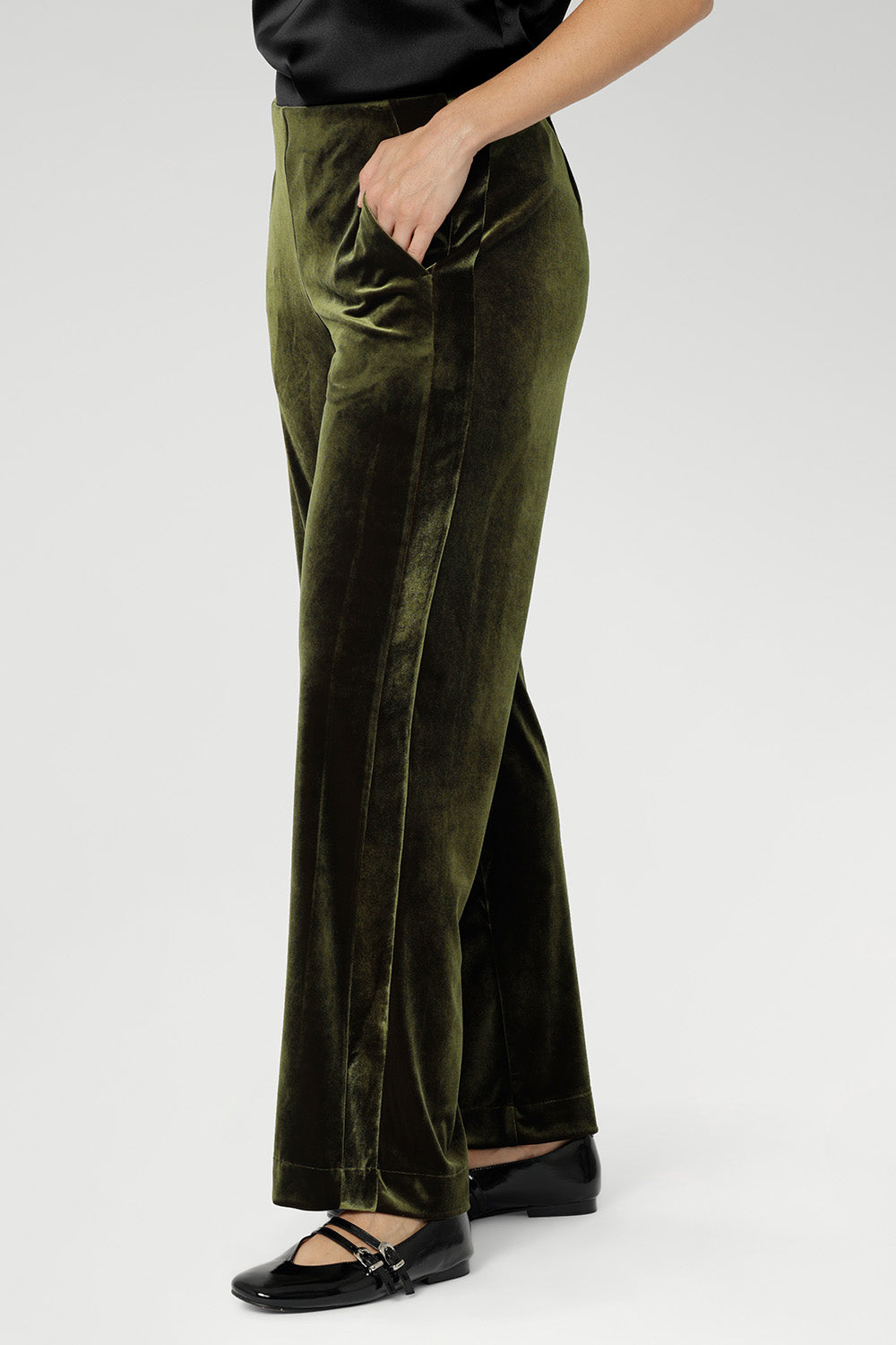 Gorgeous velour with stretch. I decided to be practical & order the black as I wanted to wear the pants with many different L&F tops I already have. Very excited to wear these pants !!