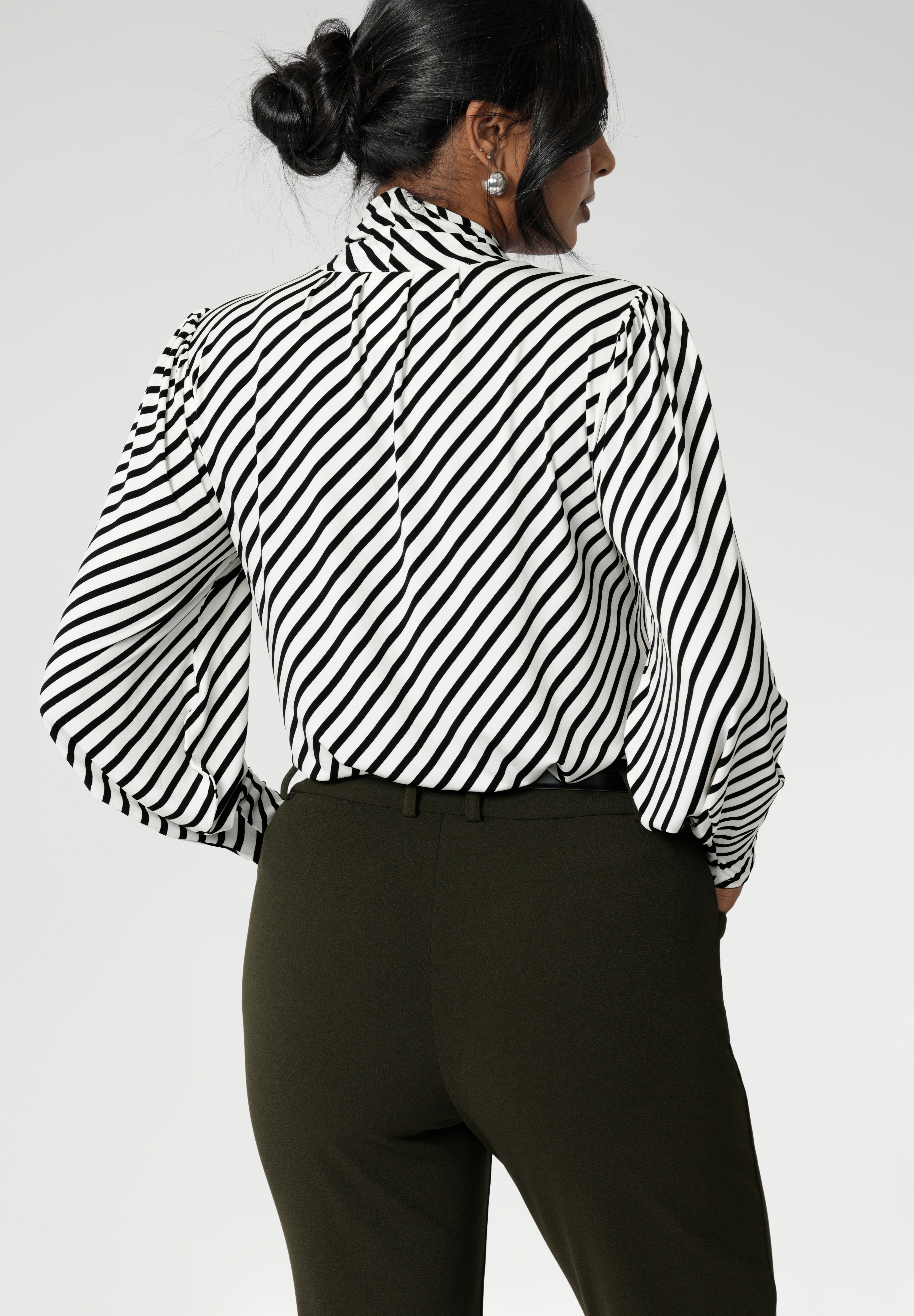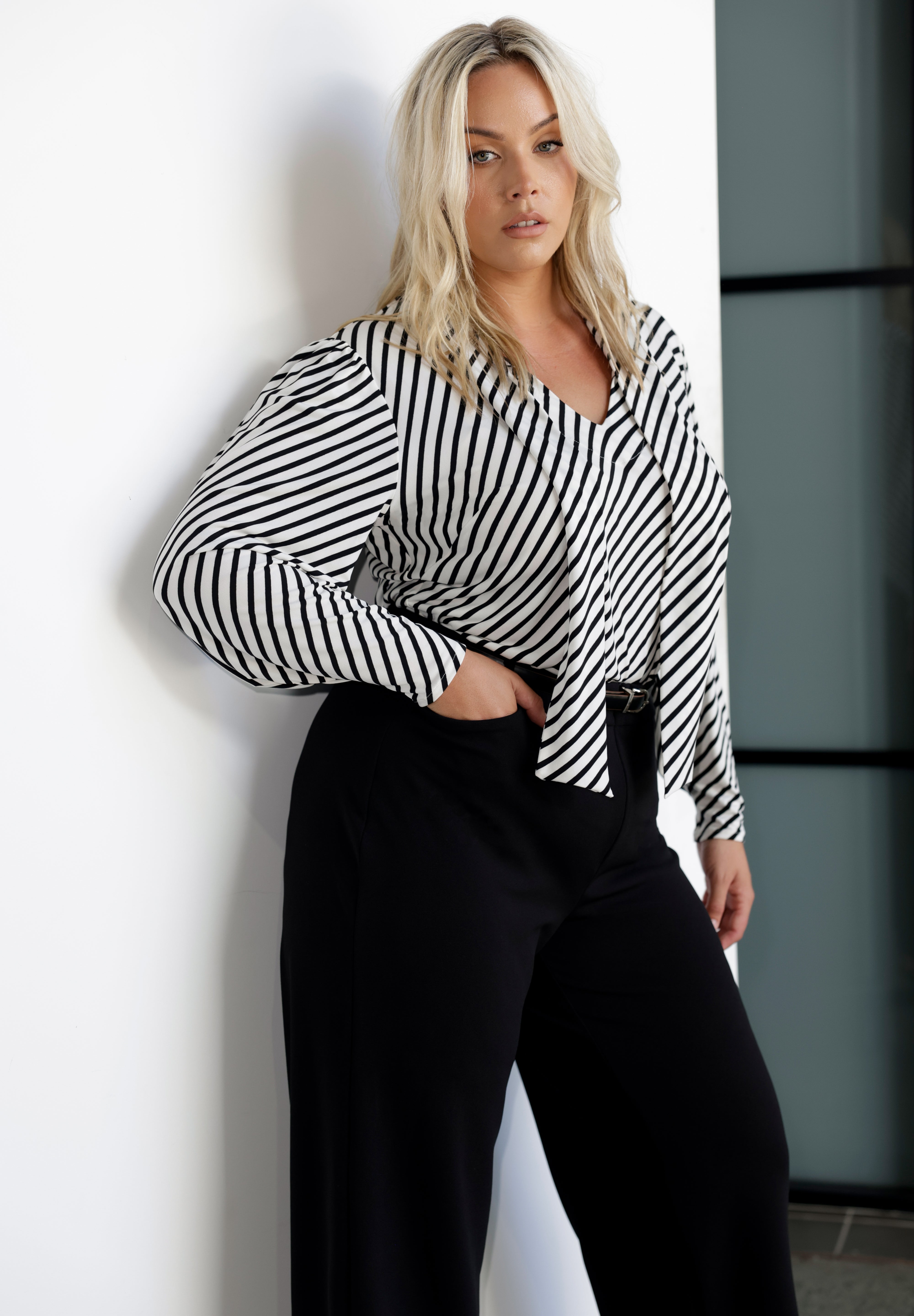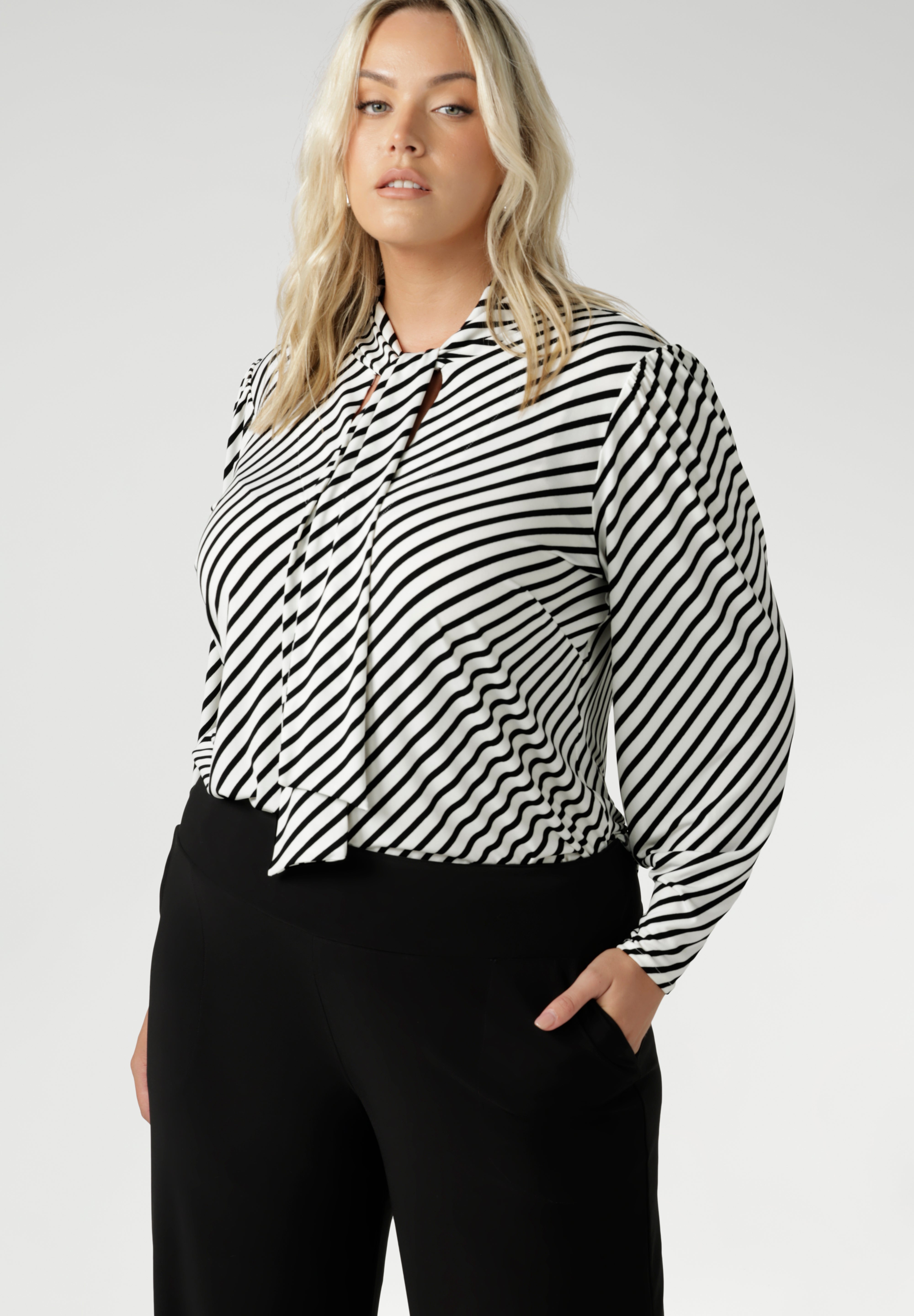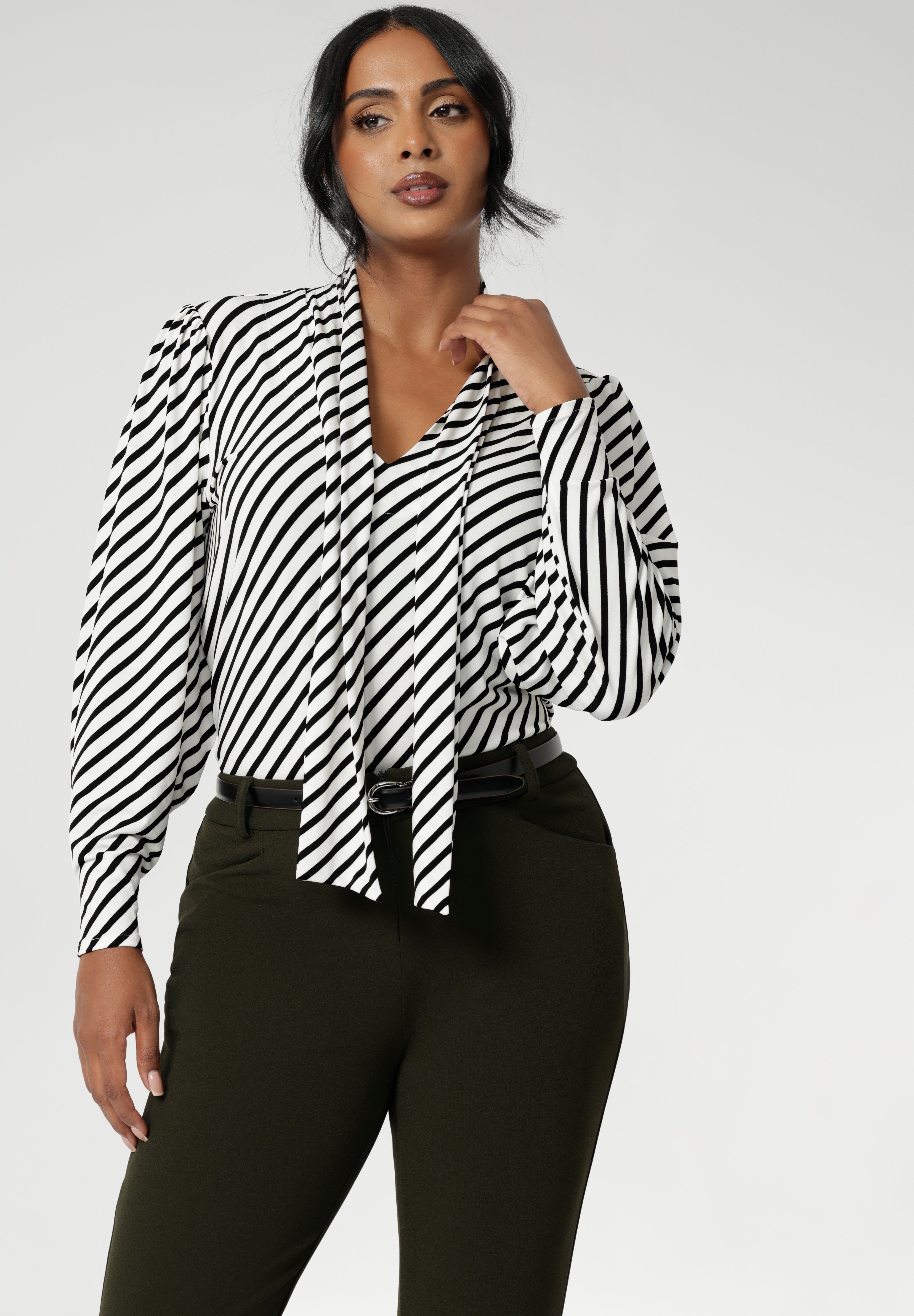 Striking. A perfect match for my Manhattan Skirt in Black. Elevates the entire look. Love the tie aspect in this top. I can tie it up or keep it open. Gorgeous sleeves and no need for a jacket either this top. Definitely a go to when I am going out at night.