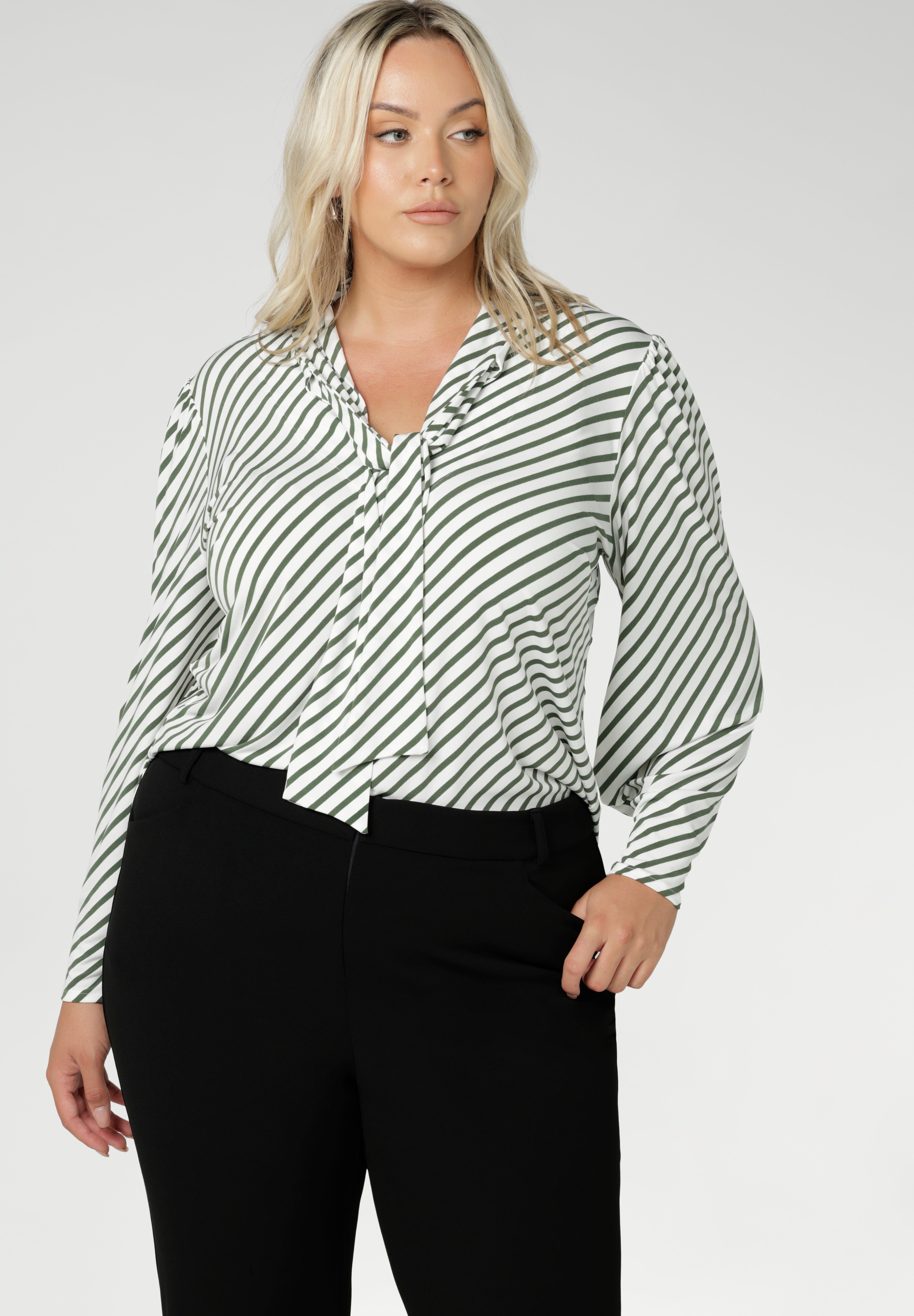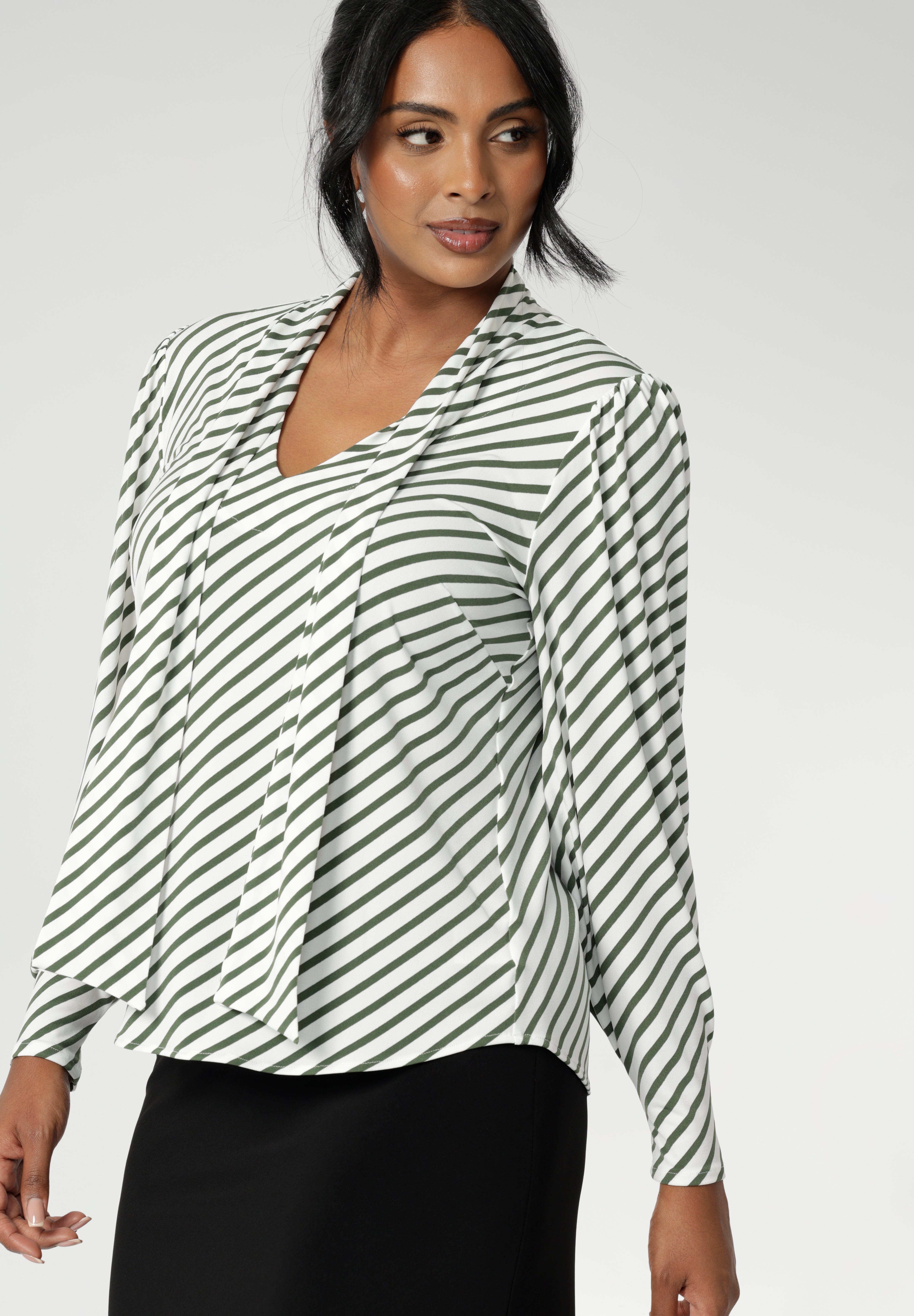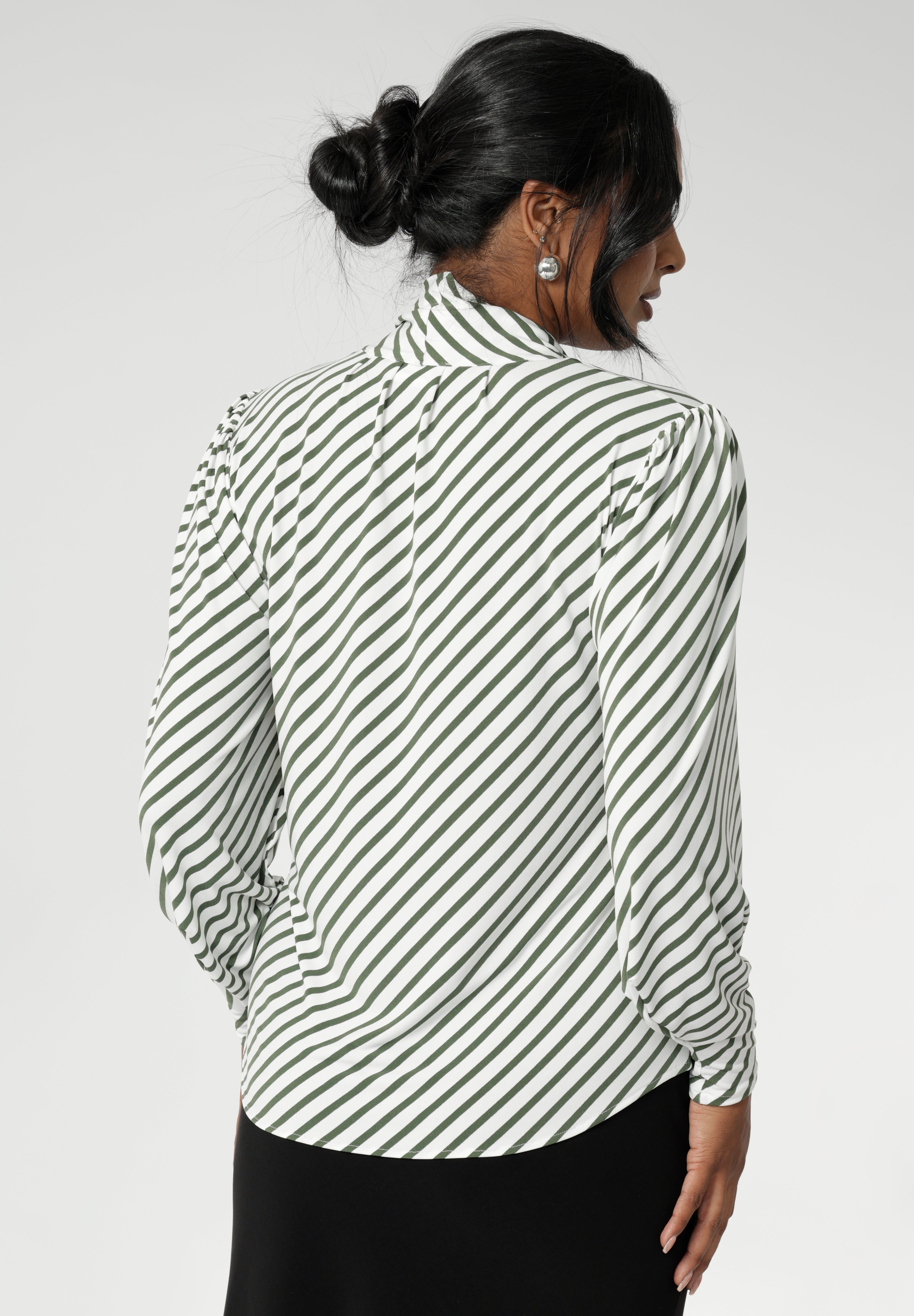 • The stripe print is on a white base with olive stripe details