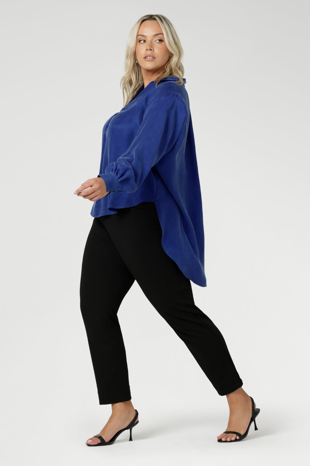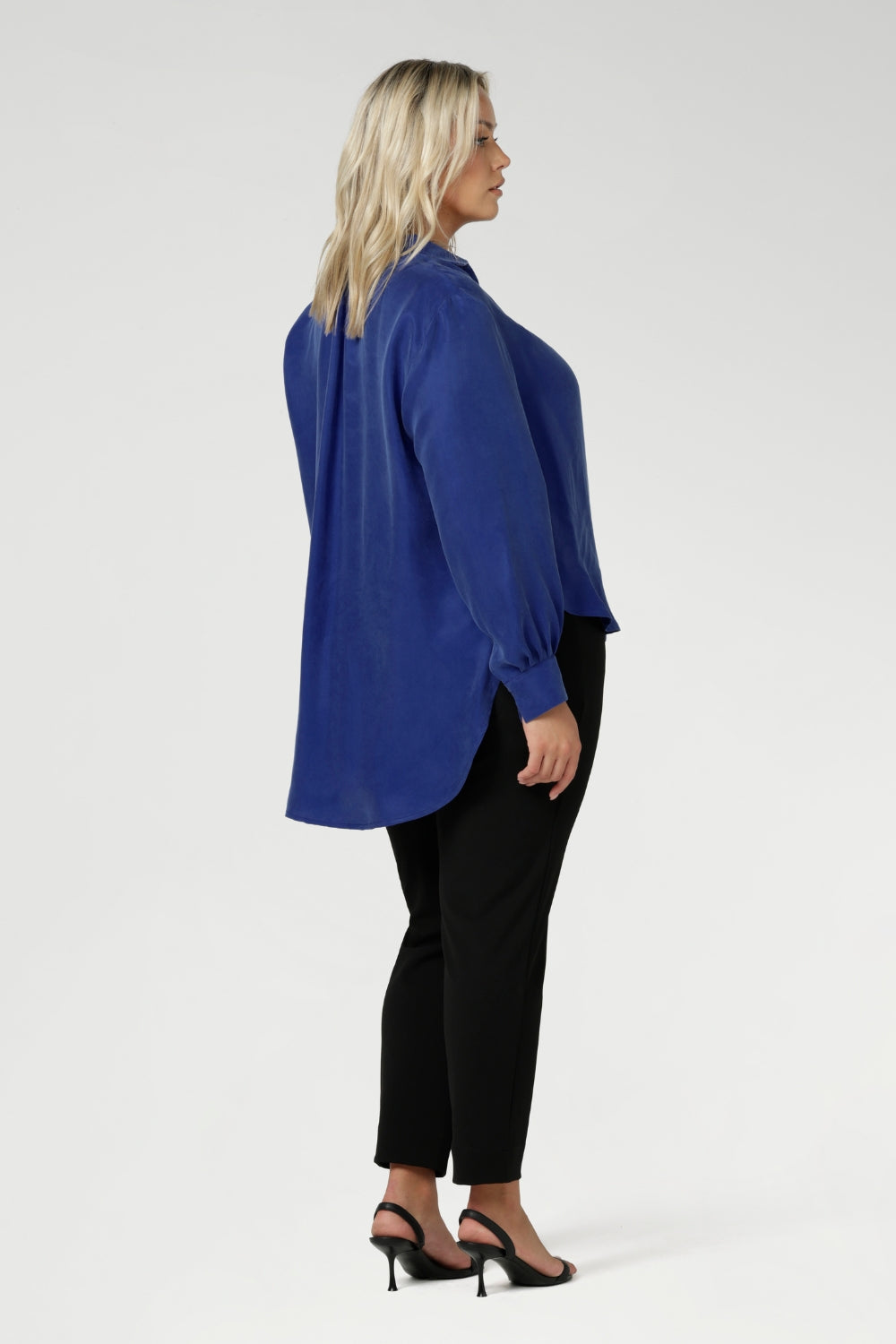Crafted from a luxurious Tencel fabric with a silky hand feel, the Ellis Shirt in Cobalt has an oversized fit, designed to be worn loose or front-tucked. Featuring a collared V neckline, and long cuffed sleeves with covered button, Ellis is perfect for both work and events.