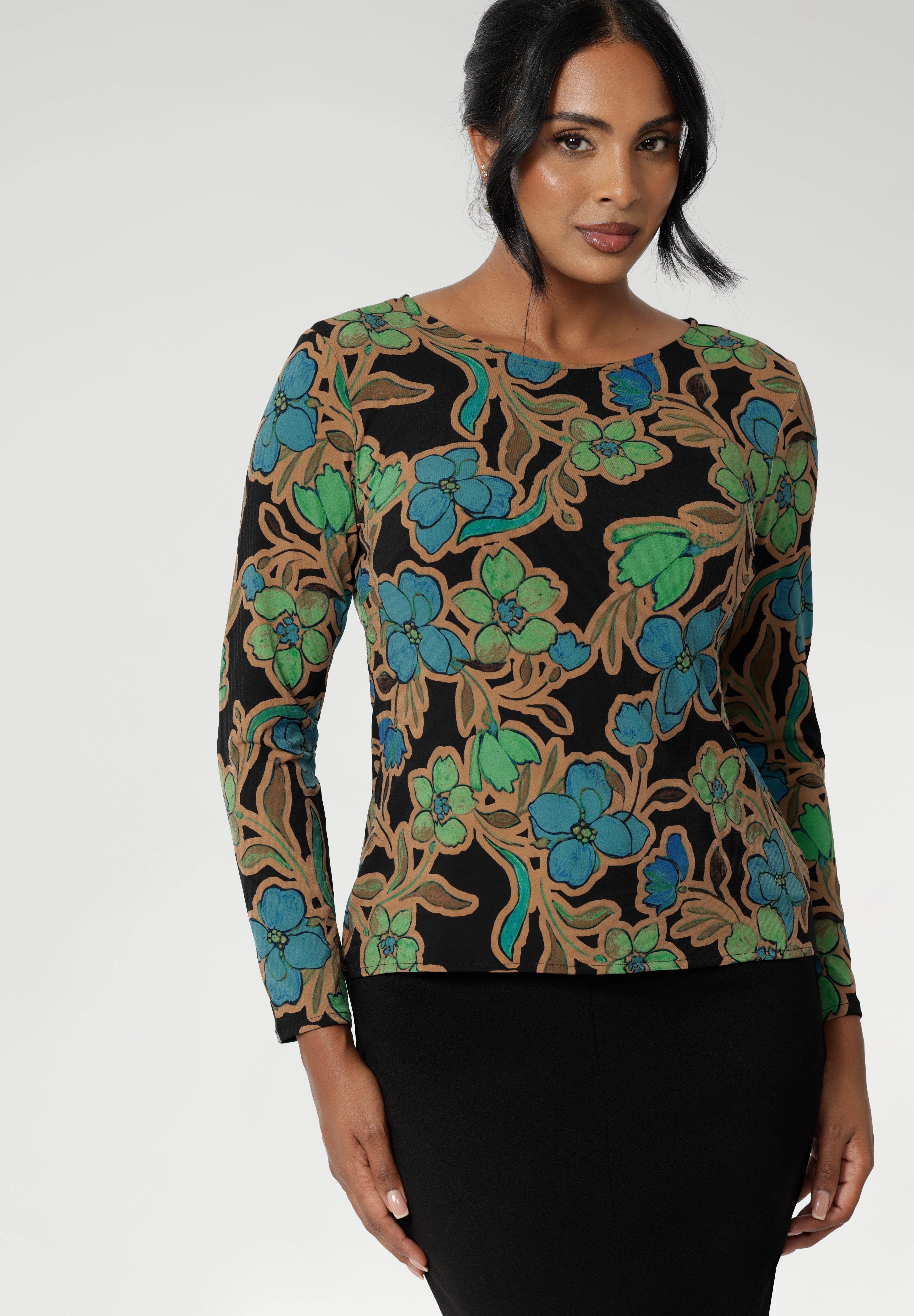 • Striking floral print with rich tones of opal blue, green and burnt gold