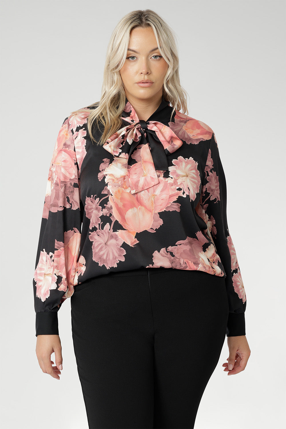 Crafted from a luxurious satin rayon fabric, with a silky hand feel, the Matisse Shirt in Romantic Floral is a pull-on style with a tie neckline, and features blouson sleeves and buttoned cuffs that add a polished finish.