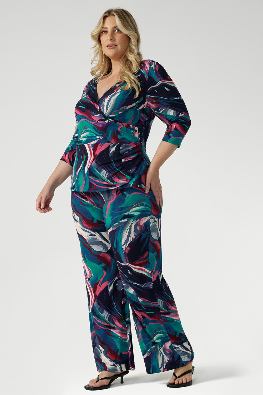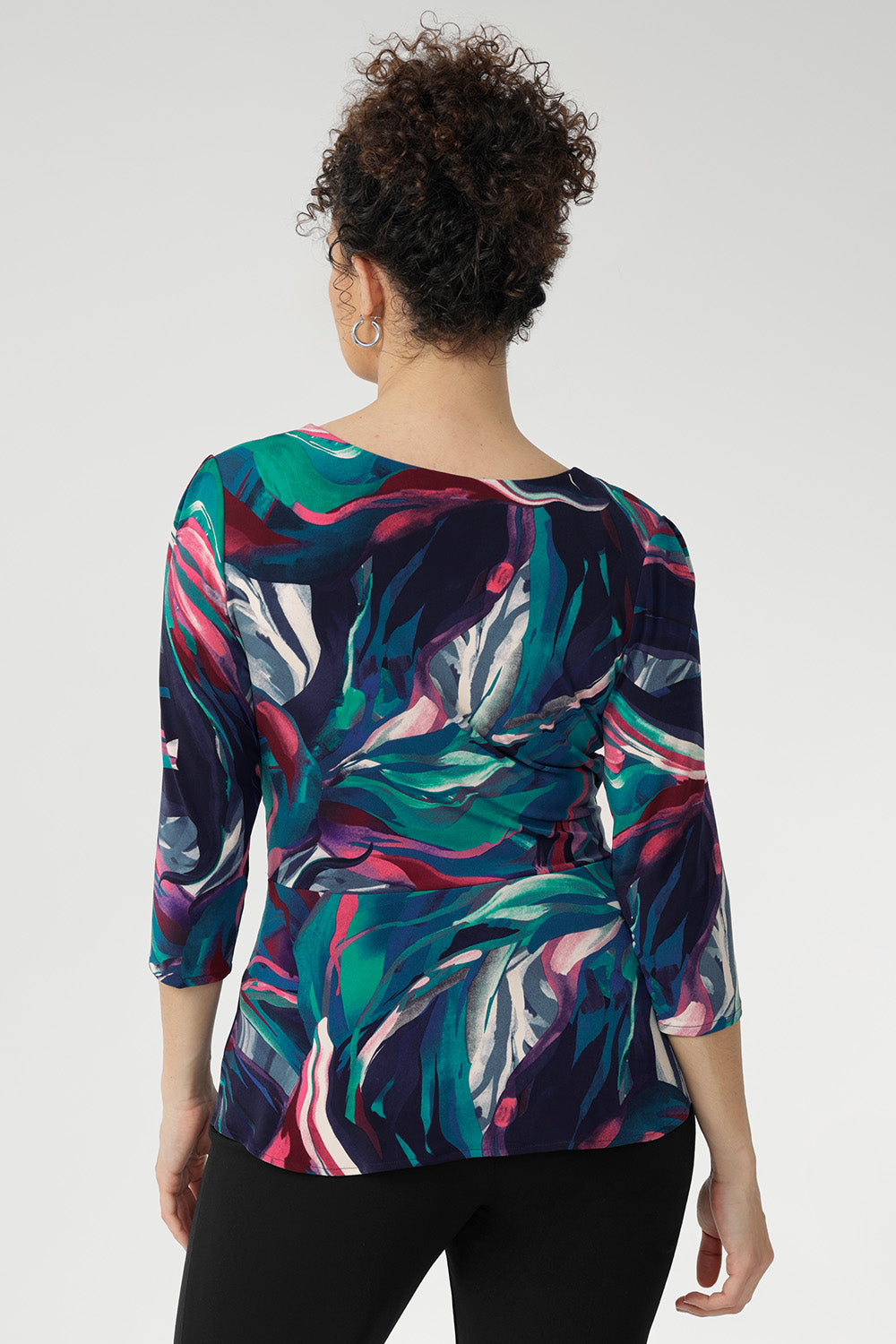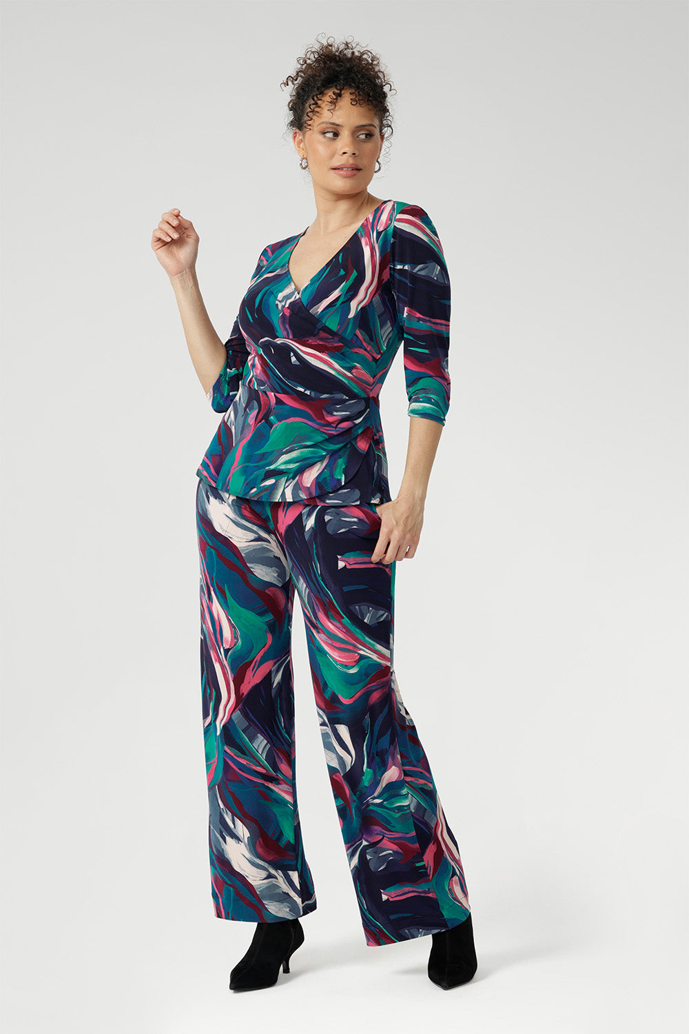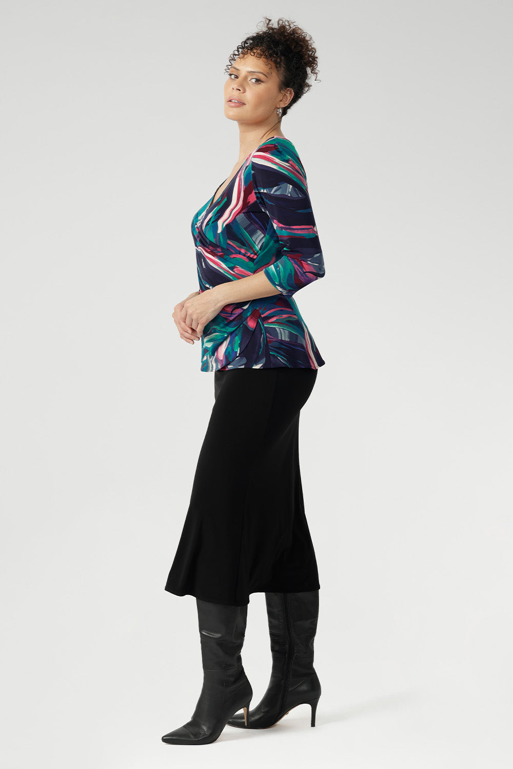 Crafted from our signature dry-touch stretch jersey, the Kyle Top is designed with professional style and all-day comfort in mind. Featuring a wrap bodice, 3/4 length sleeves, and a soft peplum waist seam that adds sophistication, and can be tucked into high-waist pants for a different look.