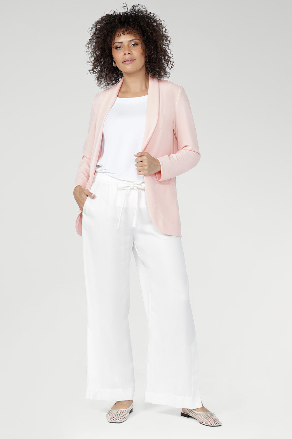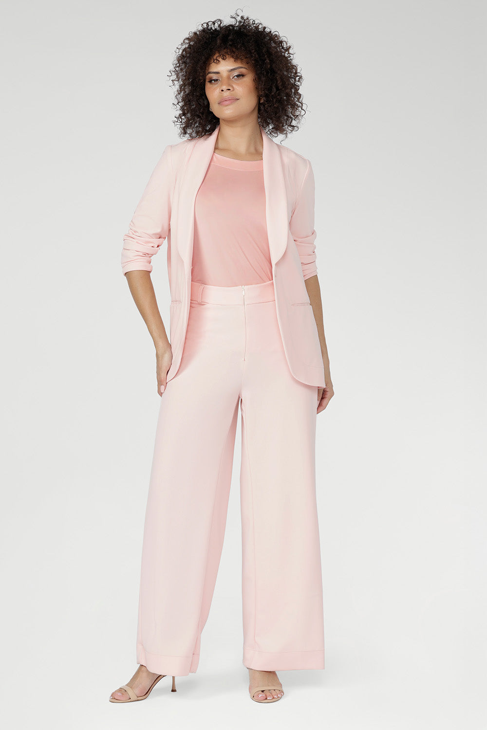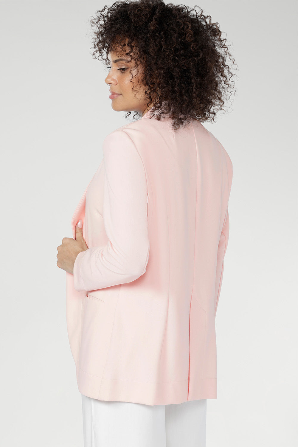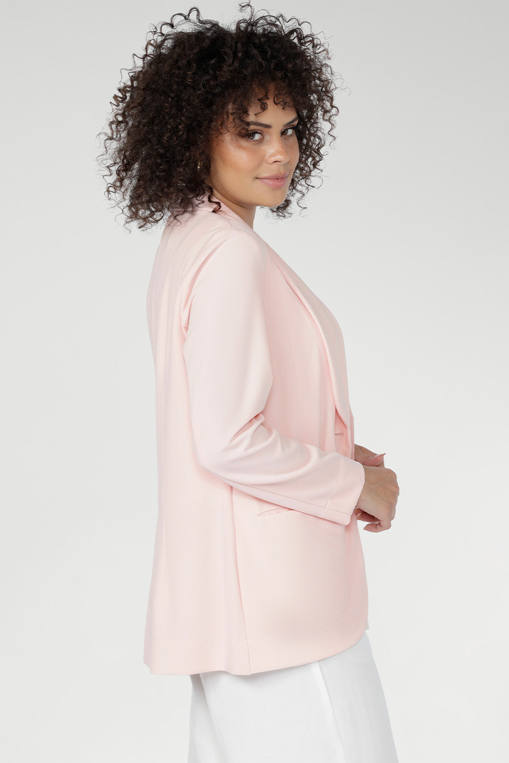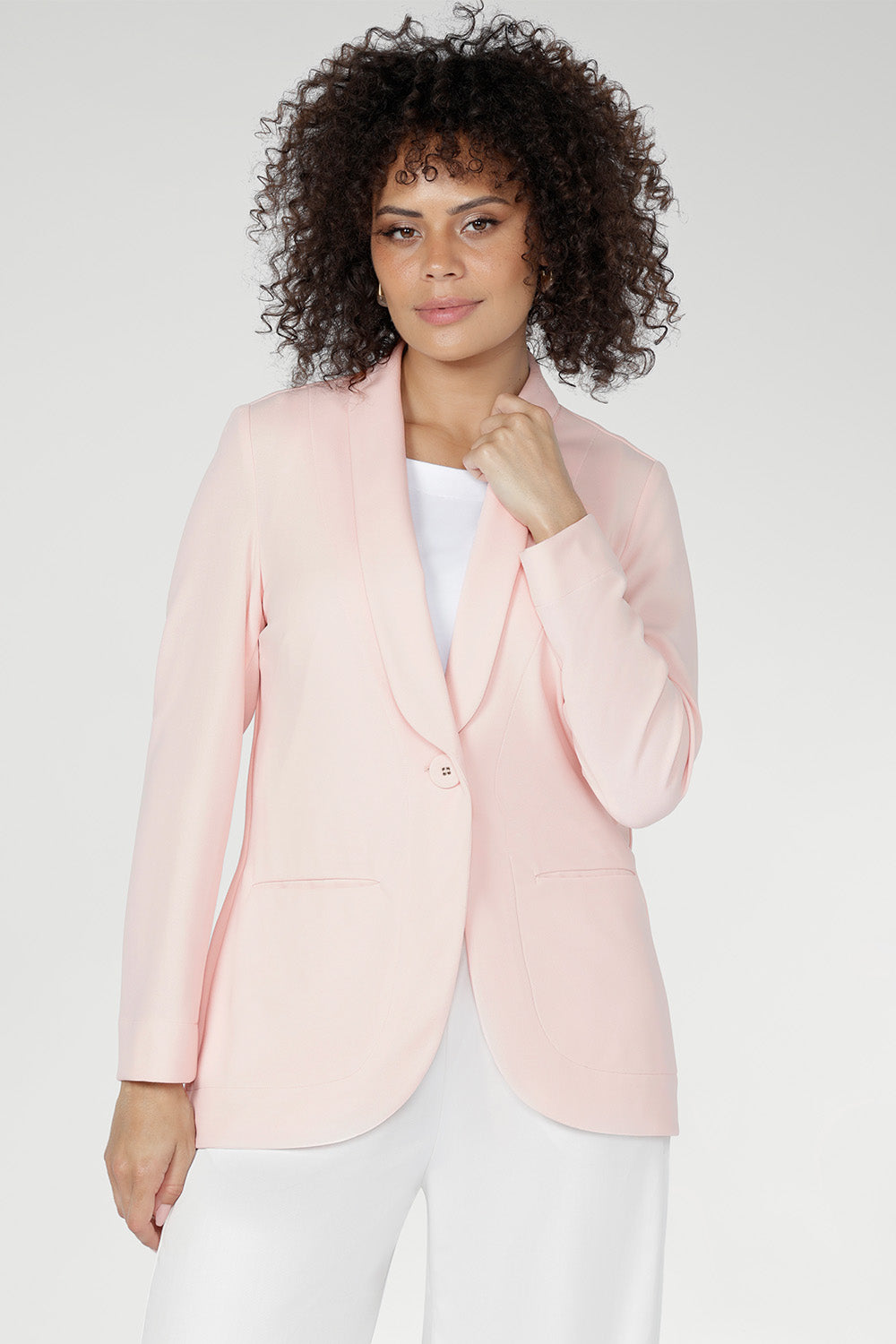 Crafted from luxe, body-contouring scuba jersey, the Merit Blazer is a meticulously tailored layer for work and beyond. Smooth with supportive stretch, it features a refined button front, elongated shawl collar and full-length sleeves with foldable cuffs. Now in a soft pink hue. Made in Australia with integrity.