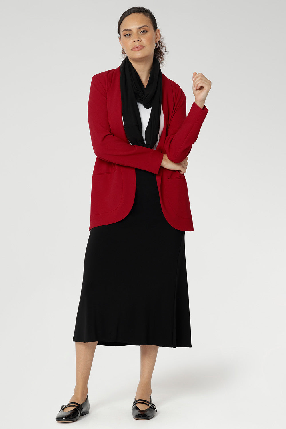 Crafted from our luxe, body-contouring scuba jersey, the Merit Blazer is an expertly tailored jacket that elevates any outfit. Perfect for work, Merit features a button front, full-length sleeves with foldable cuffs, and an extended shawl collar, offering versatile style and comfort.