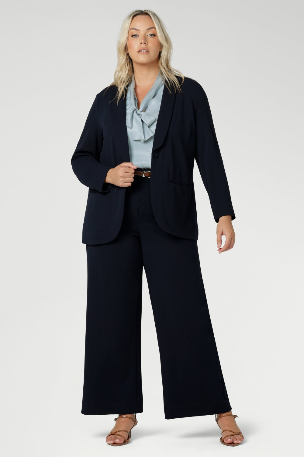 Crafted from our luxe, body-contouring scuba jersey, the Merit Blazer is an expertly tailored jacket that elevates any outfit. Perfect for work, Merit features a button front, full-length sleeves with foldable cuffs, and an extended shawl collar, offering versatile style and comfort.