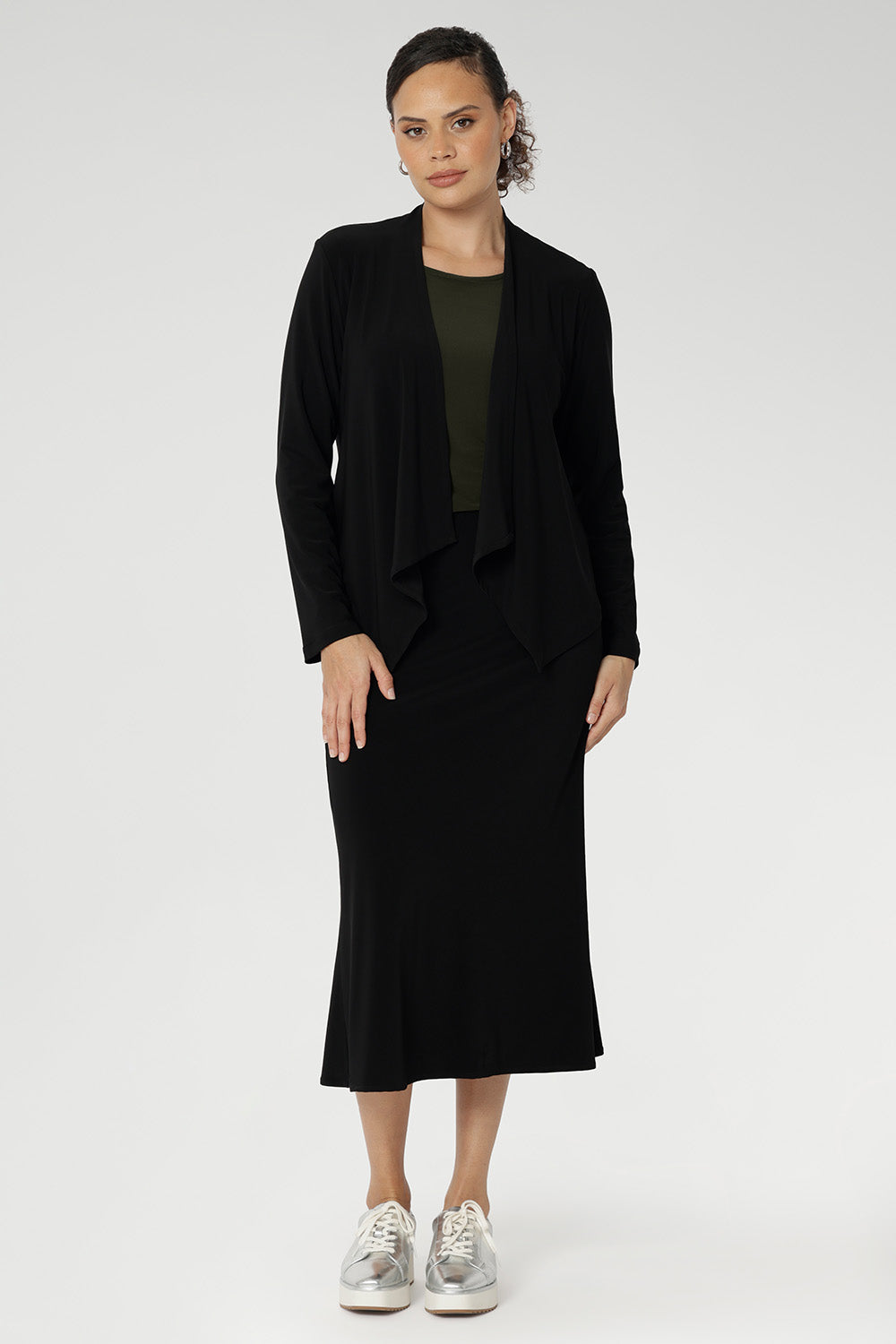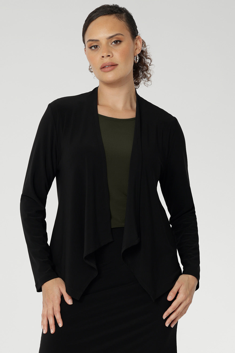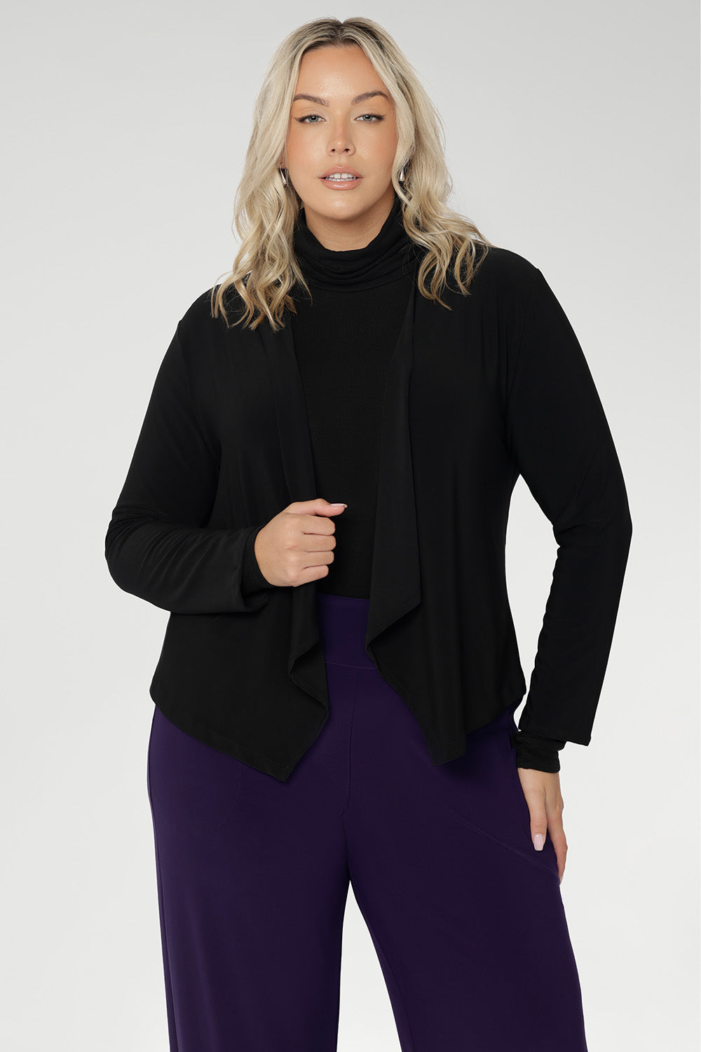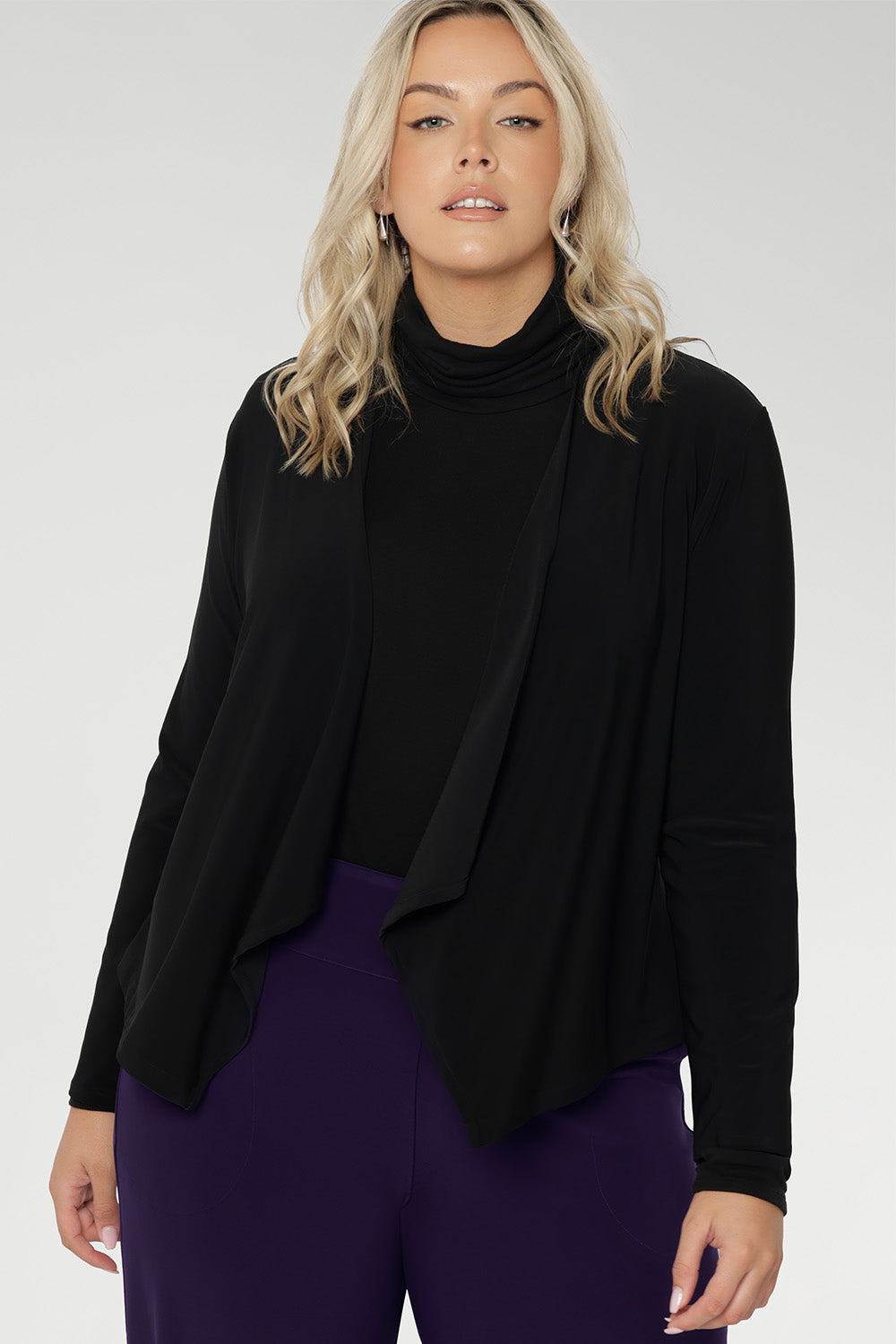 Crafted from our premium heavy-weight dry touch stretch jersey, Mikey is a jacket-like cardigan, softly tailored with an open, waterfall front, offering a chic, sophisticated look that transitions you seamlessly from work to after-hours events.
