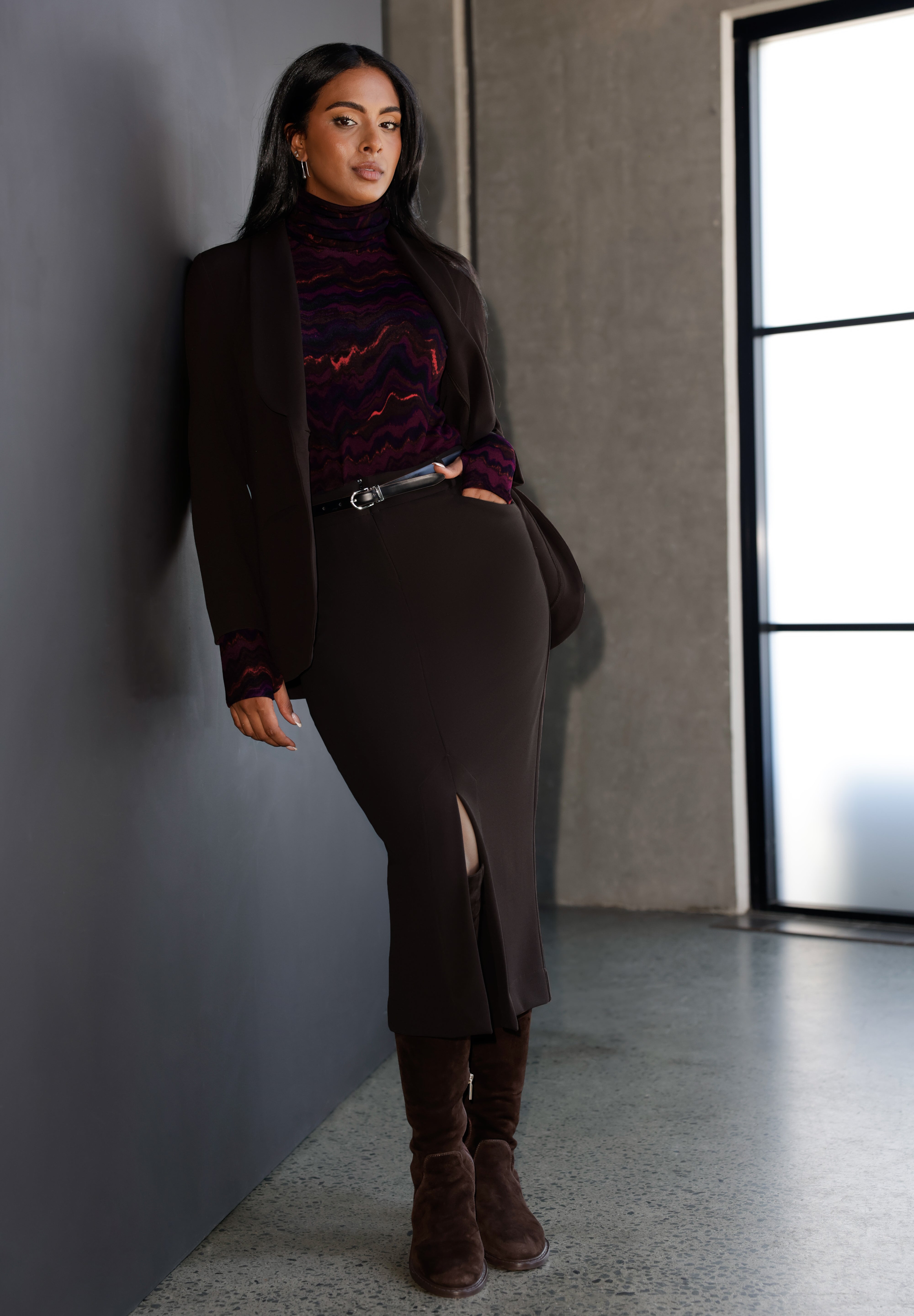 Crafted from our luxe, body-contouring scuba jersey, the Aaron Skirt, is a part of our Soft Suiting collection and pairs perfectly with the Merit Blazer and Pennyworth Vest for a modern, tailored look.