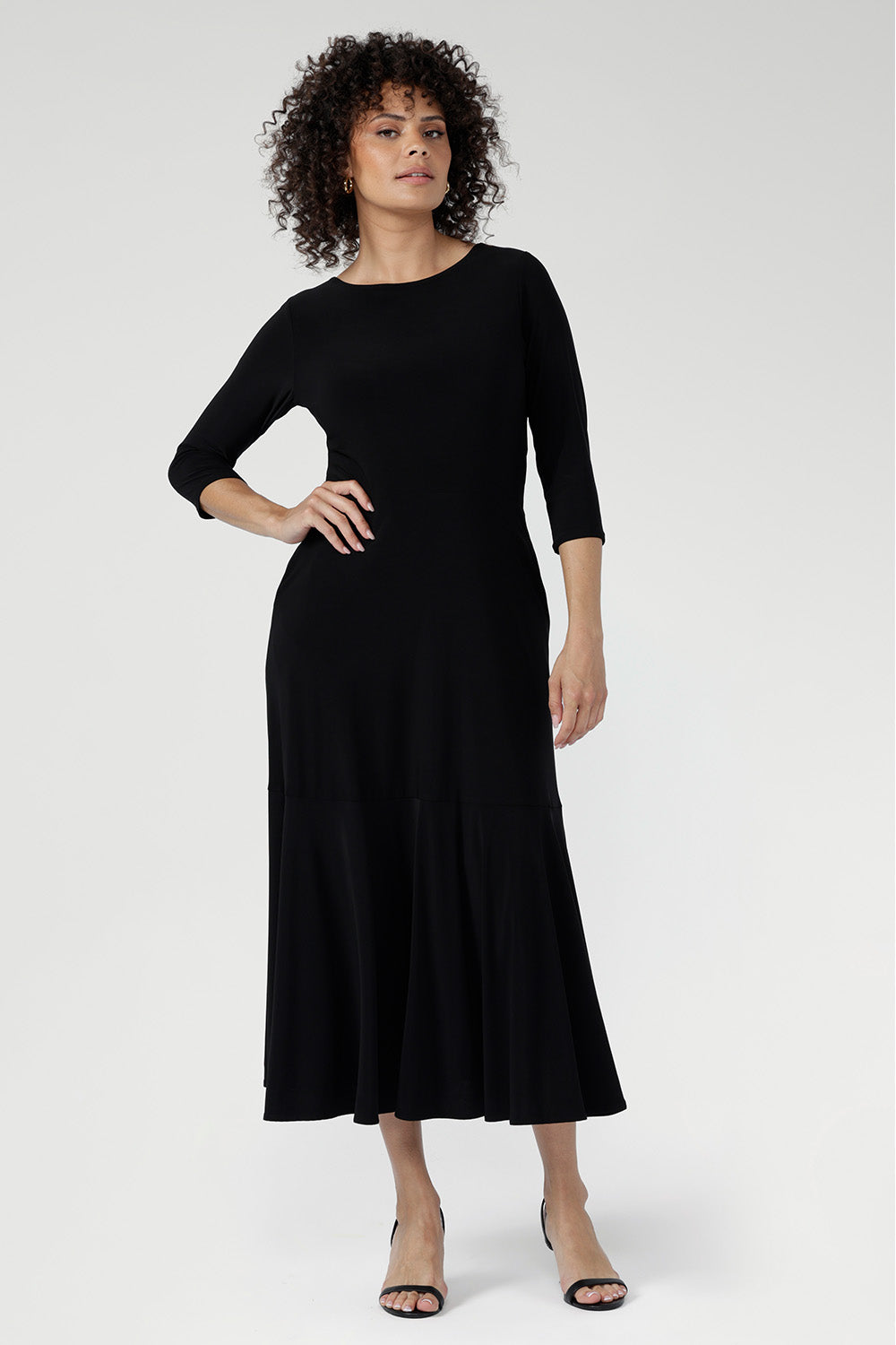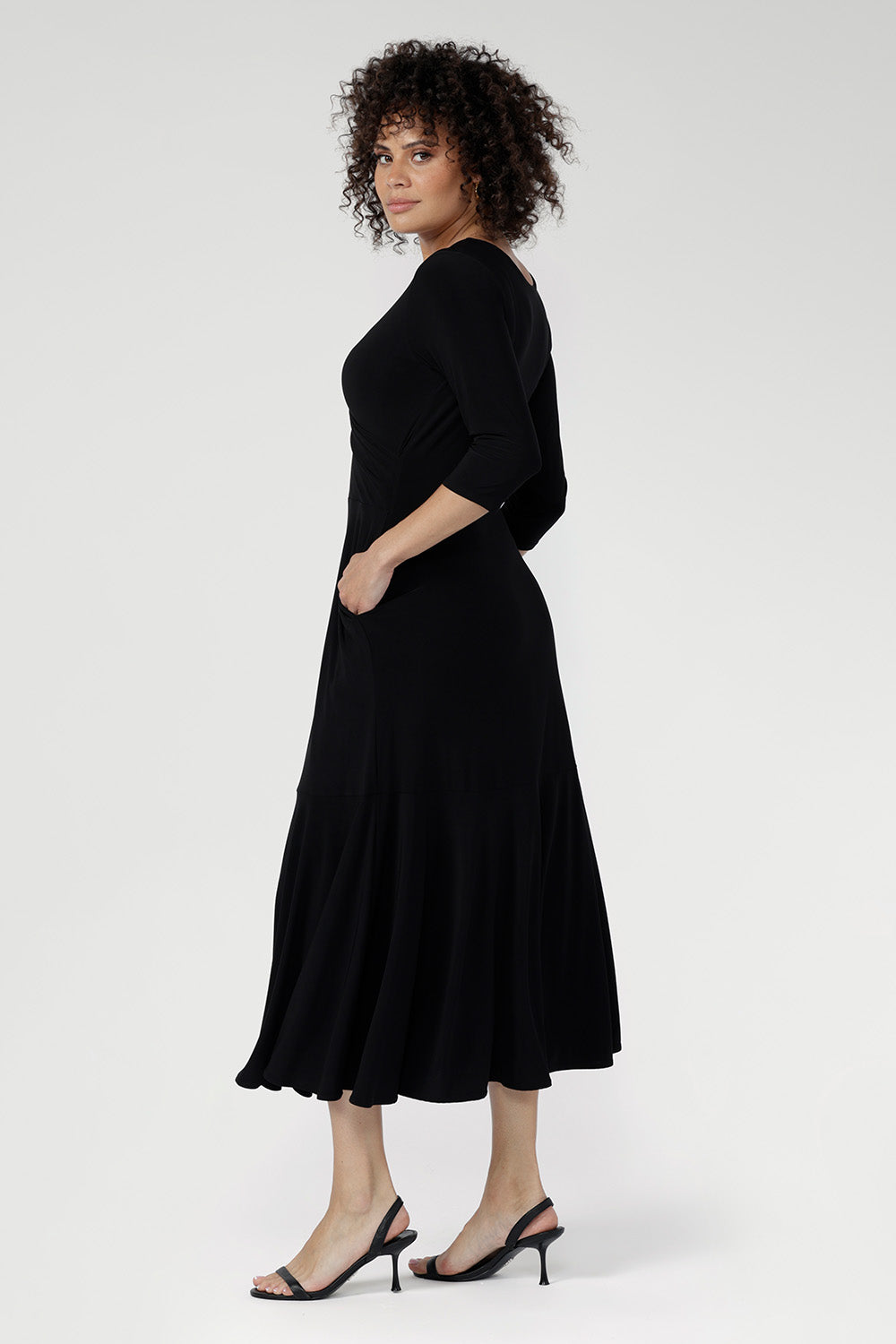 Size 18 woman wears a black reversible Bettina dress in black Jersey dress made in Australia. V-neck style with pockets and midi length. Made in Australia for women size 8 - 24. Reversible dress can be worn featuring boat neck or neck.