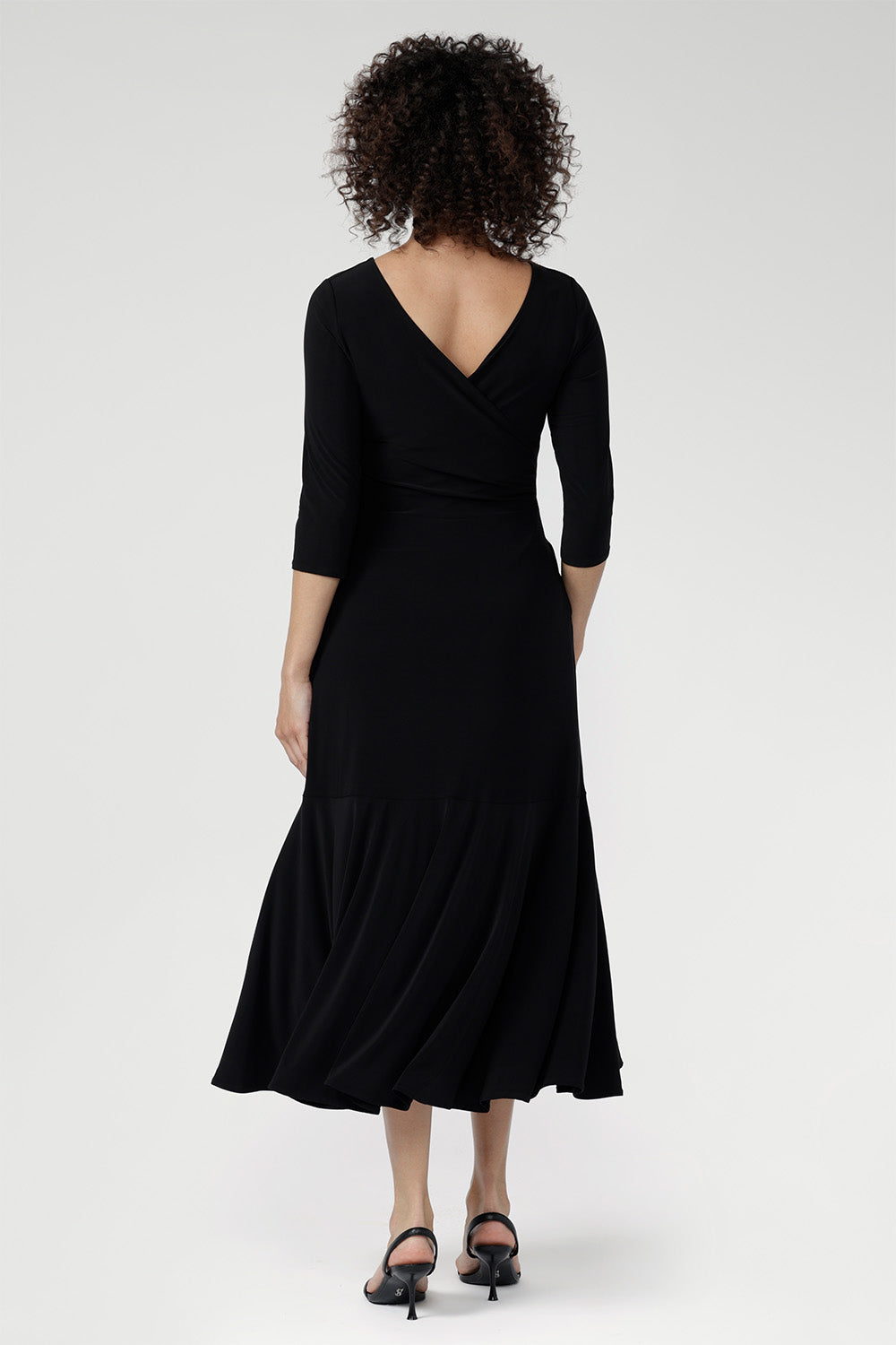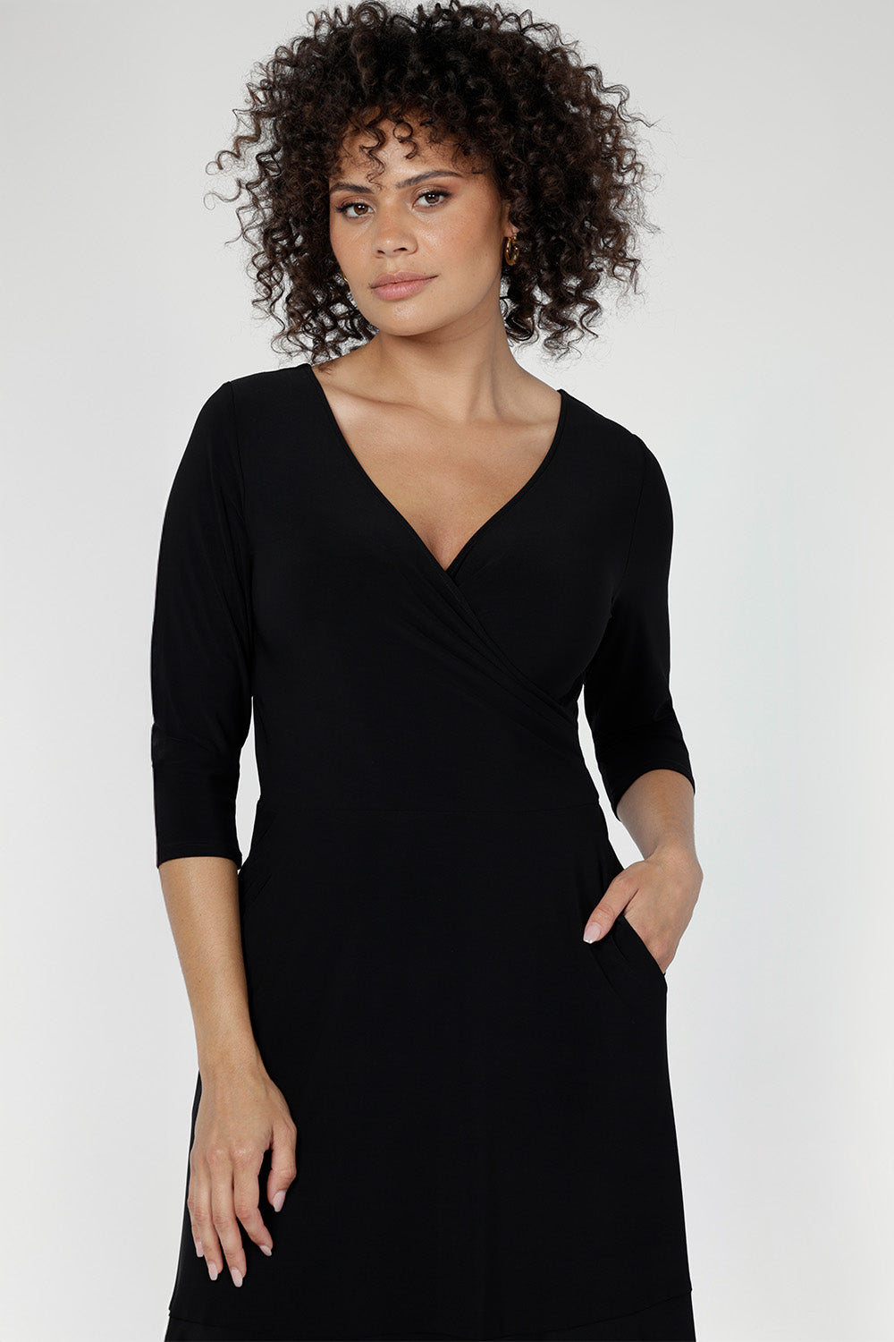Petite height woman wears Bettina Reversible Dress in Black with petrol coloured jacket. Australian made Jersey fixed wrap dress features a V-neck style with pockets and midi length. Made in Australia with petite height and plus size women in mind. Available in sizes 8-24.