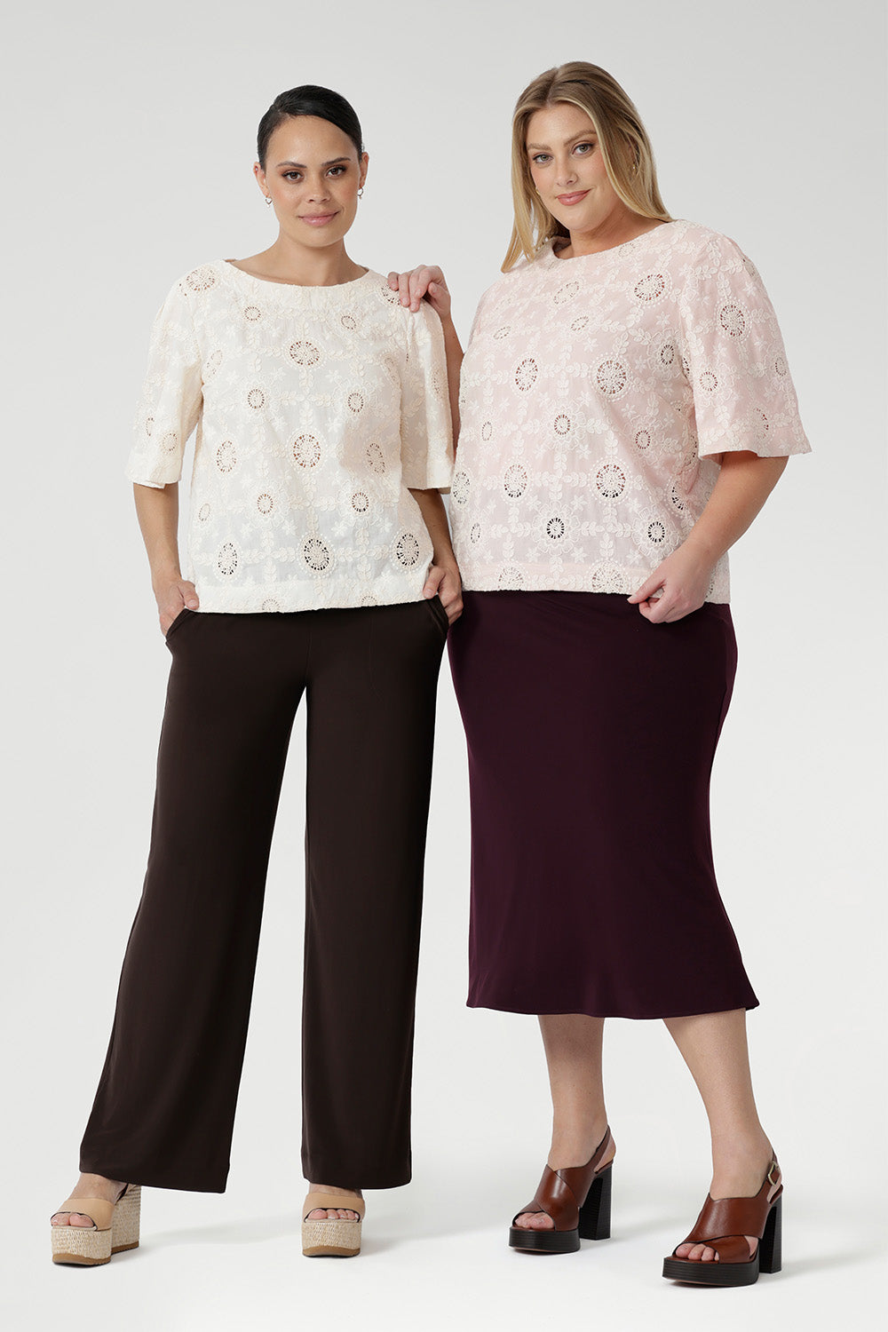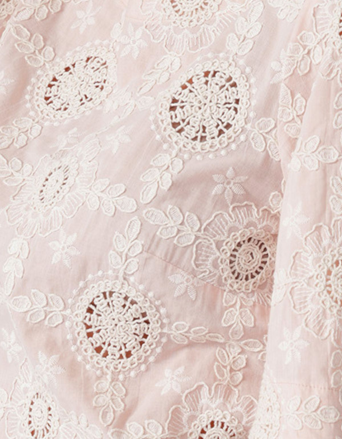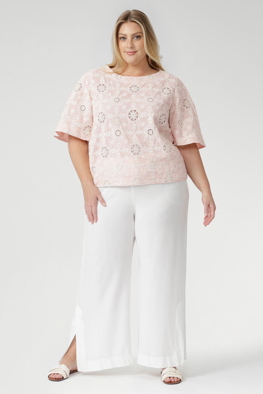 Crafted from lightweight embroidered cotton, the Angel Top in Ballet Embroidered Cotton is a fresh and feminine summer essential. Featuring delicate ivory embroidery on a soft powdered pink base, it’s designed in a relaxed silhouette with a round neckline, topstitch detailing, and flared short sleeves finished with a subtle pleat. Exquisite botanical motifs and cut-out accents add artisanal charm to this breathable, easy-to-wear style. Pair with linen pants or the coordinating skirt for effortless summer elegance. Made in Australia with integrity.